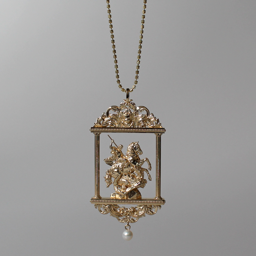 The golden archway, covered in decorative scrolls, frames a scene of a knight on horseback driving his weapon into the mouth of a dragon.