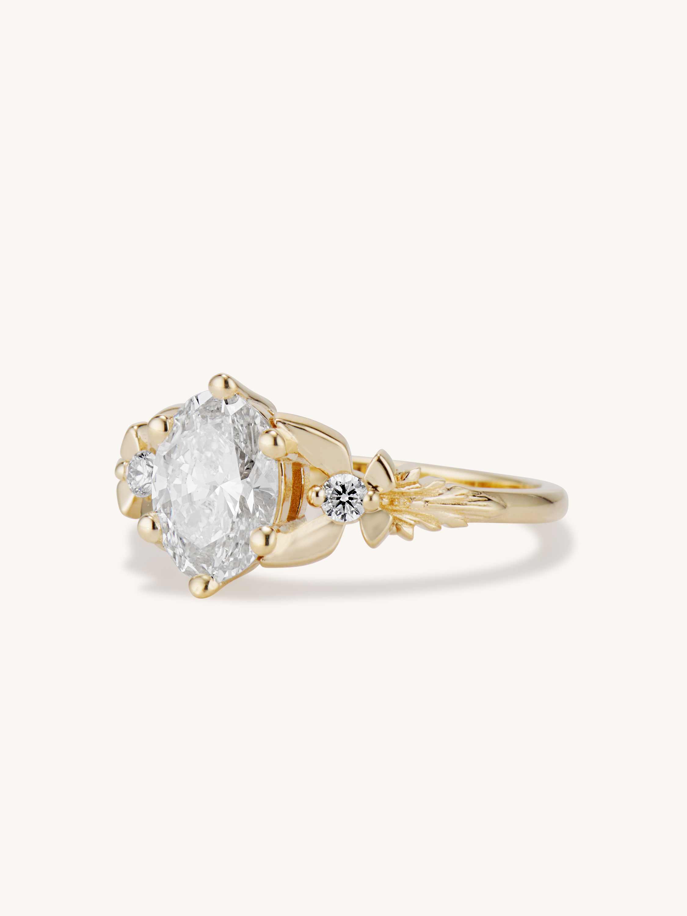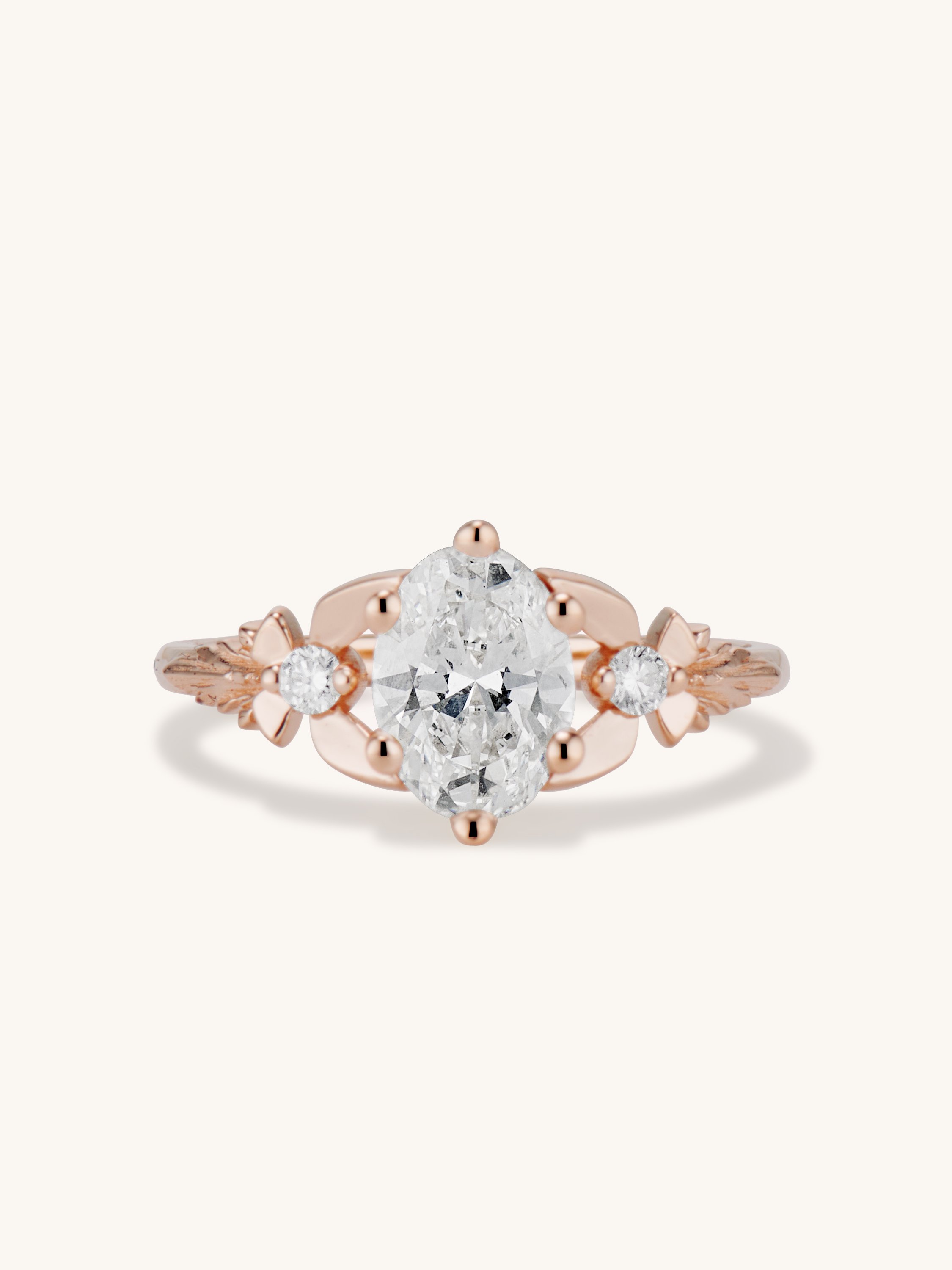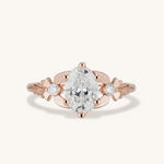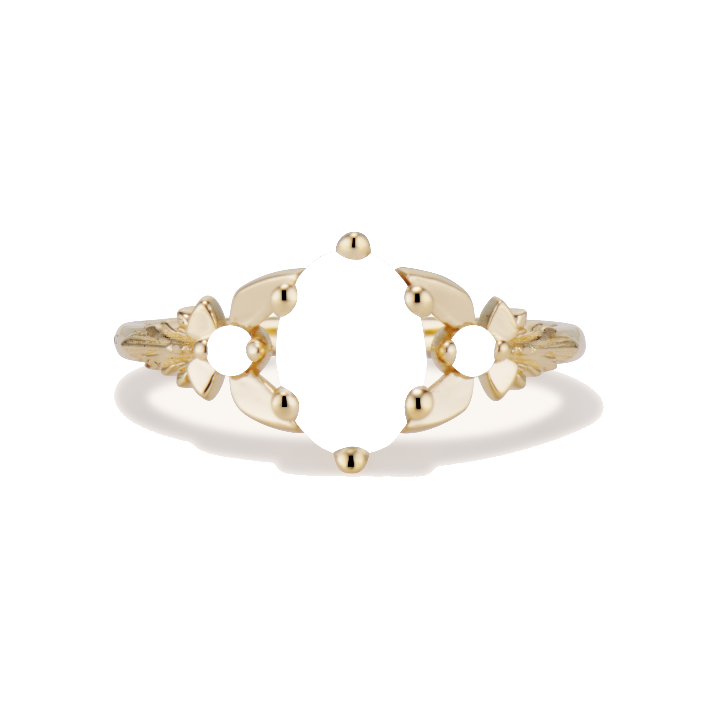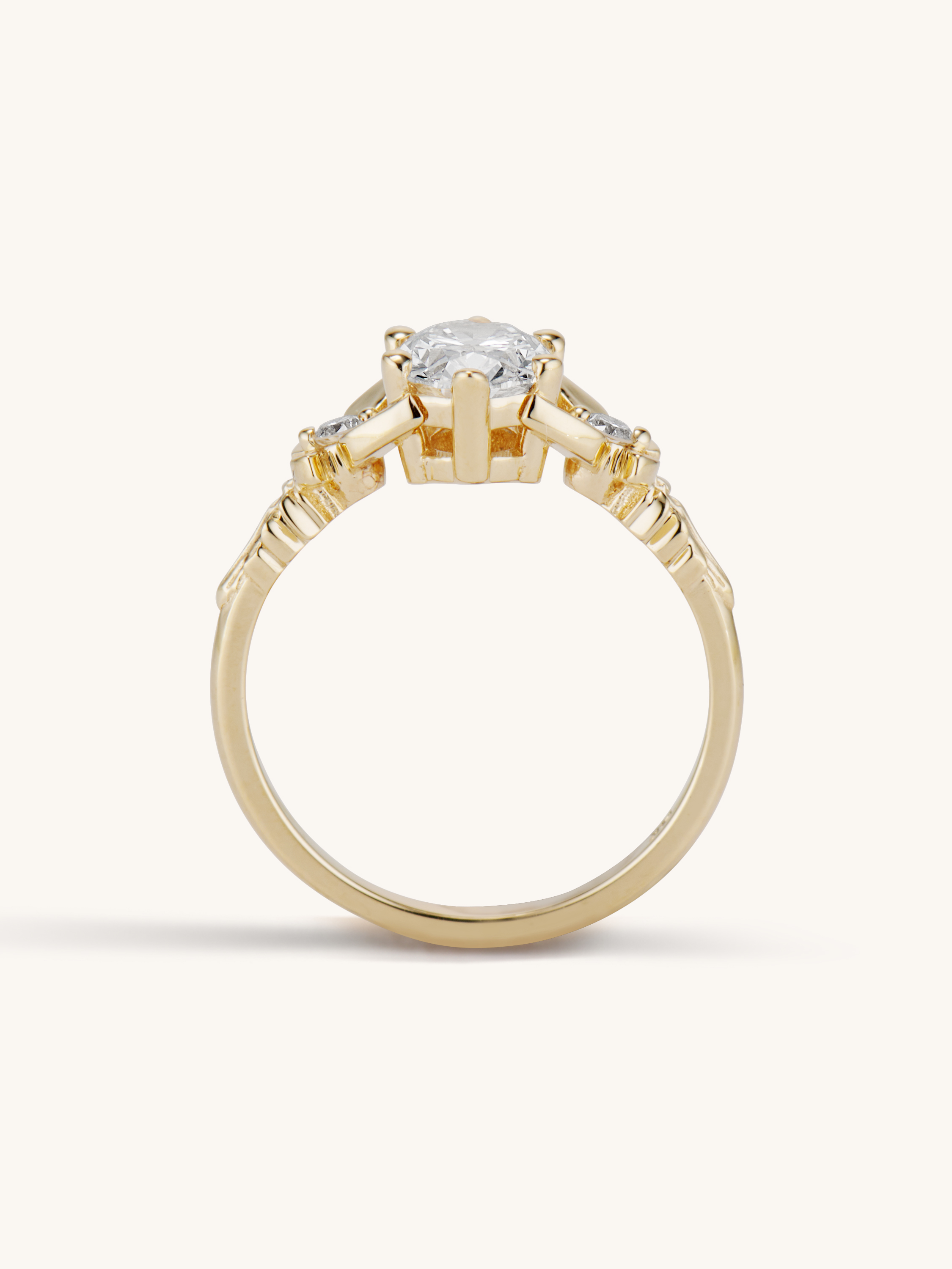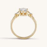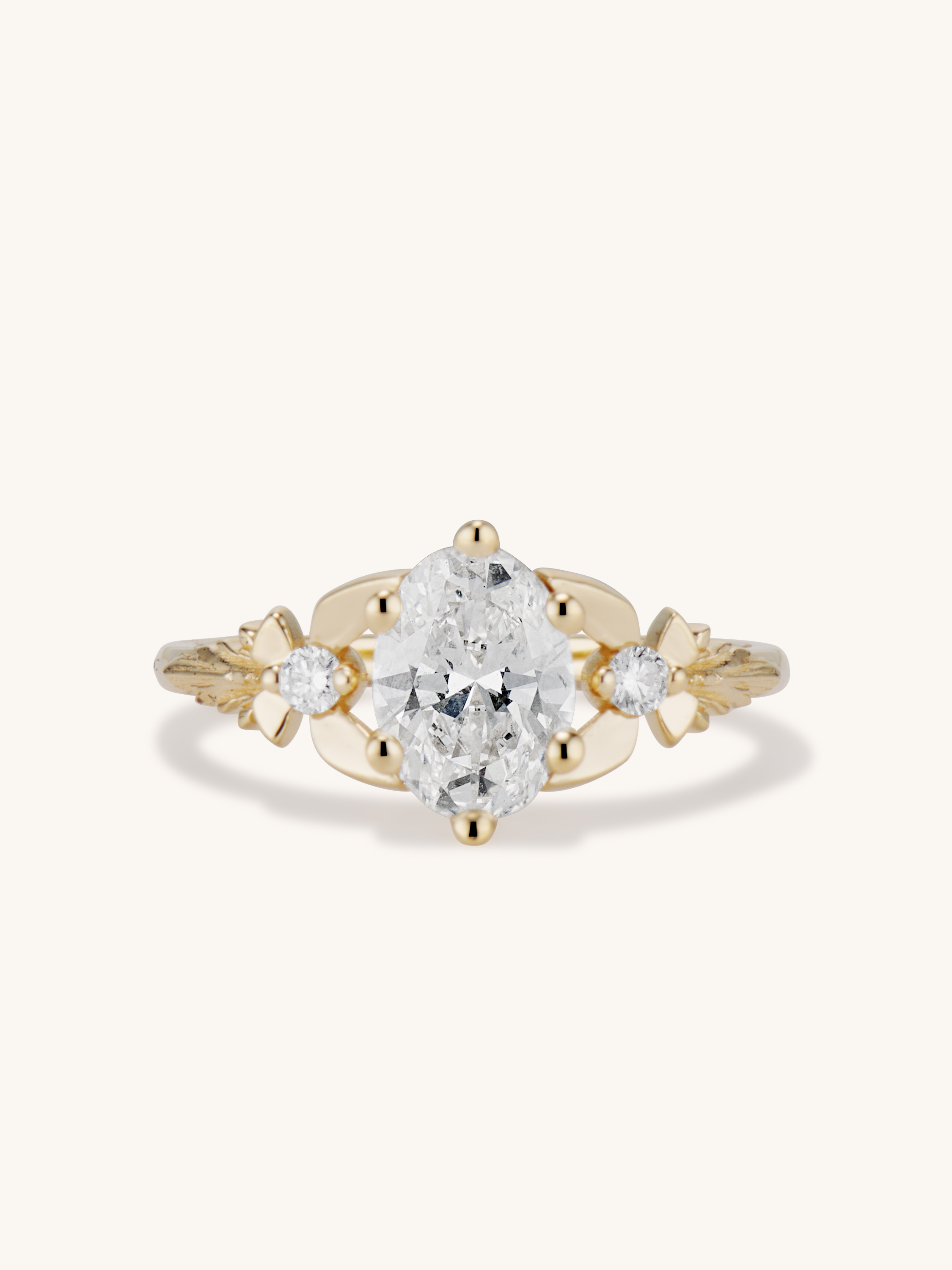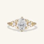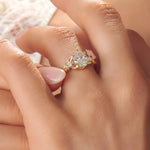 This delicate beauty is my Zelda inspired take on the classic three stone engagement ring. The center 1 carat oval brilliant cut diamond appears to magically float between two fairies with diamond bodies and golden wings. A timeless, traditional style with a tastefully geeky twist!