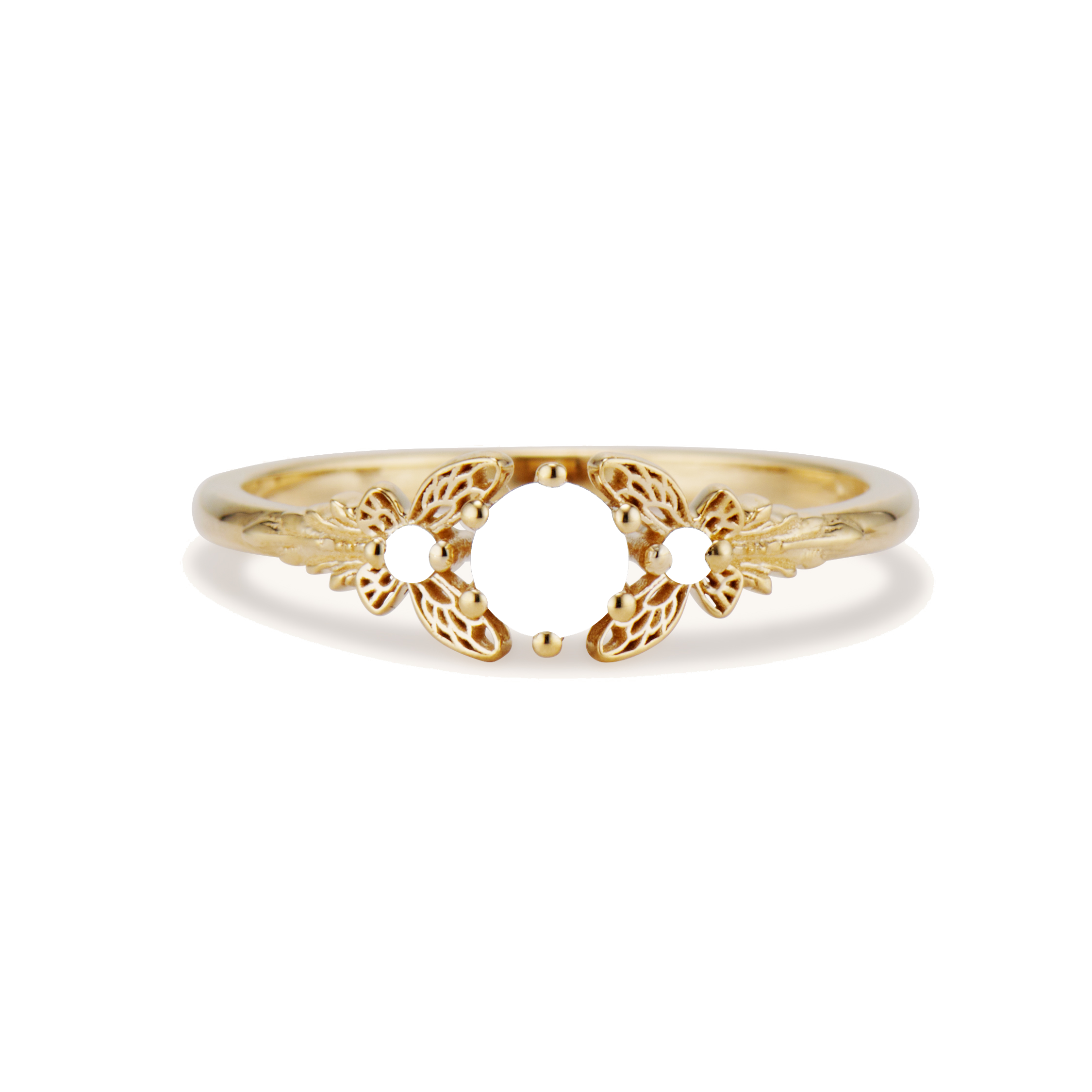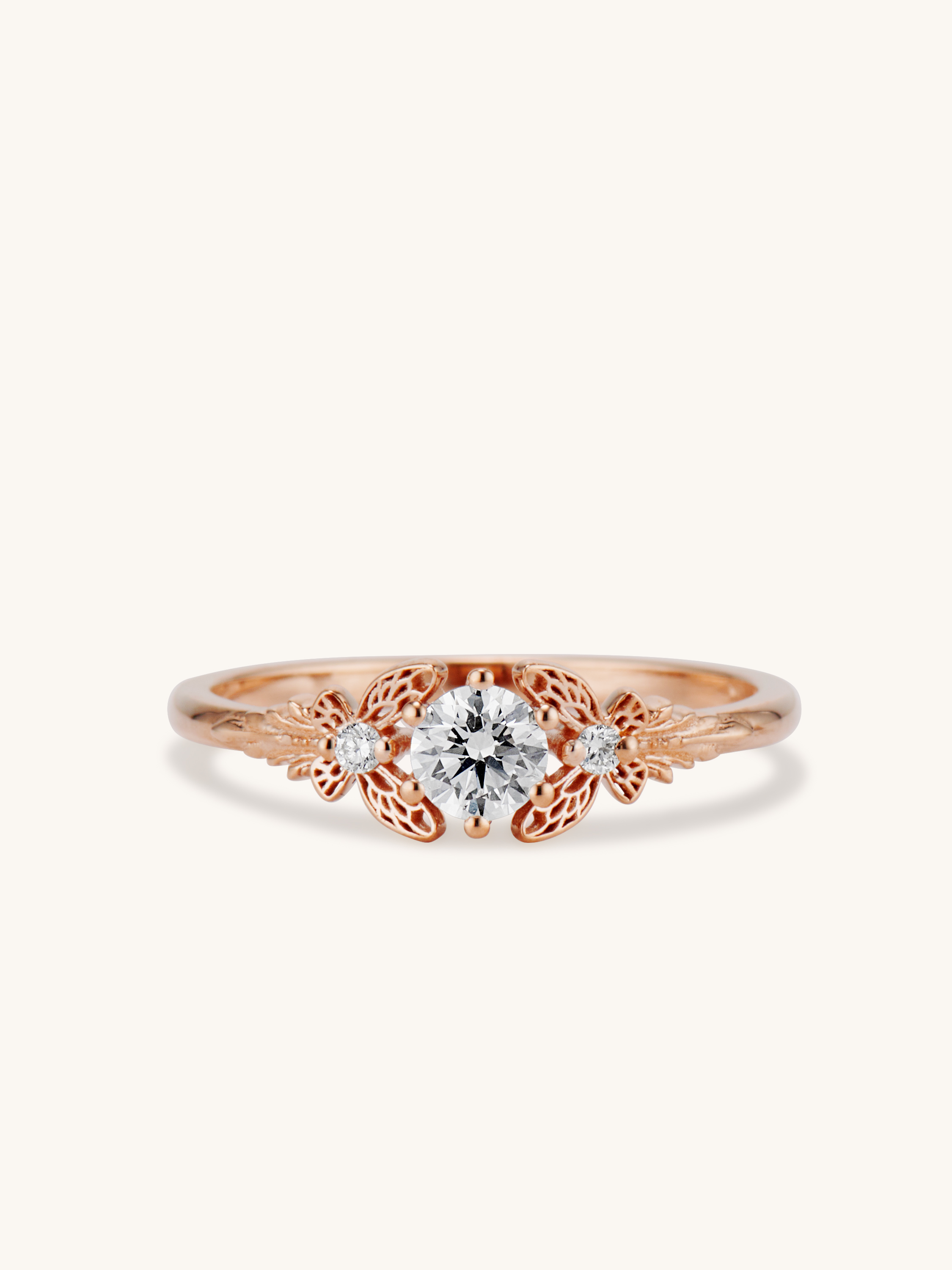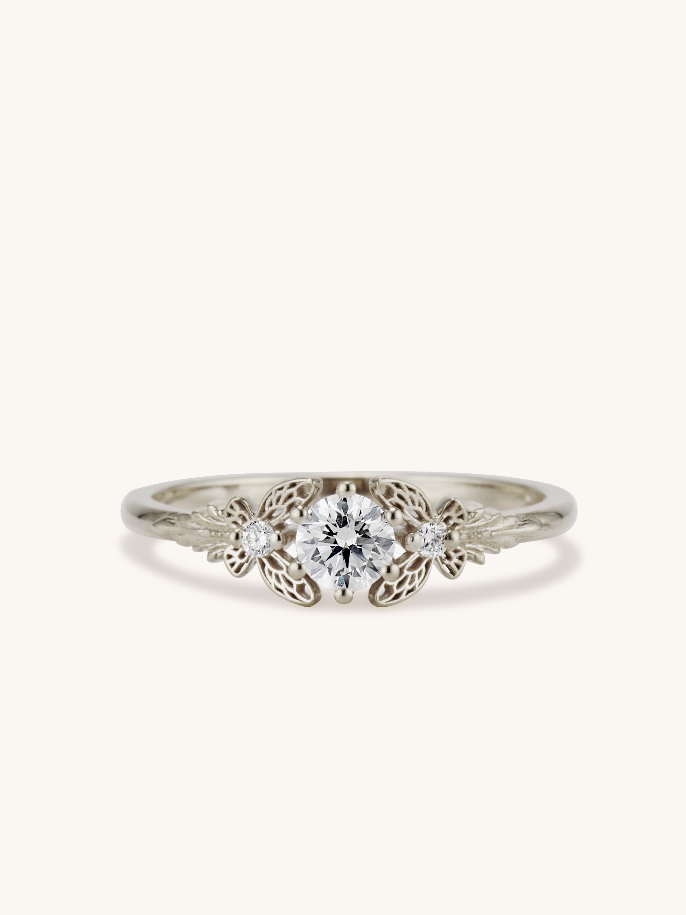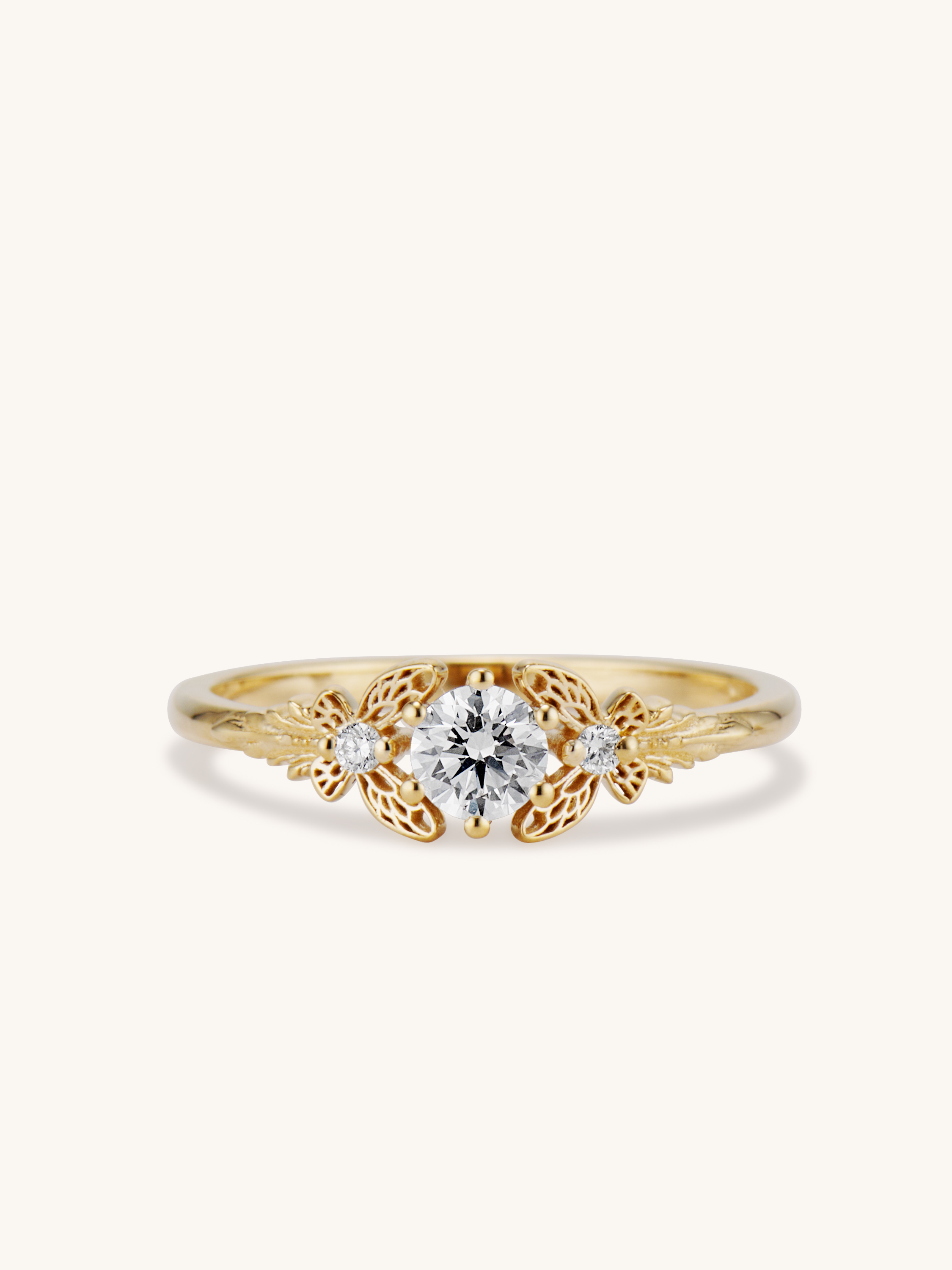 This delicate beauty is my Zelda inspired take on the classic three stone engagement ring. The center 0.25 carat round brilliant cut diamond appears to magically float between two fairies with diamond bodies and golden wings. A timeless, traditional style with a tastefully geeky twist!