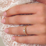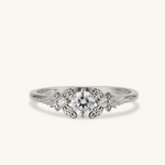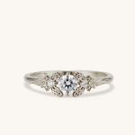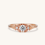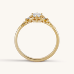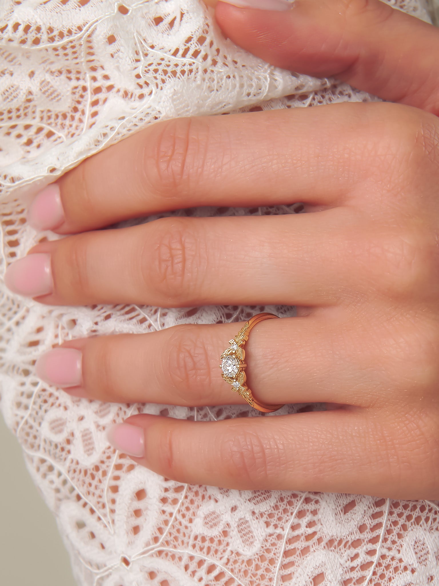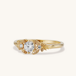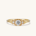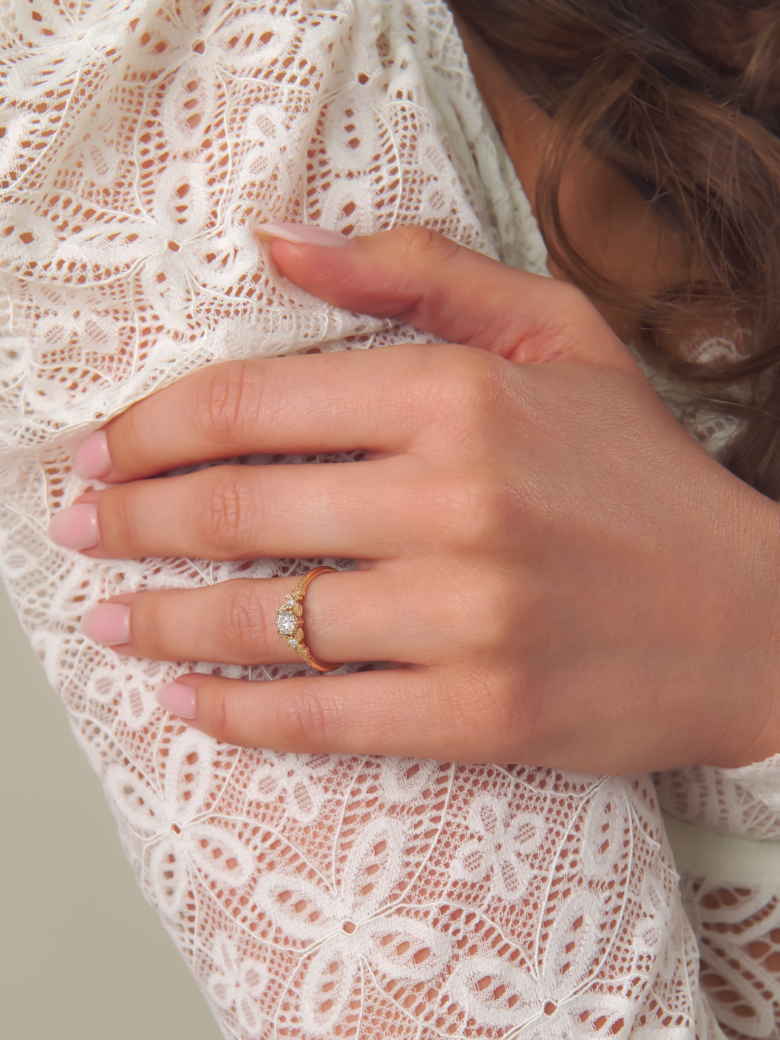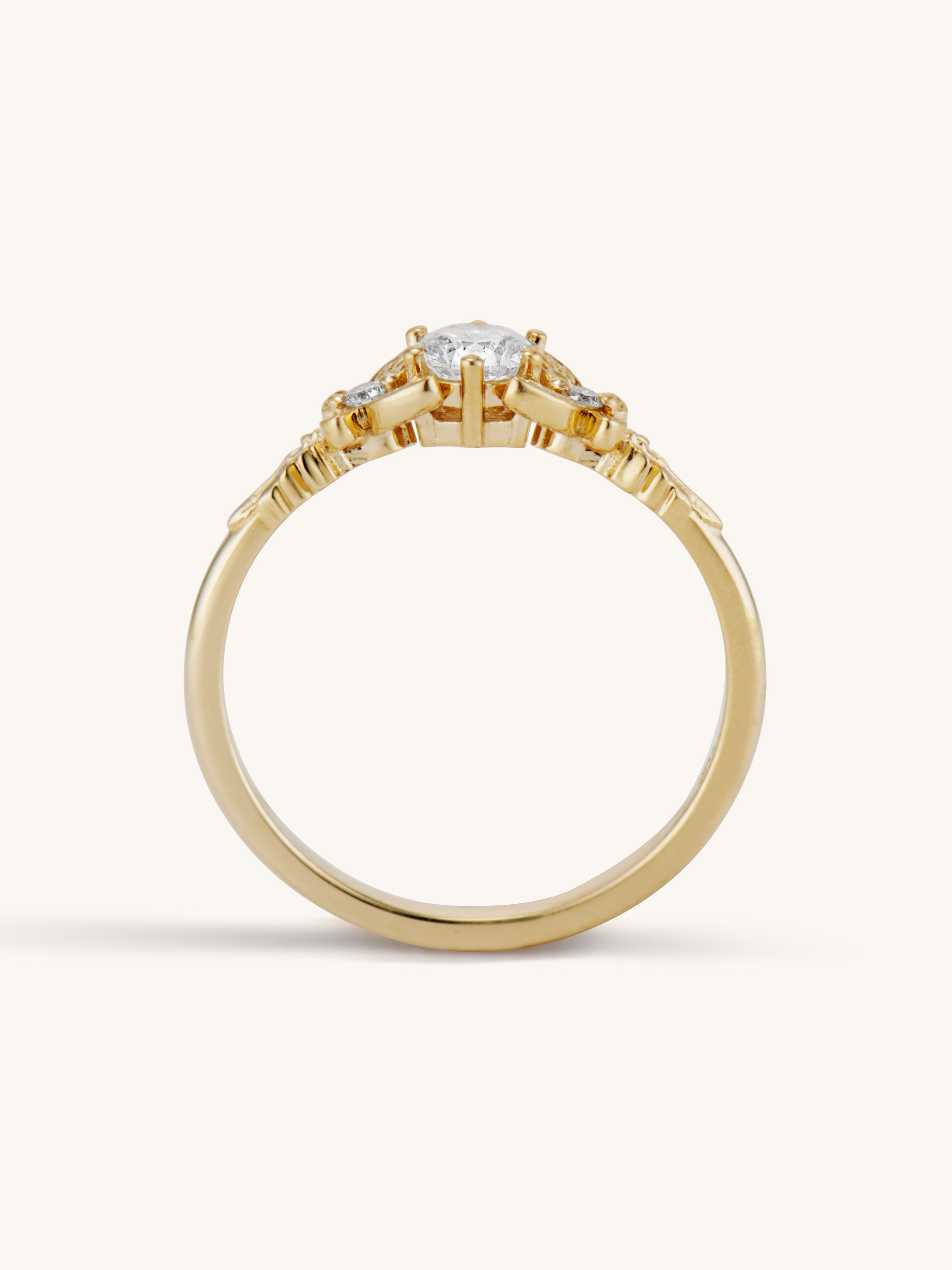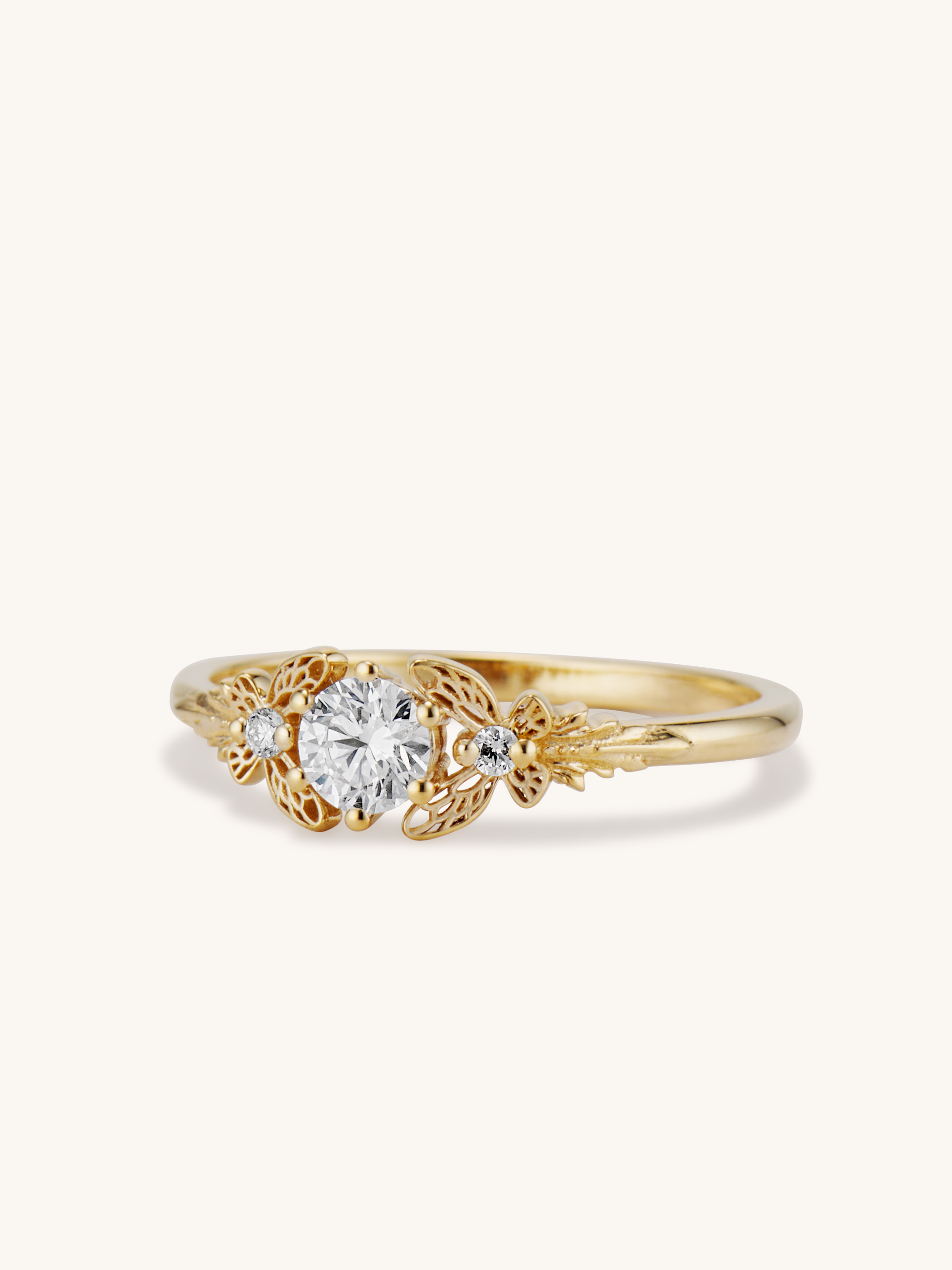 This delicate beauty is my Zelda inspired take on the classic three stone engagement ring. The center 0.25 carat round brilliant cut diamond appears to magically float between two fairies with diamond bodies and golden wings. A timeless, traditional style with a tastefully geeky twist!