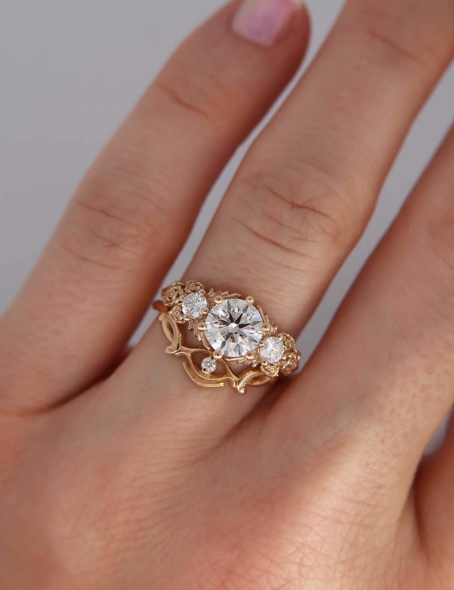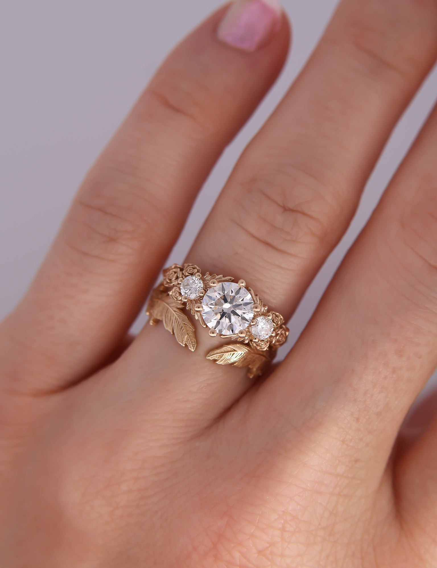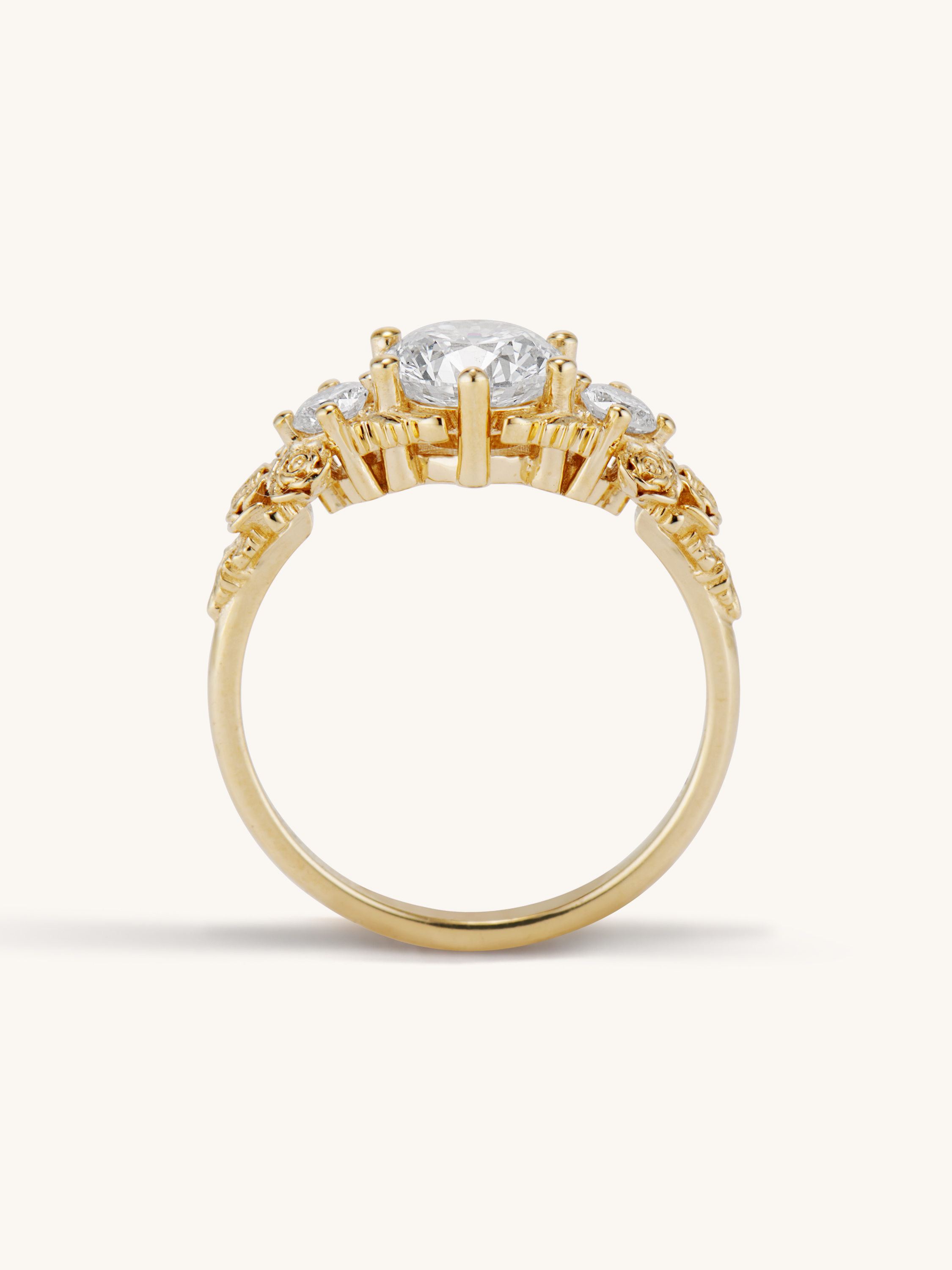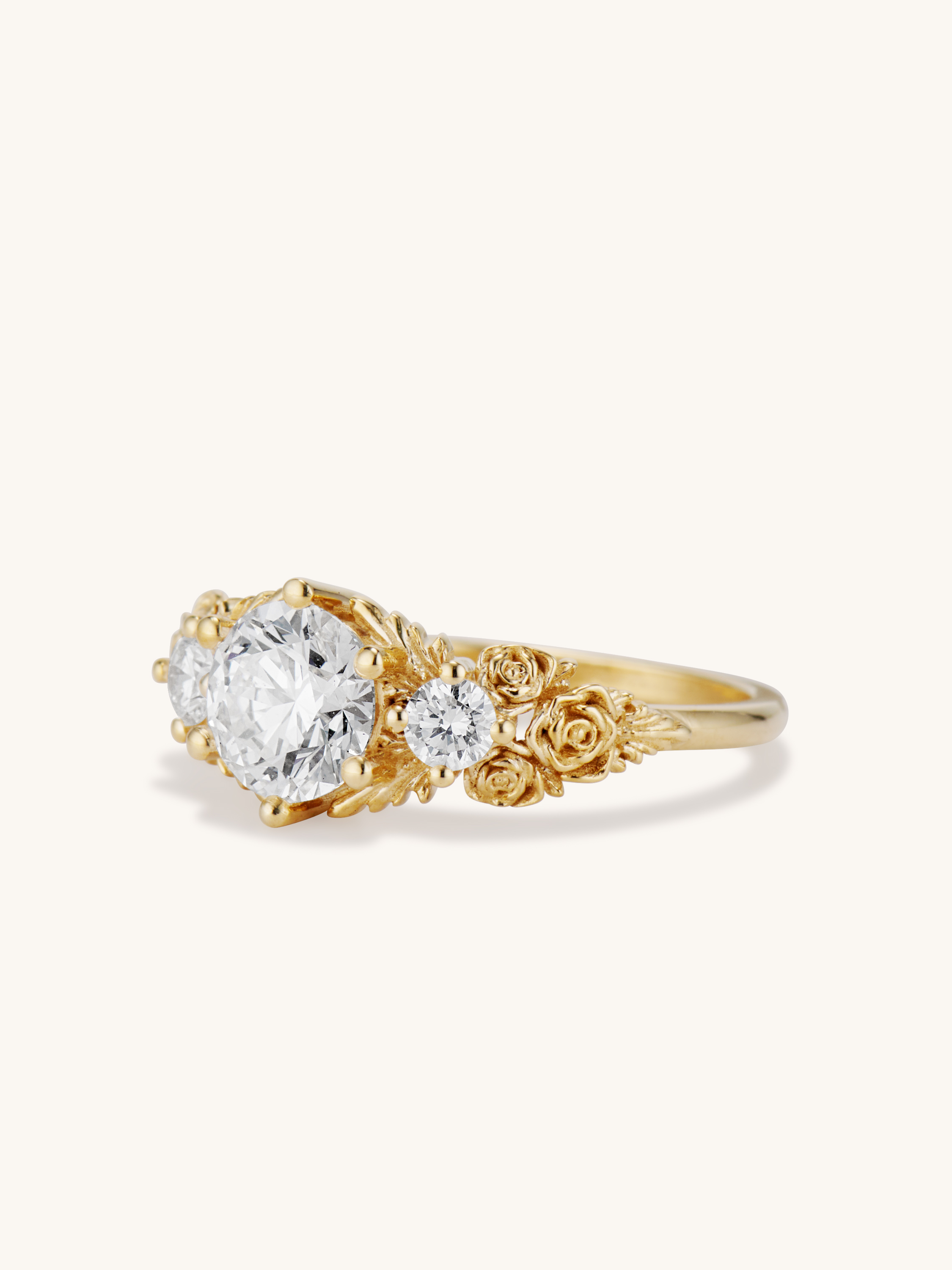 Inspired by gold roses in the Animal Crossing series, this ring features a 1 carat round brilliant cut diamond and accent diamonds surrounded by golden leaves and golden roses in clusters of three, just as they appear in the games.
