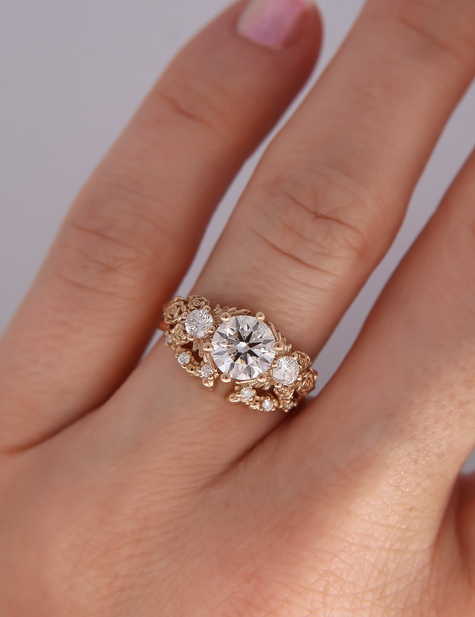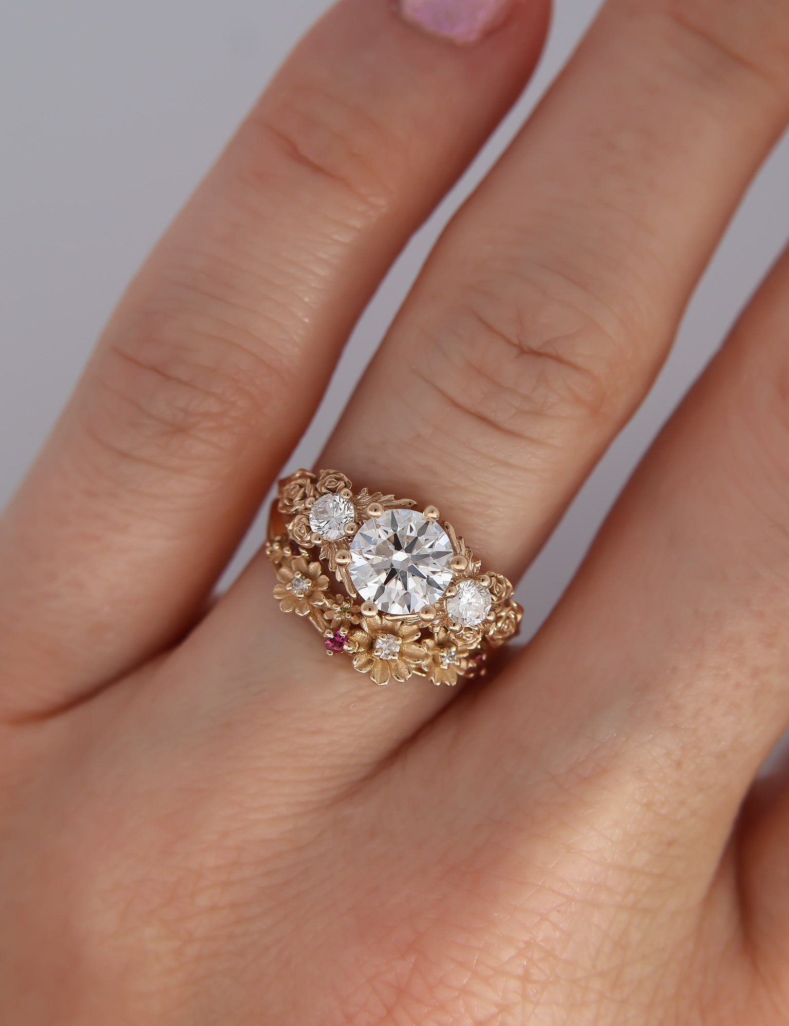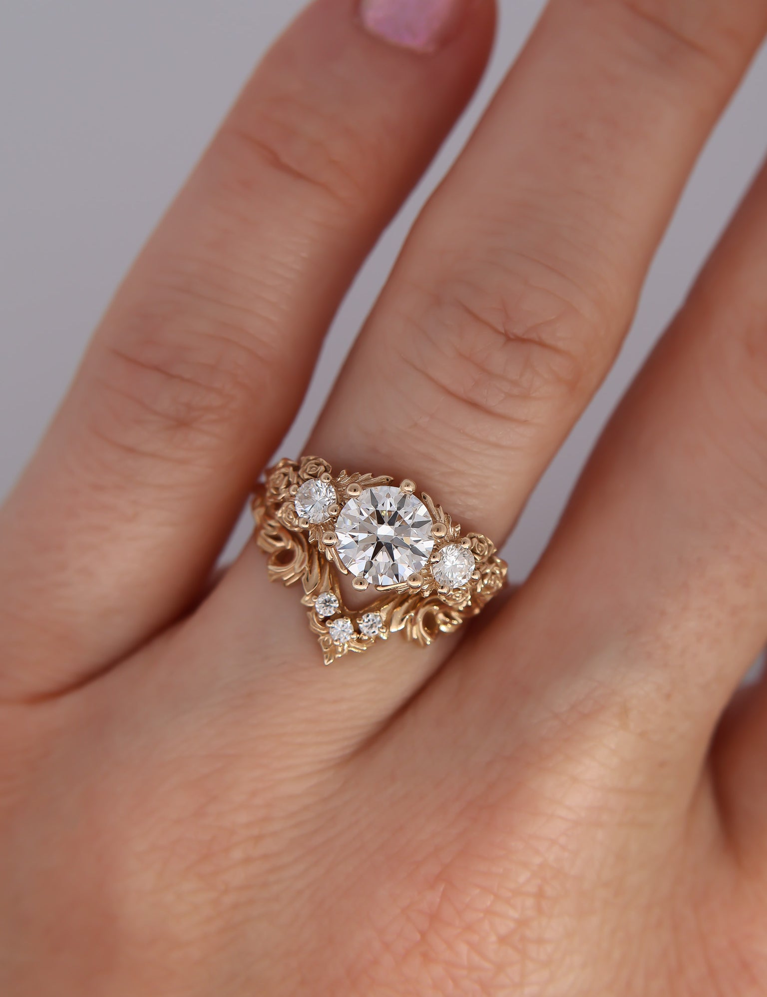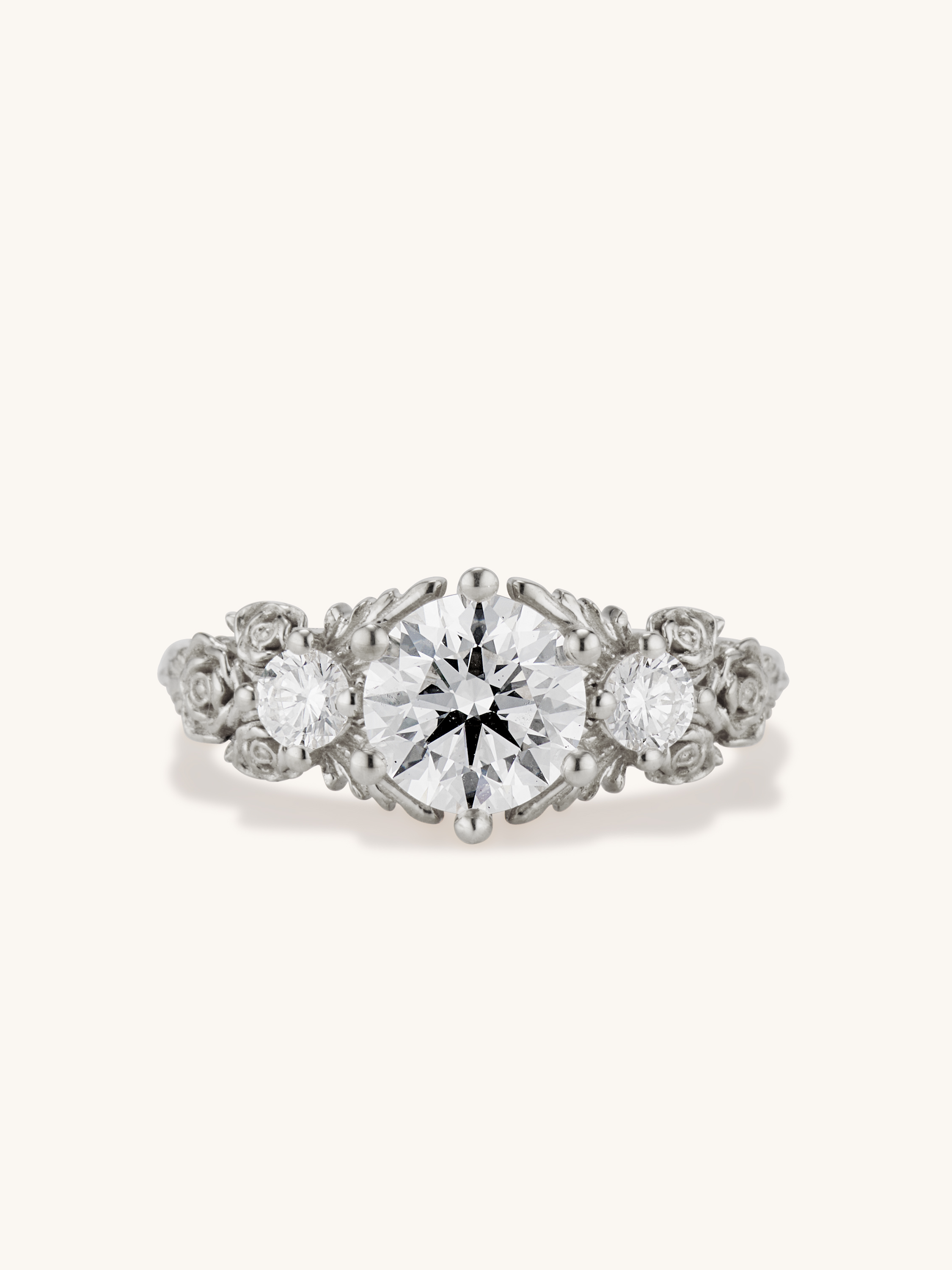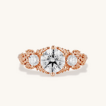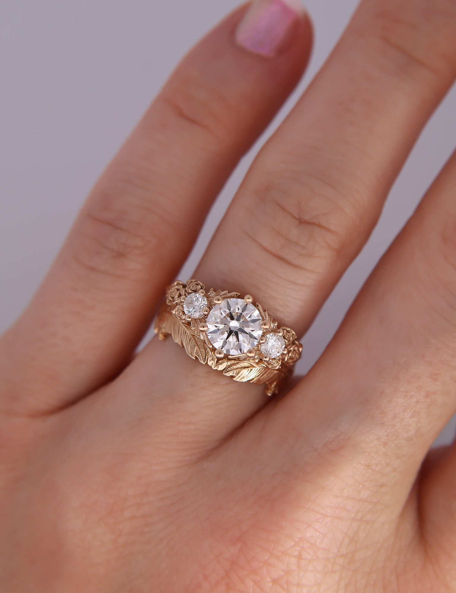 Inspired by gold roses in the Animal Crossing series, this ring features a 1 carat round brilliant cut diamond and accent diamonds surrounded by golden leaves and golden roses in clusters of three, just as they appear in the games.