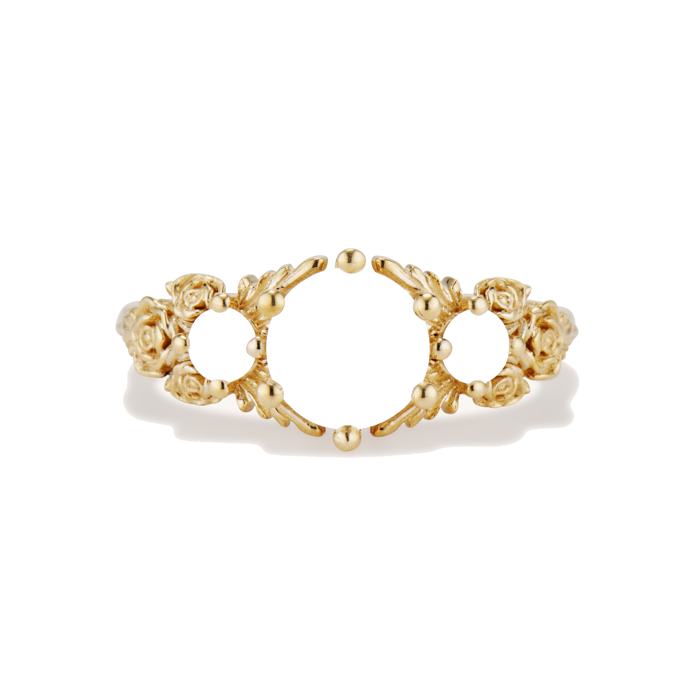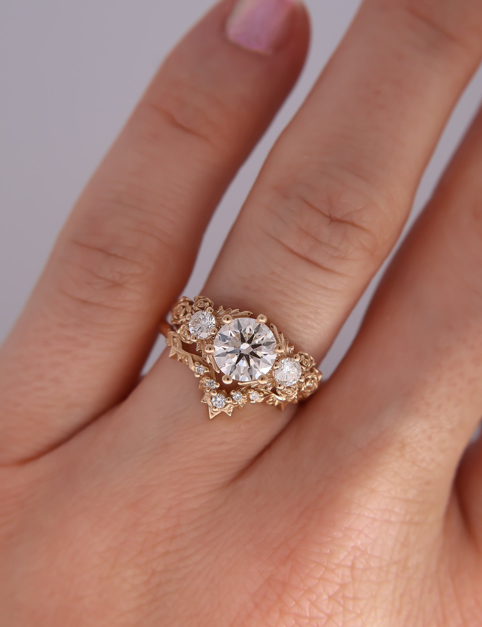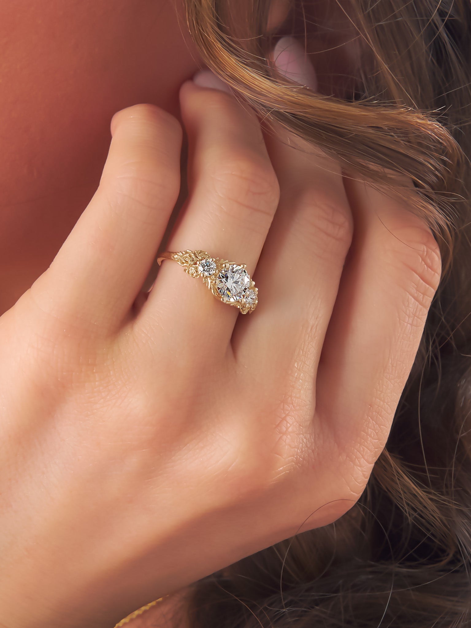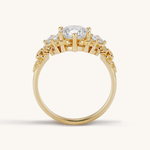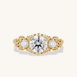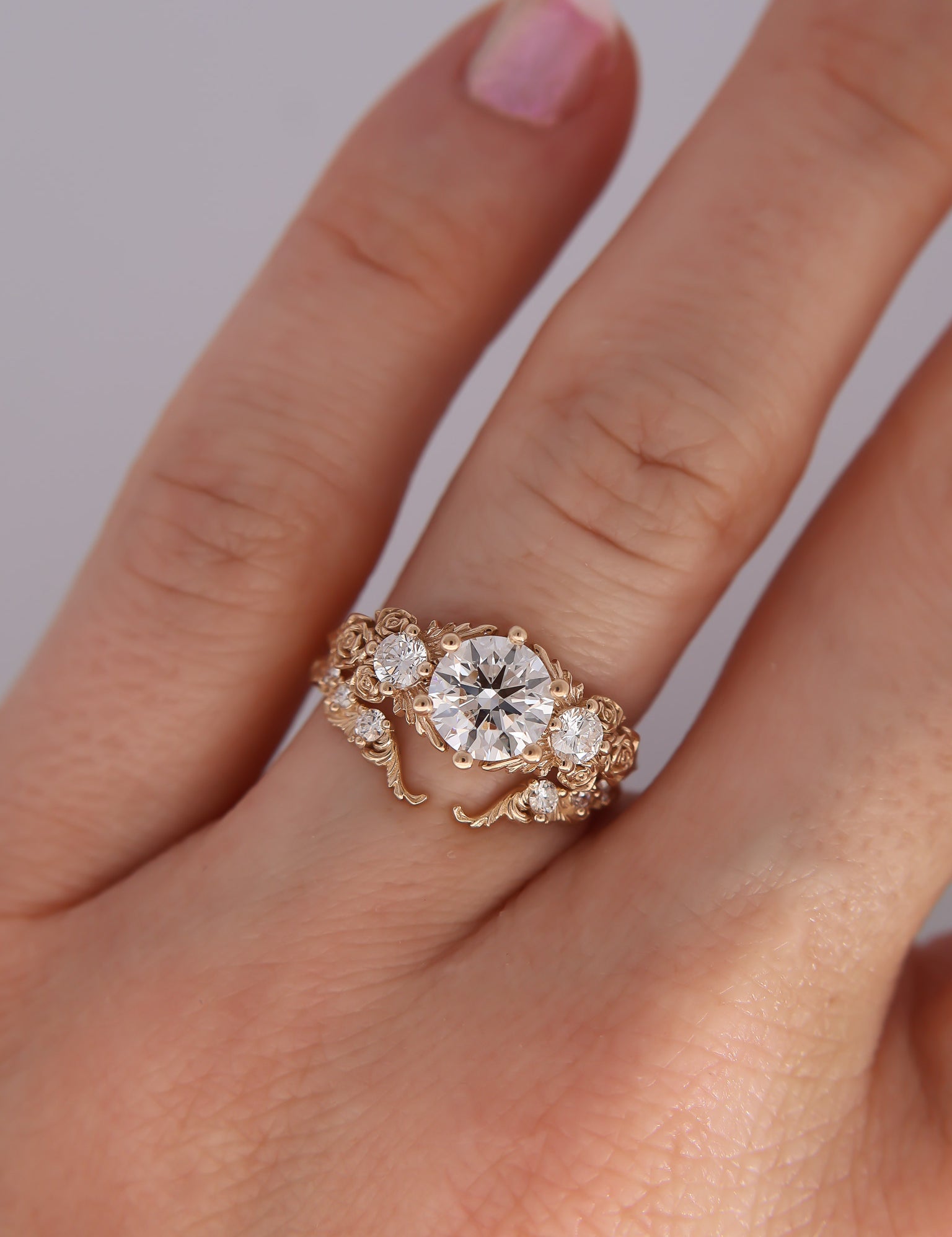 Inspired by gold roses in the Animal Crossing series, this ring features a 1 carat round brilliant cut diamond and accent diamonds surrounded by golden leaves and golden roses in clusters of three, just as they appear in the games.