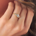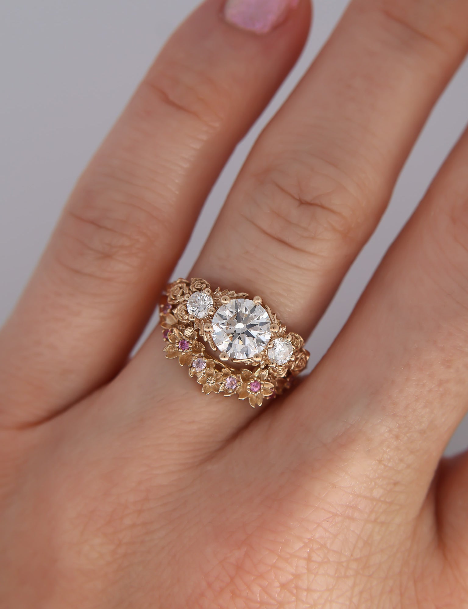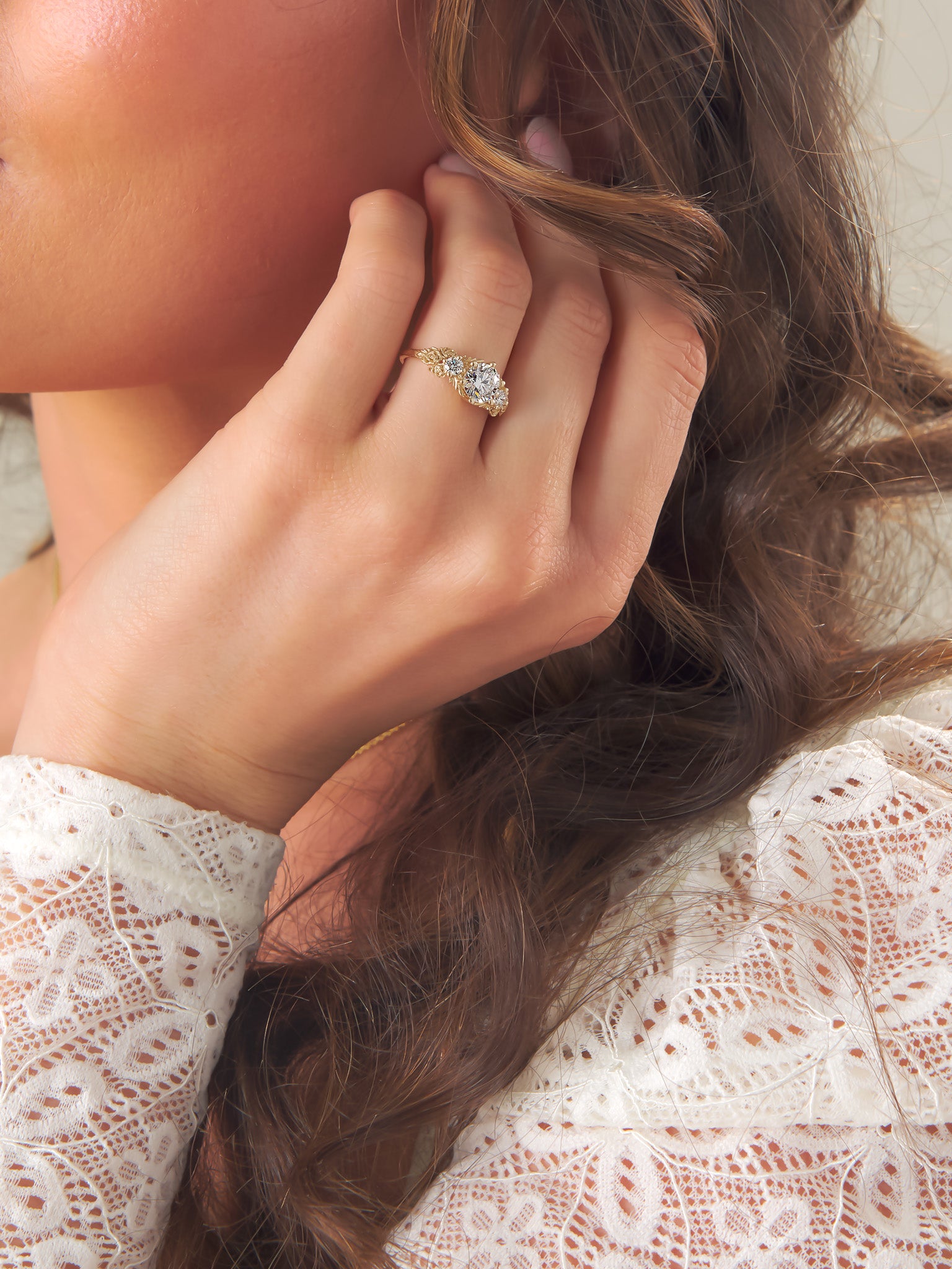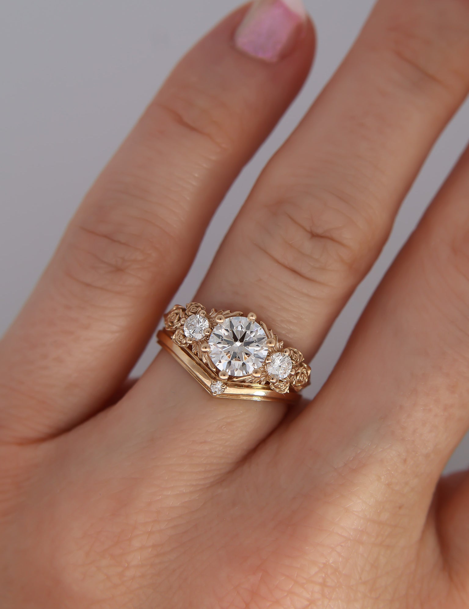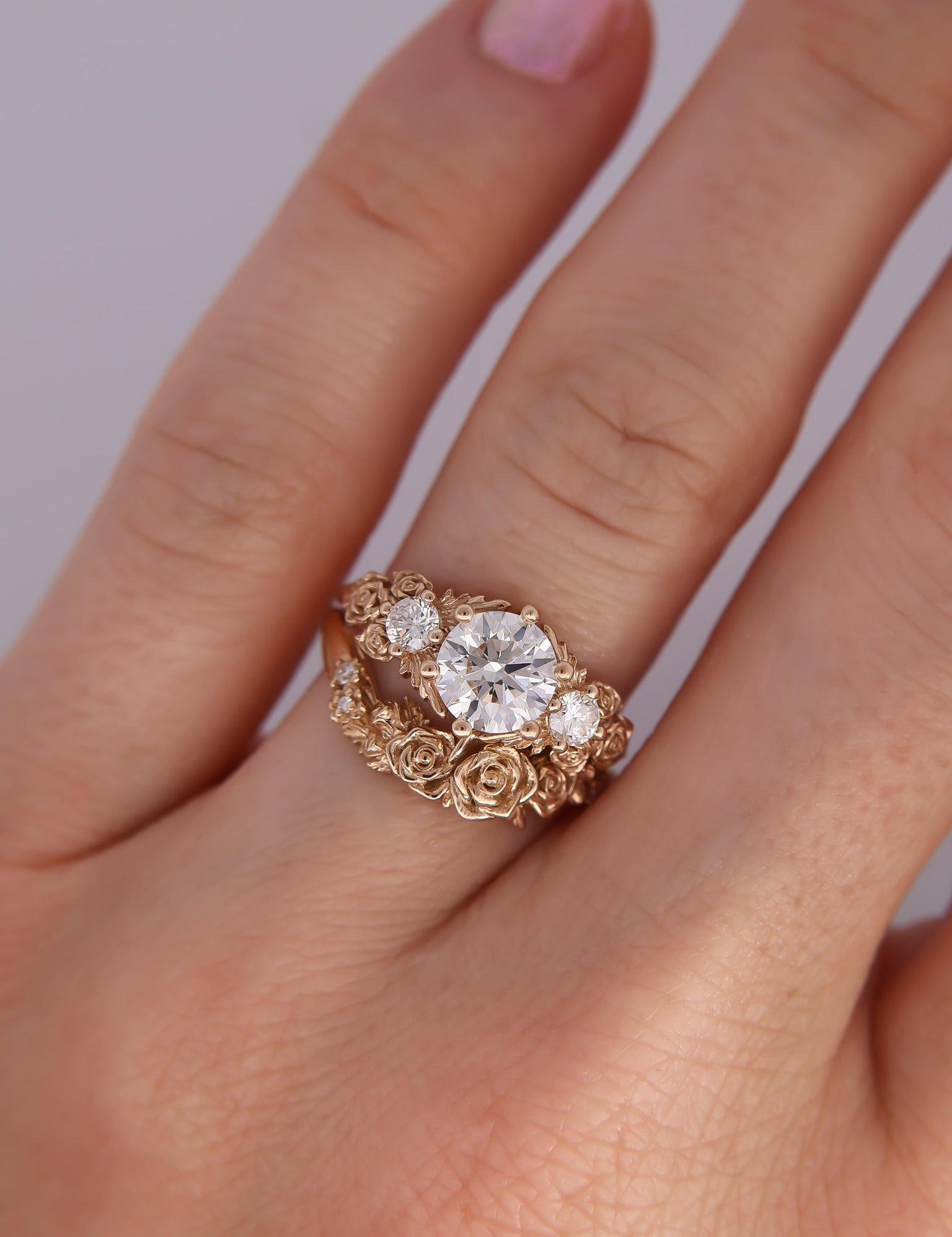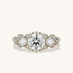 Inspired by gold roses in the Animal Crossing series, this ring features a 1 carat round brilliant cut diamond and accent diamonds surrounded by golden leaves and golden roses in clusters of three, just as they appear in the games.