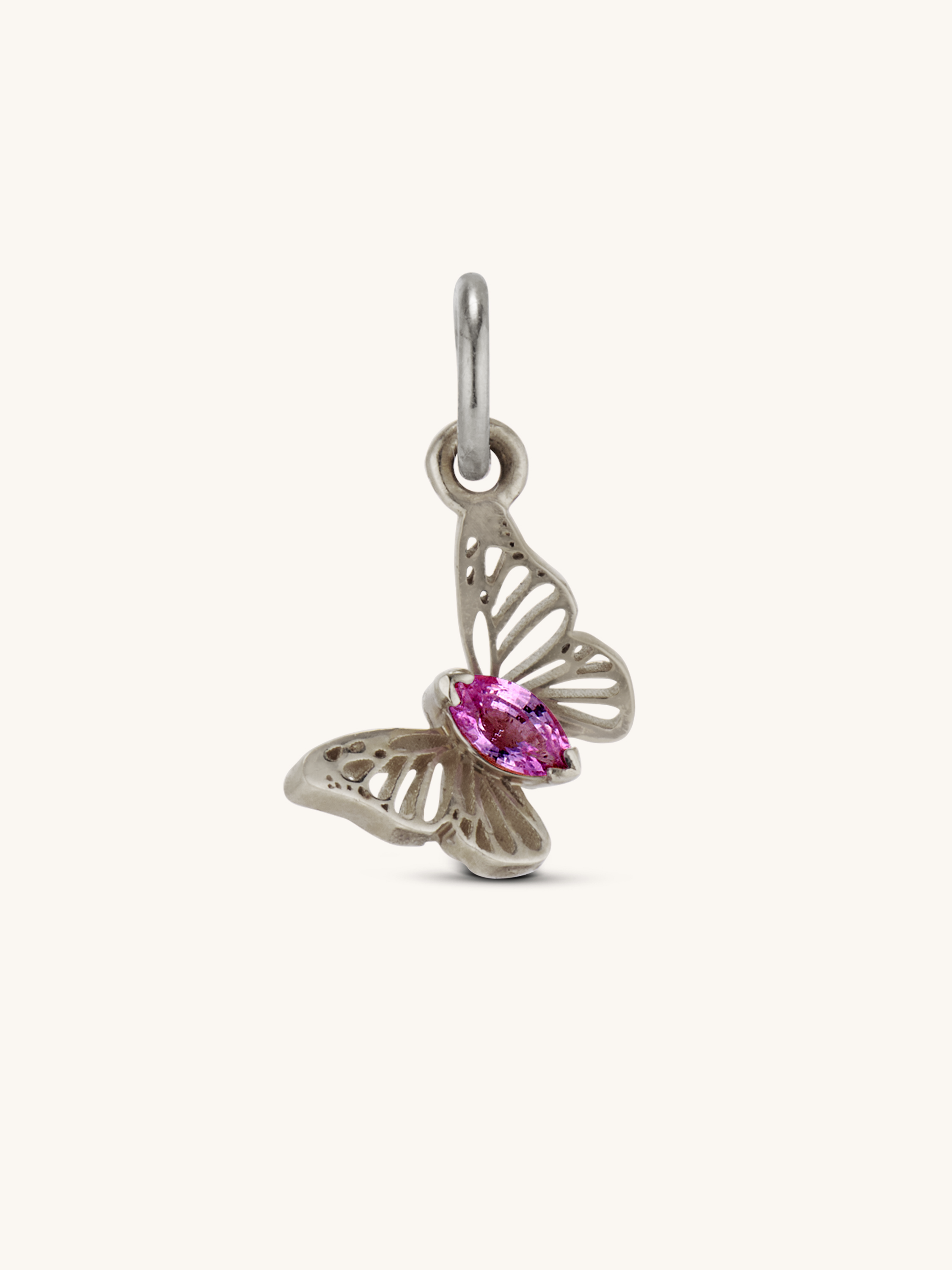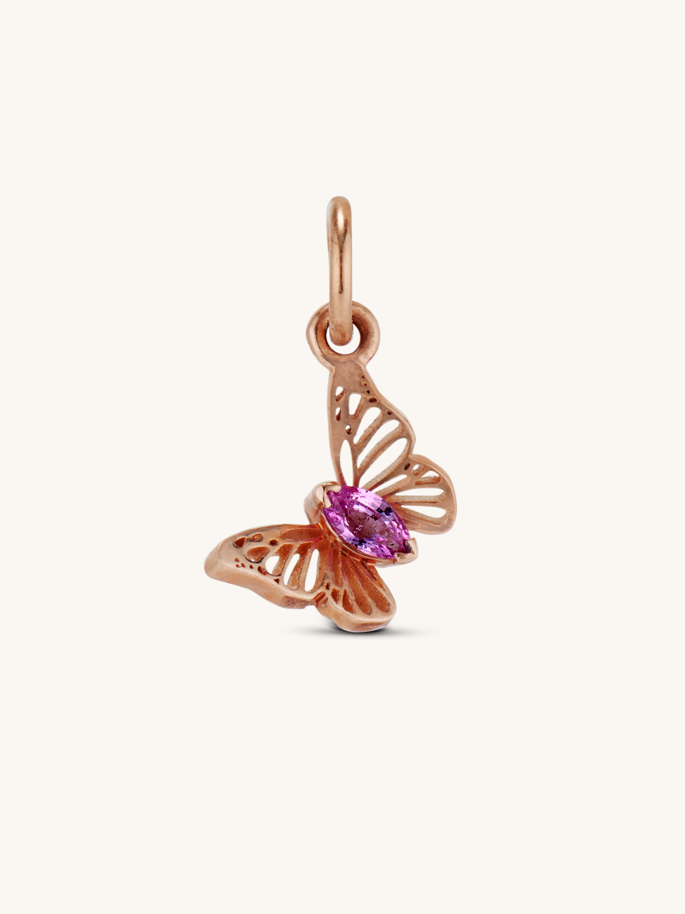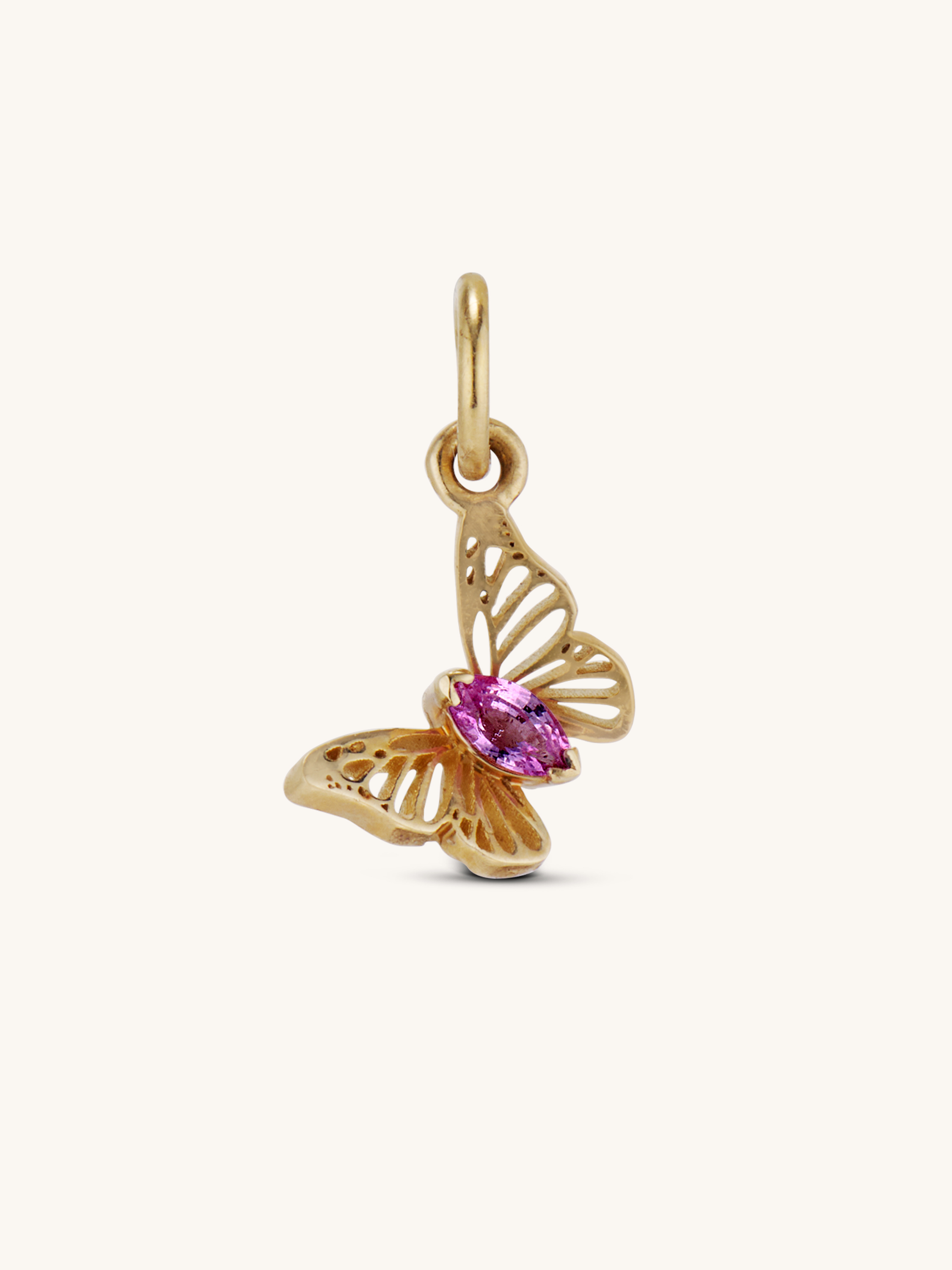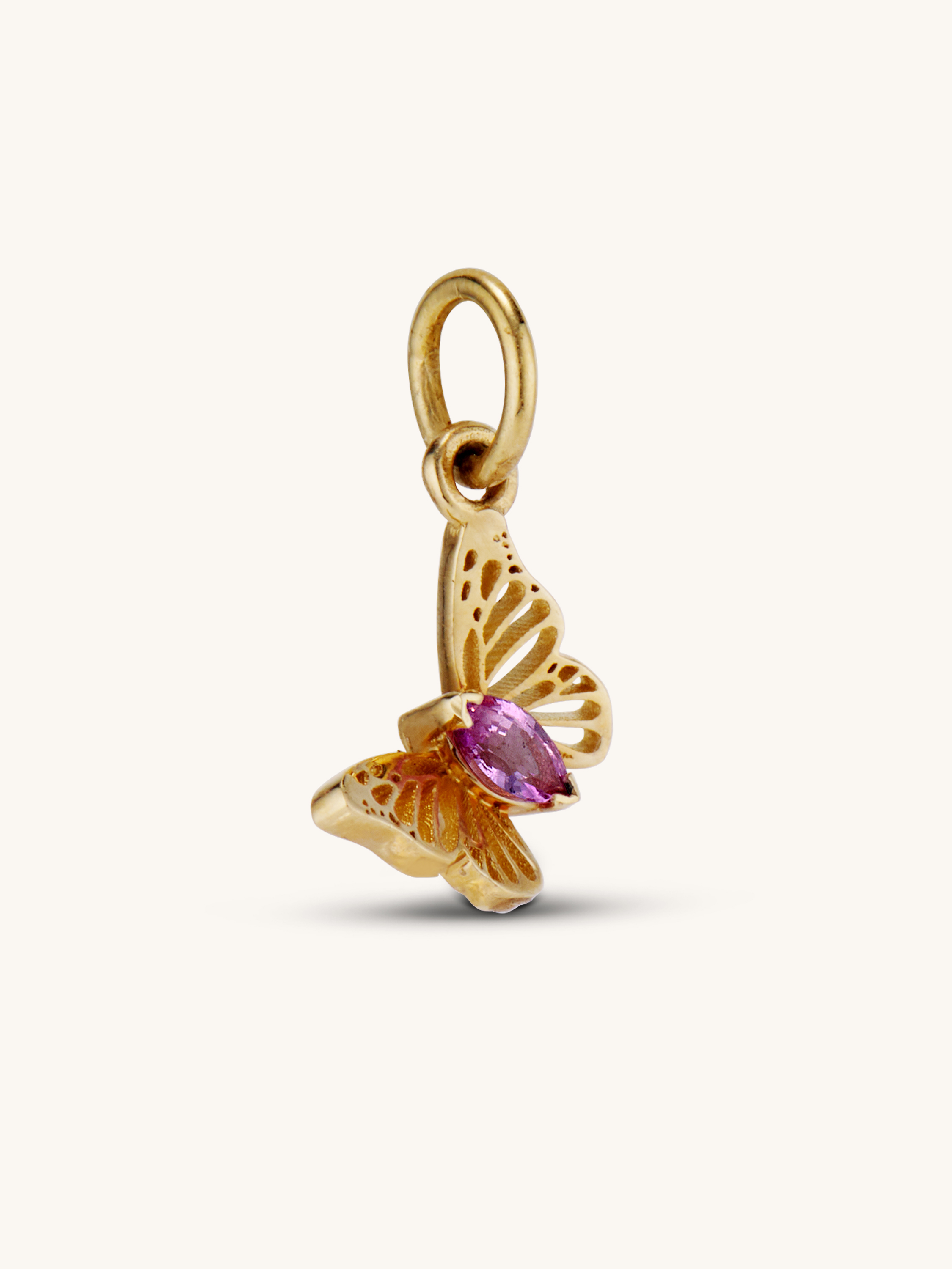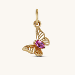 One of my favorite things in Animal Crossing is planting flowers, watering them until they fully bloom, and then seeing all of the butterflies gather to enjoy your hard work! This adorable charm features an intricate golden butterfly with a pink sapphire body.