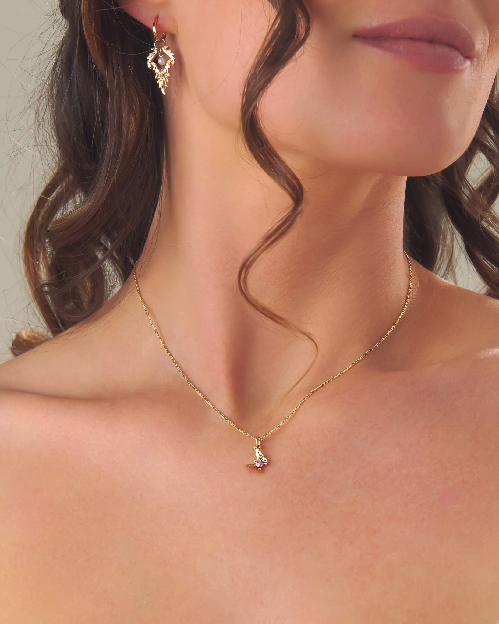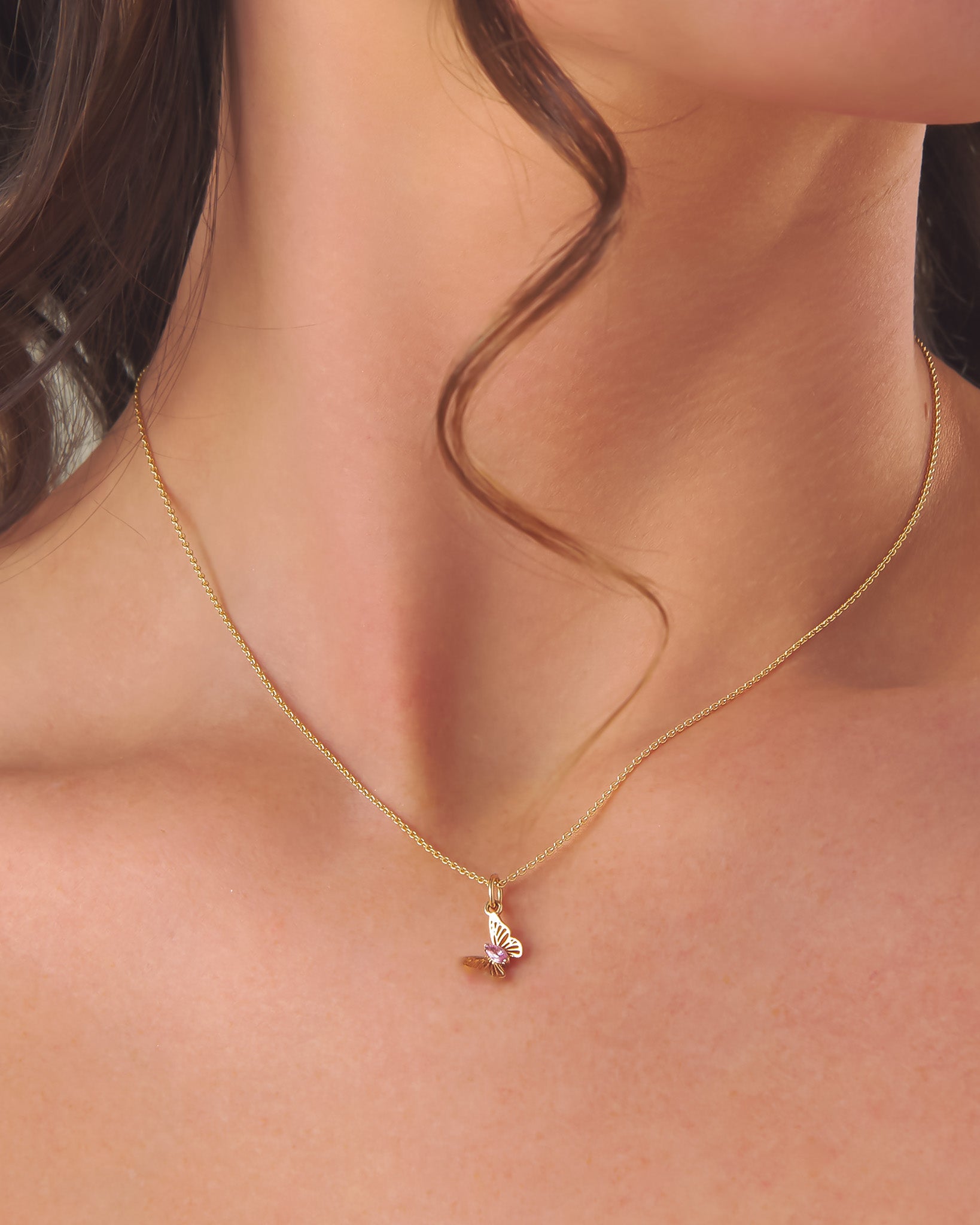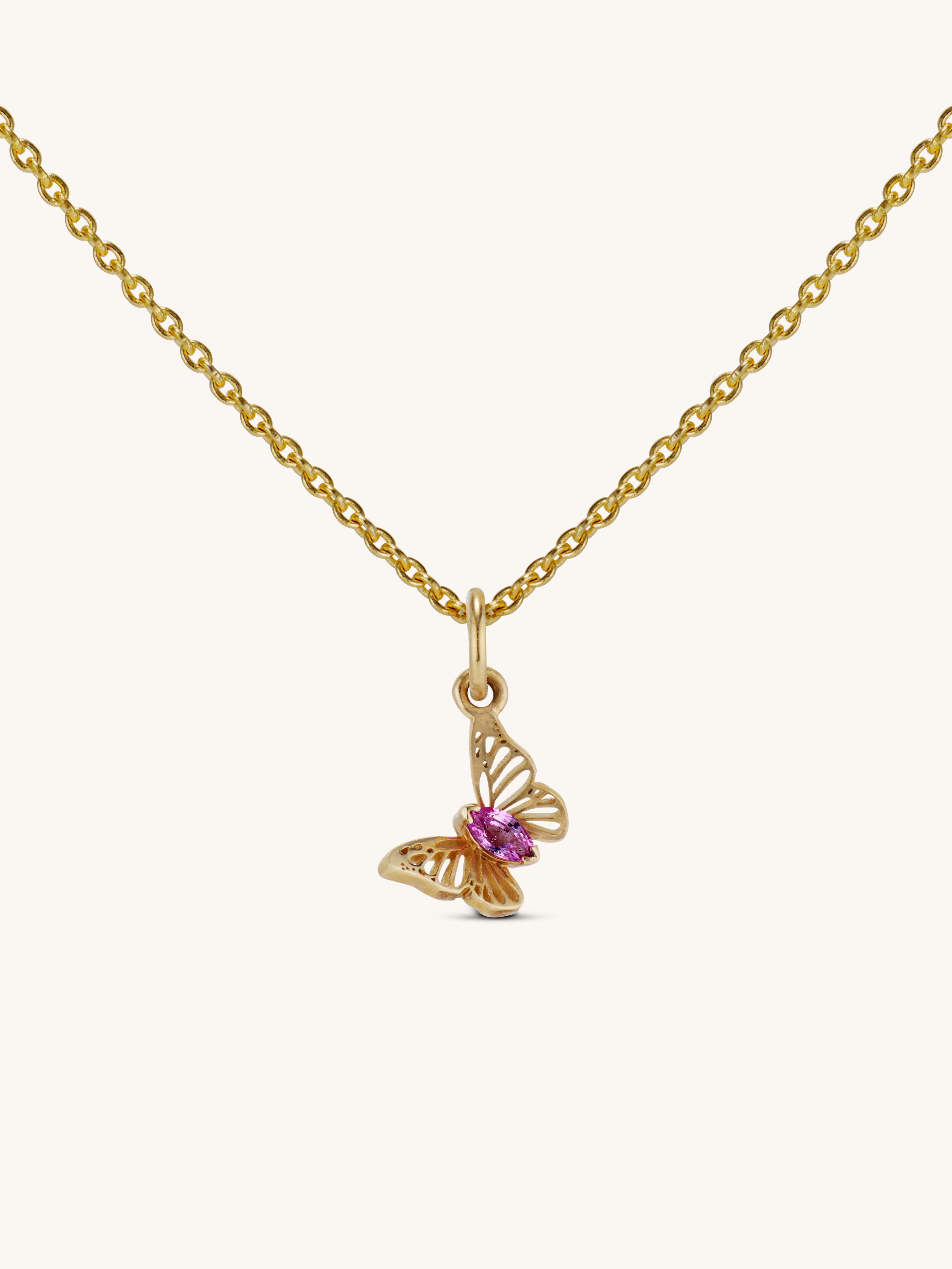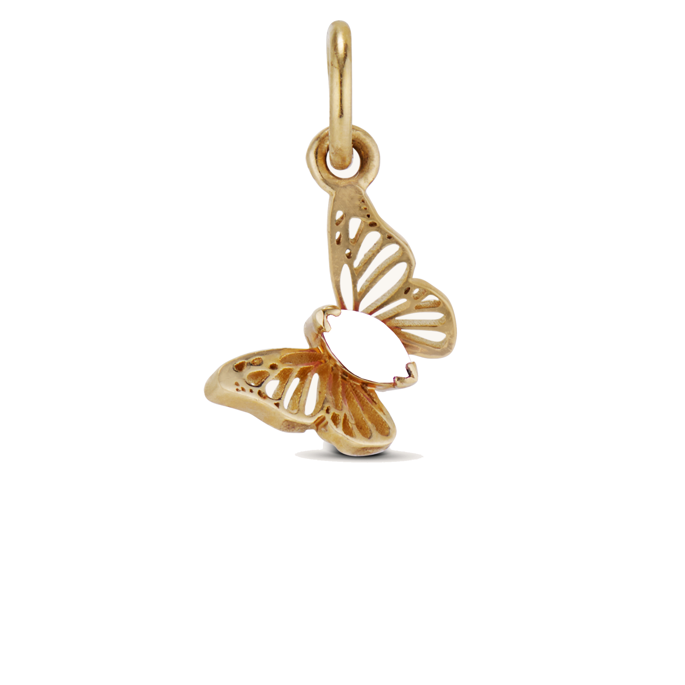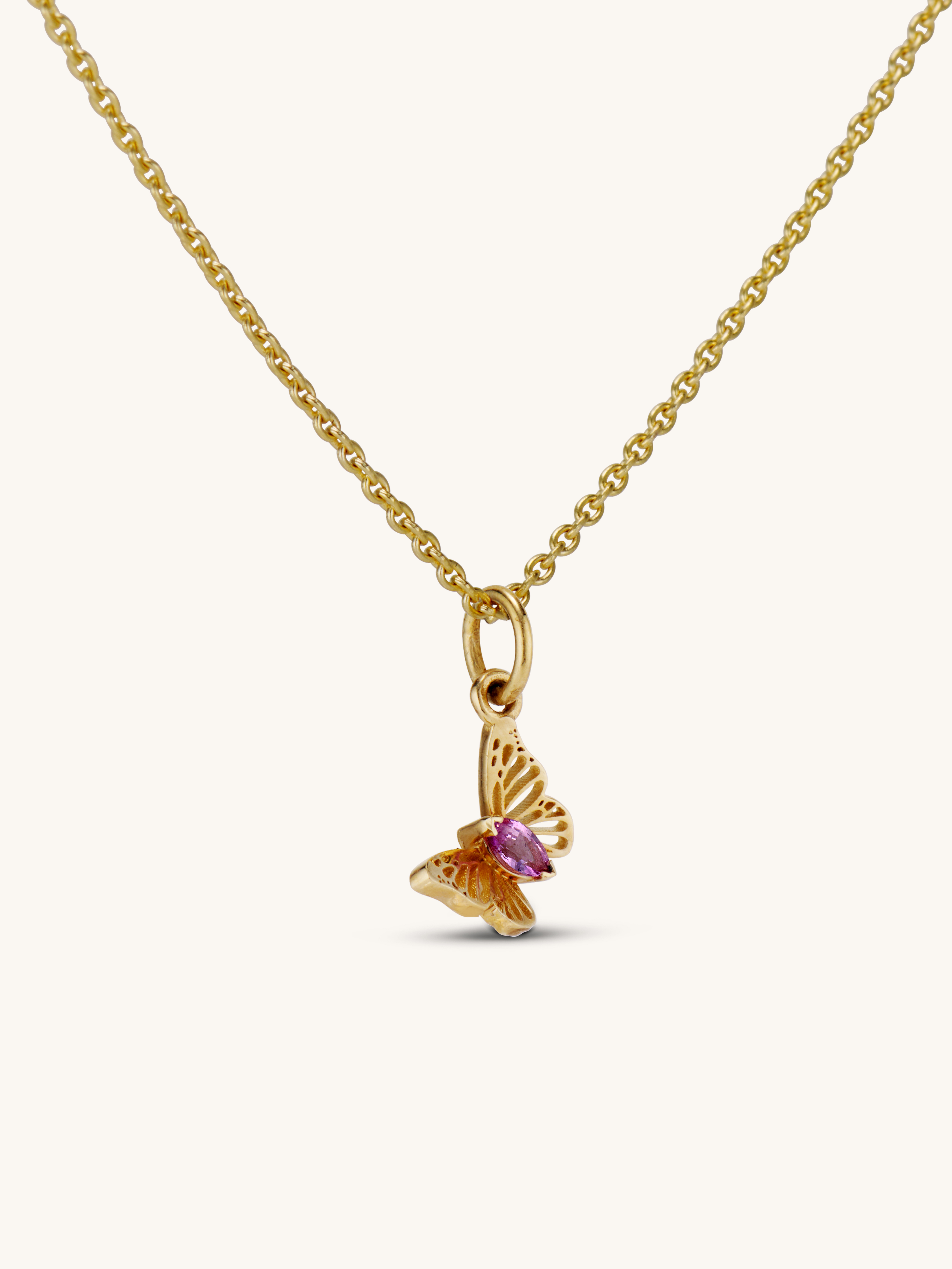 One of my favorite things in Animal Crossing is planting flowers, watering them until they fully bloom, and then seeing all of the butterflies gather to enjoy your hard work! This adorable charm features an intricate golden butterfly with a pink sapphire body.