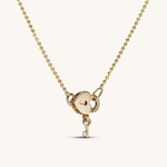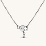 I spent so much of my youth navigating my way though dungeons in games like the Legend of Zelda: Ocarina of Time. It seemed I was always missing a key to the next locked door, and I'd have to retrace my steps or explore new rooms in order to find it! My love for these dungeon key puzzles led to the creation of this necklace. The heart-shaped locket is actually the clasp and the key is the handle you use to open the clasp! You actually wear this necklace backwards, since the closure is the main feature!