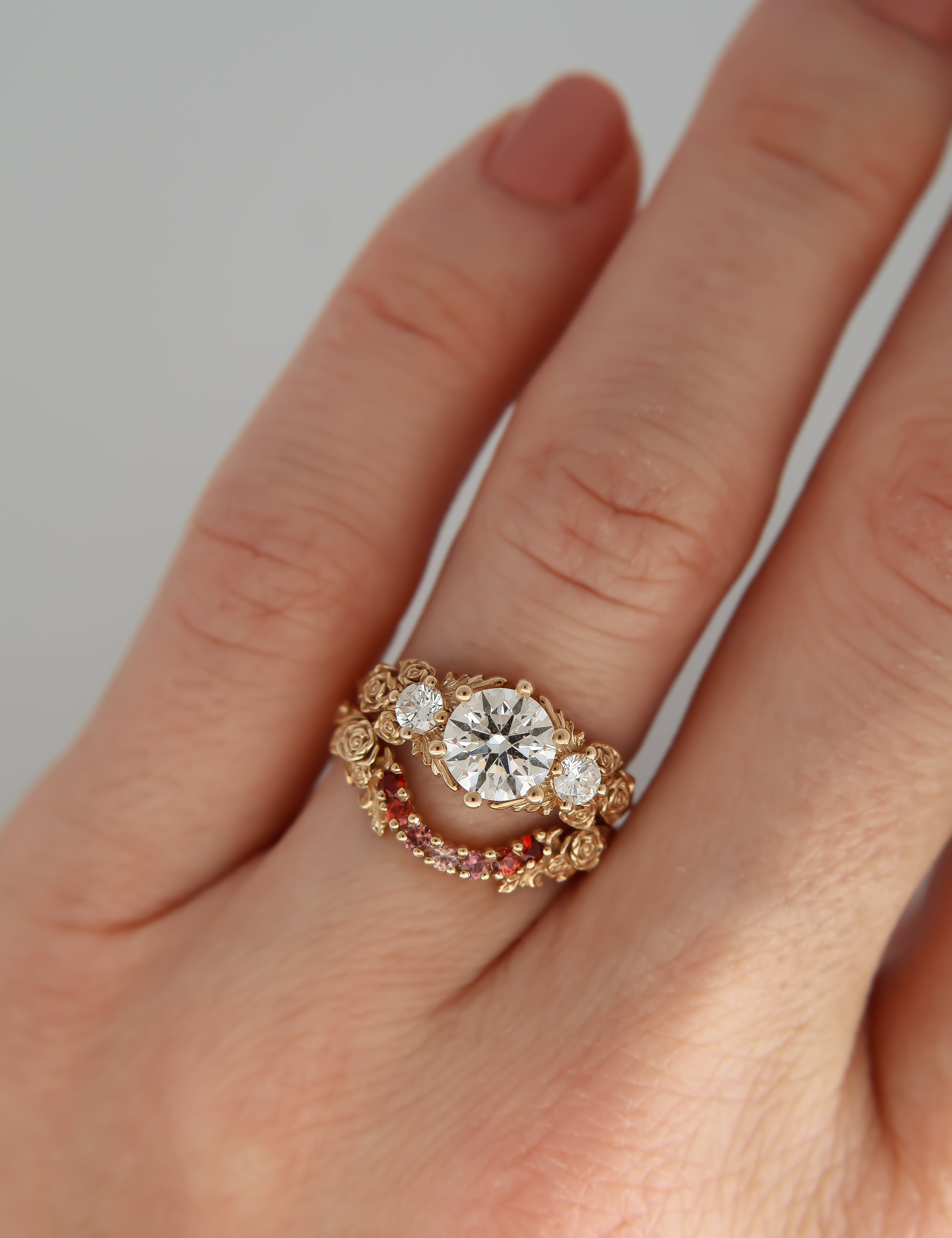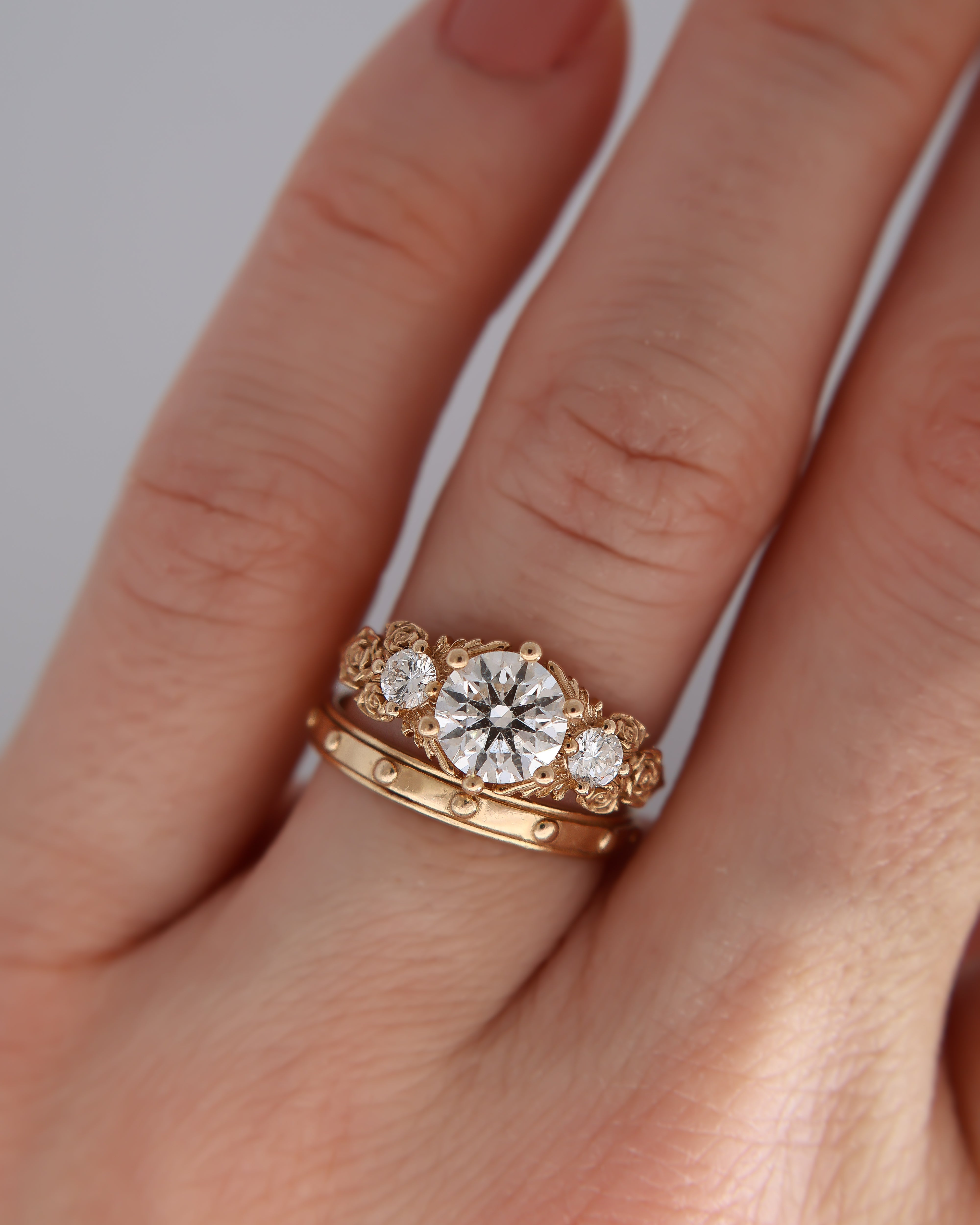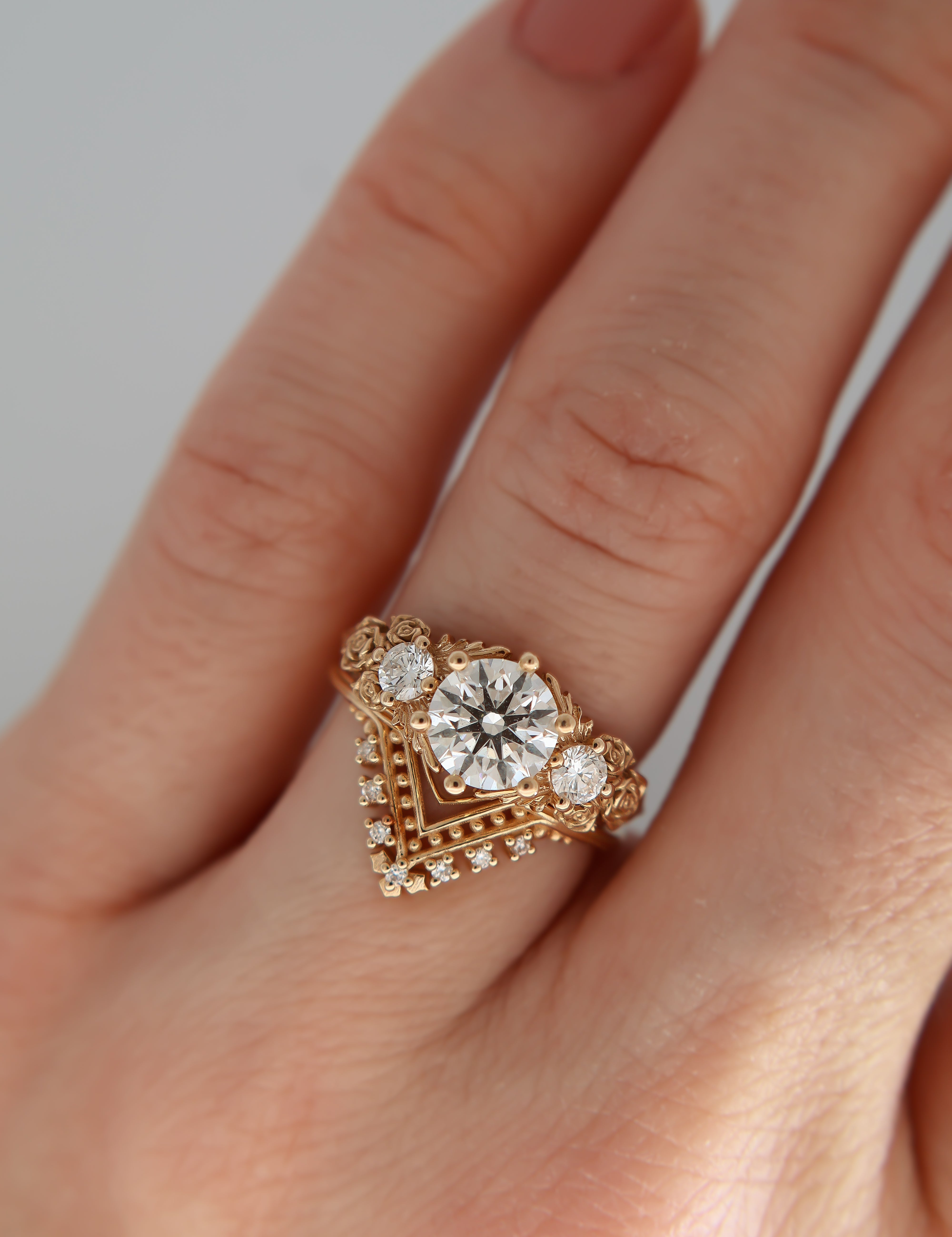 Inspired by gold roses in the Animal Crossing series, this ring features a 1 carat round brilliant cut diamond and accent diamonds surrounded by golden leaves and golden roses in clusters of three, just as they appear in the games.