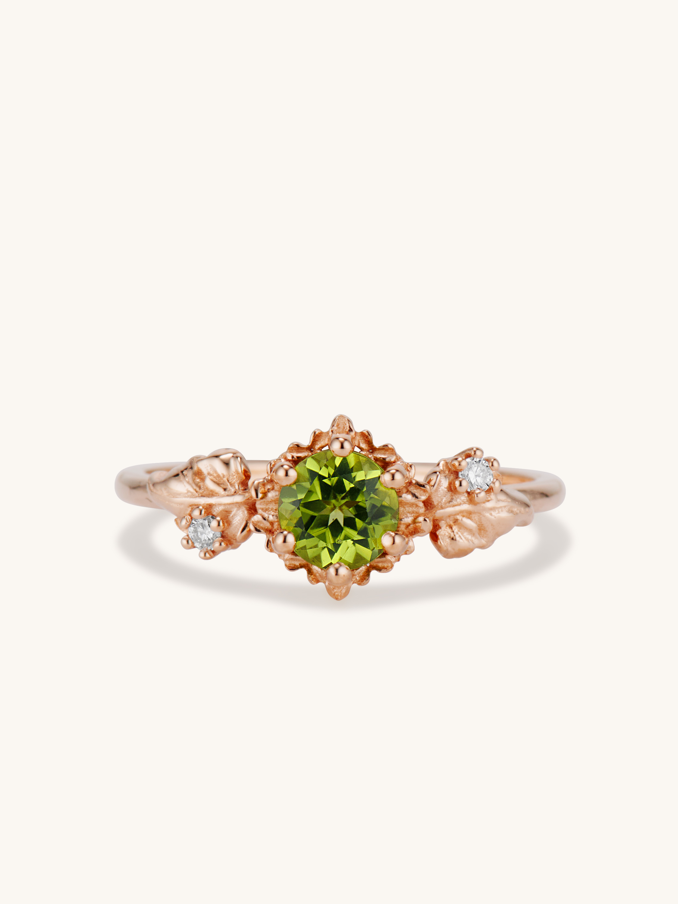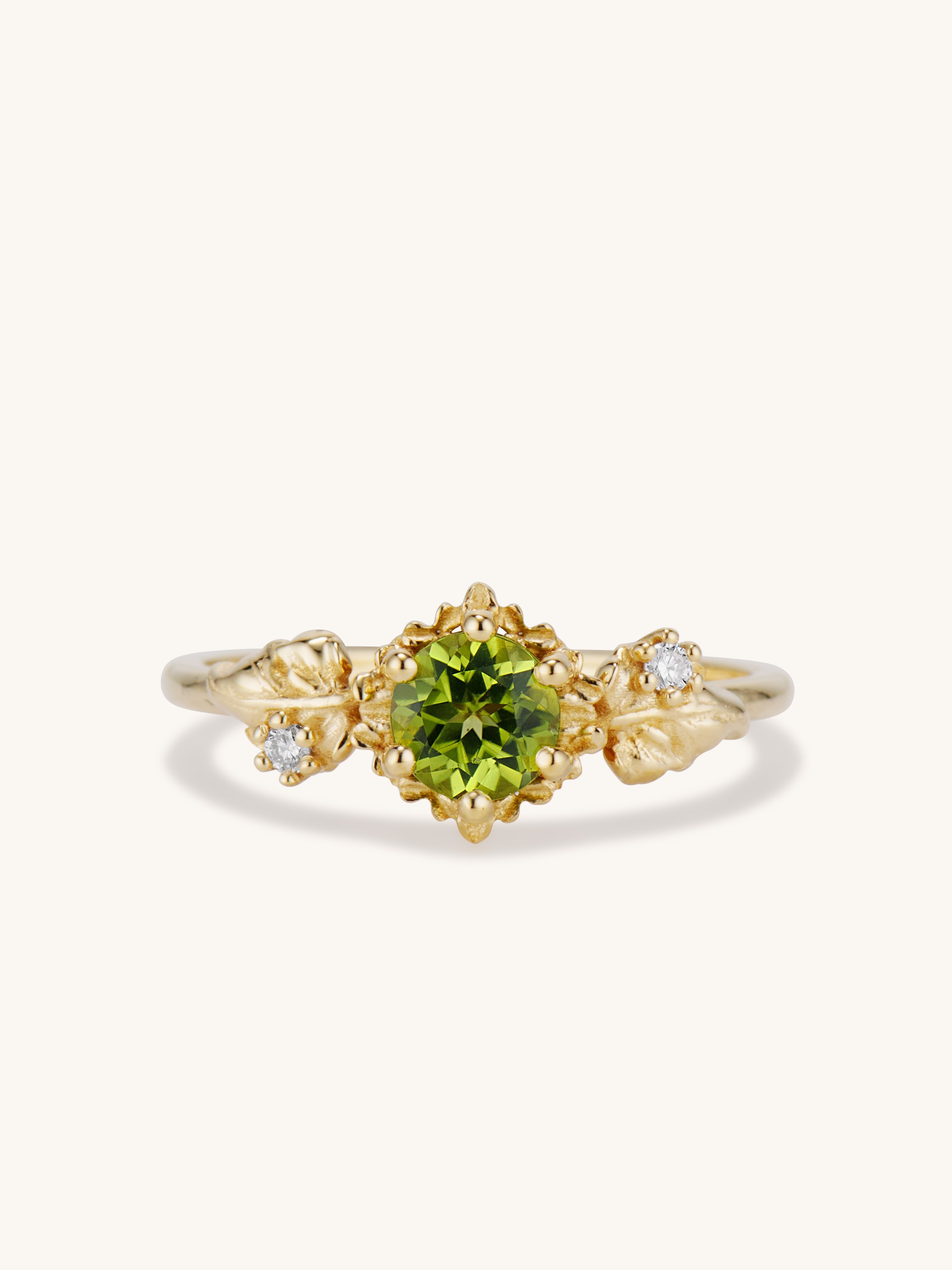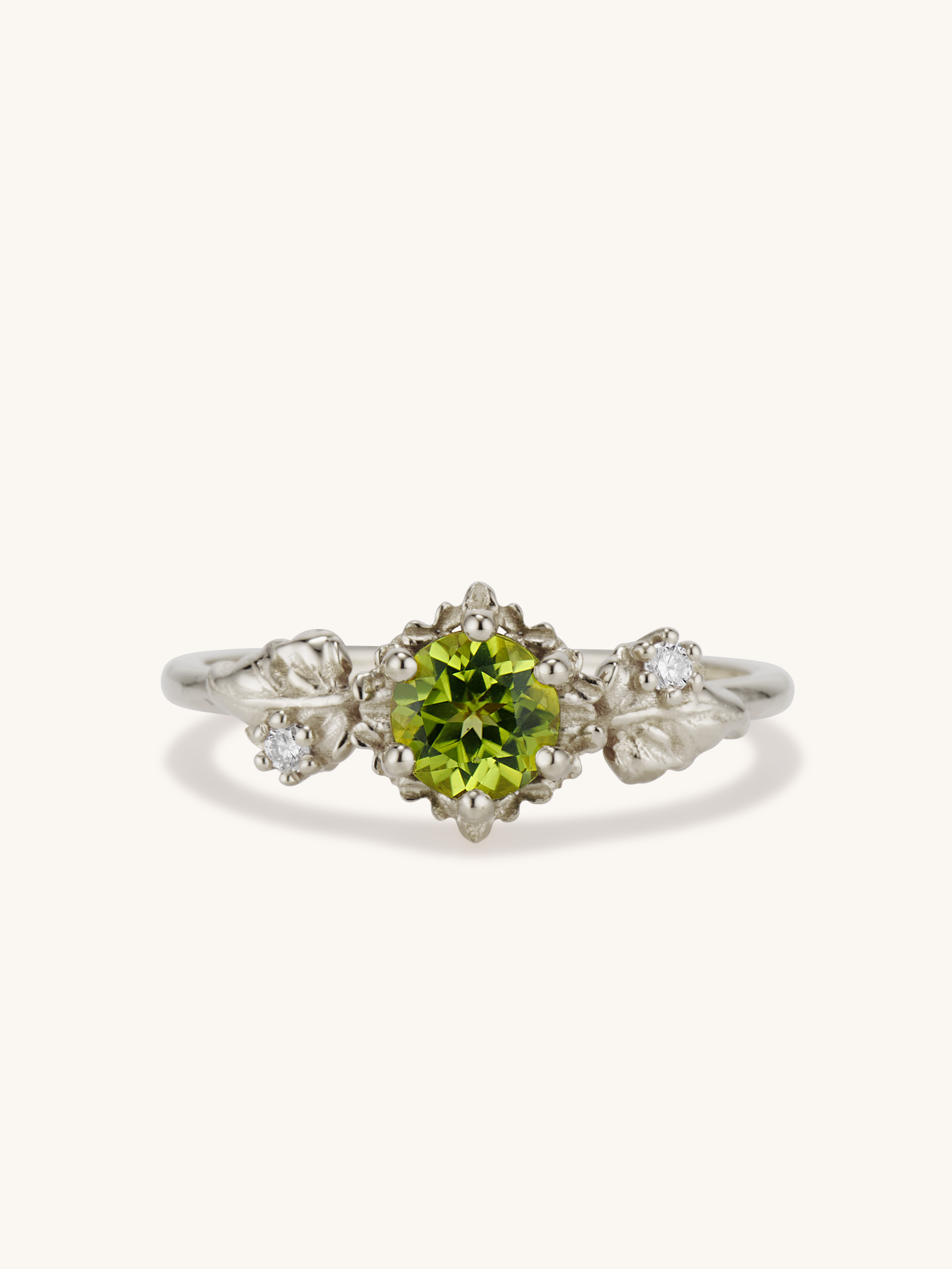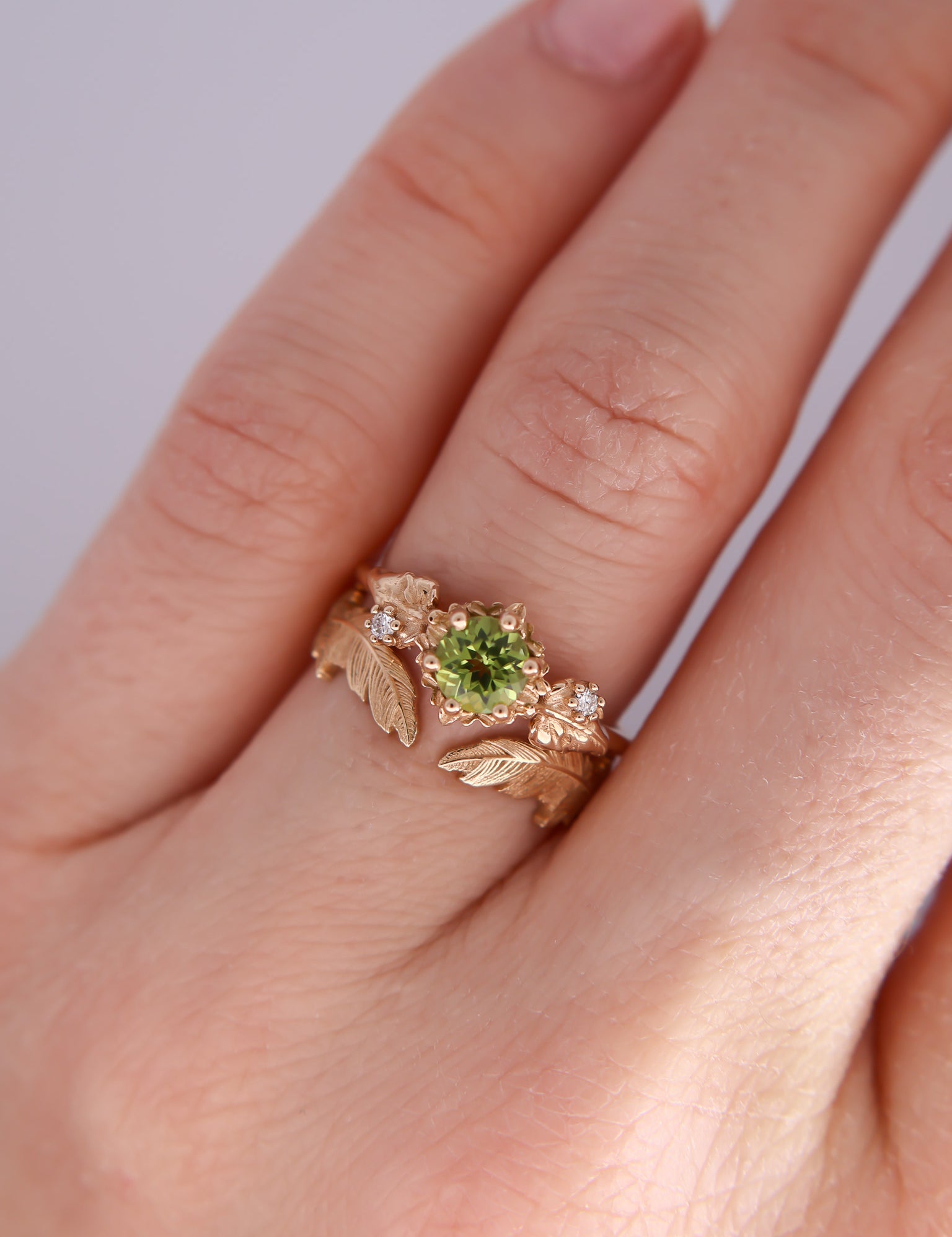Inspired by one of my favorite video game franchises of all time, this ring features a bright green peridot center stone. The stone is surrounded by tiny clovers and saplings, and on either side are two large curving leaves with round brilliant cut diamonds replacing the circular hole present in the classic Animal Crossing leaf design.