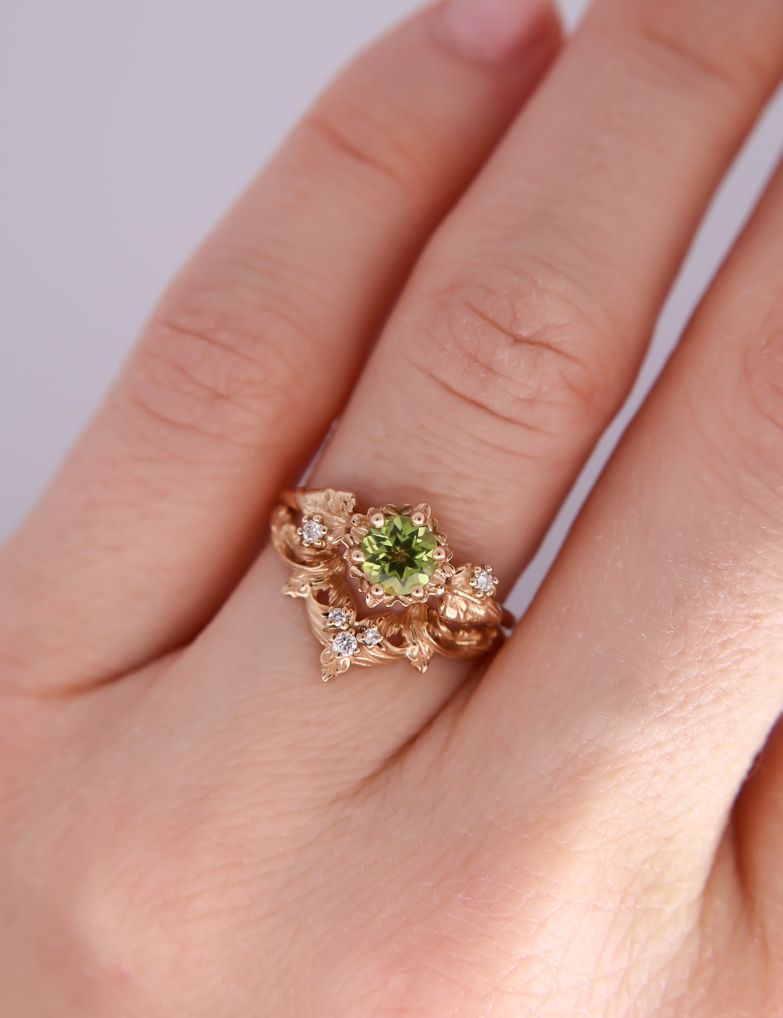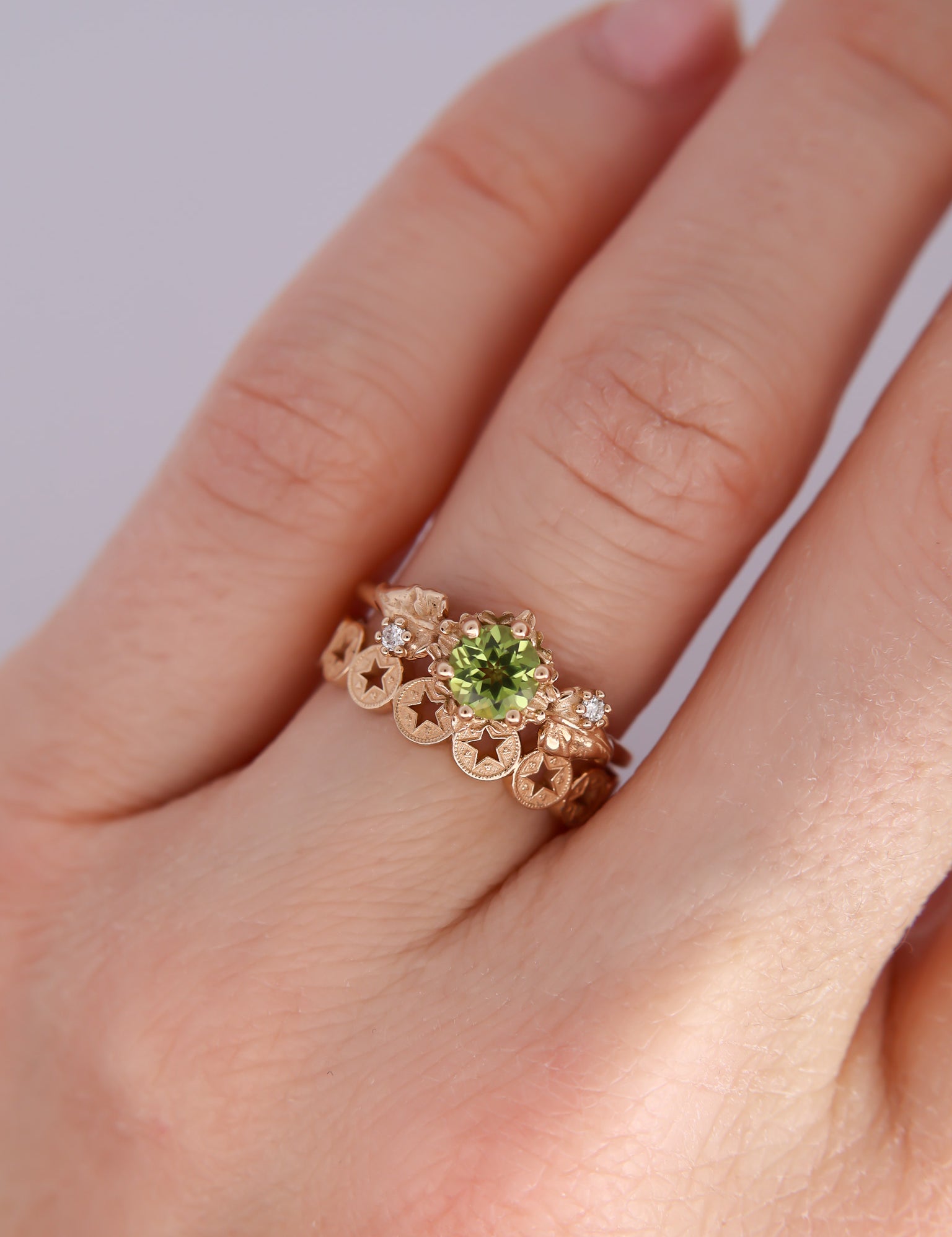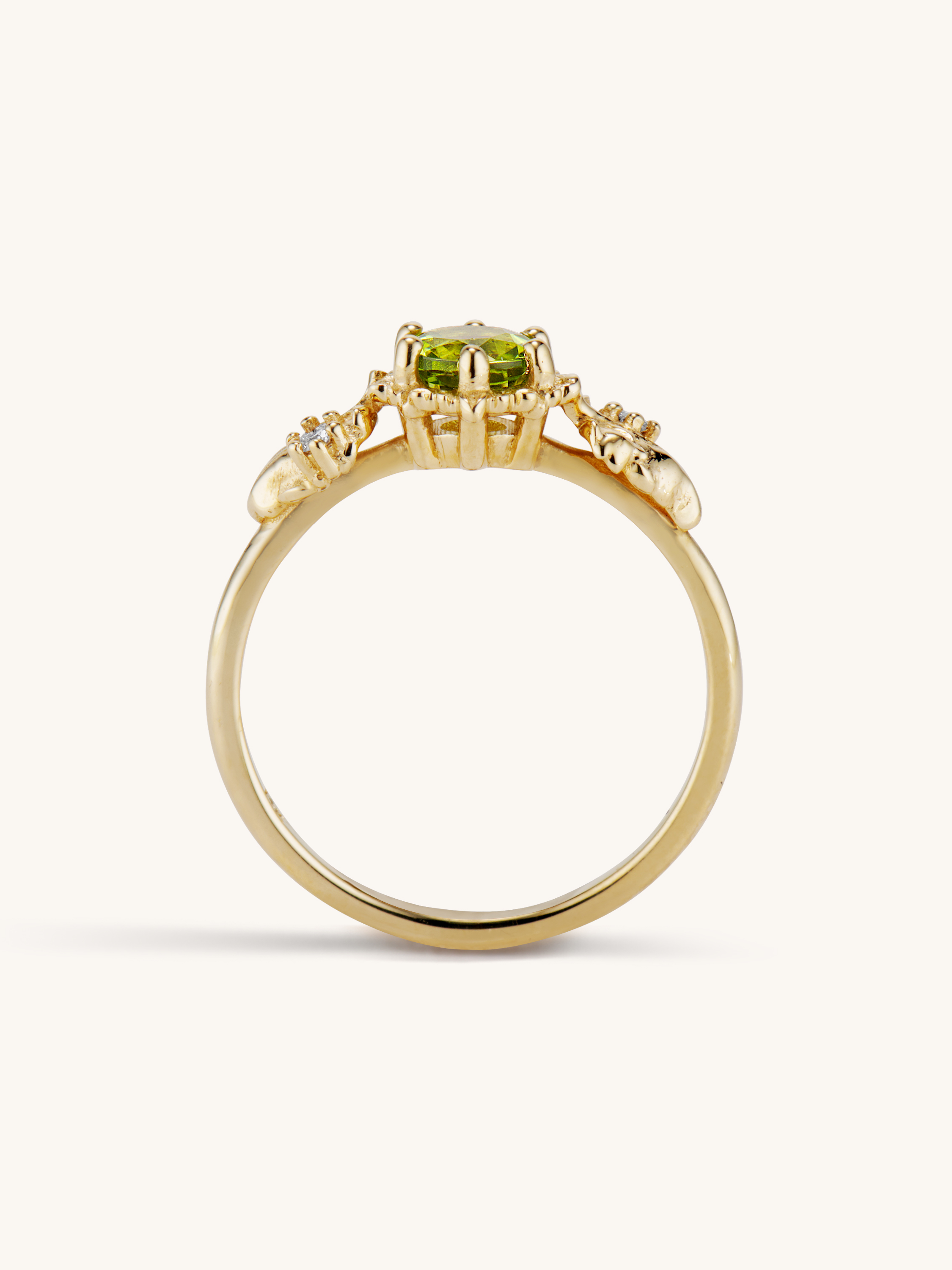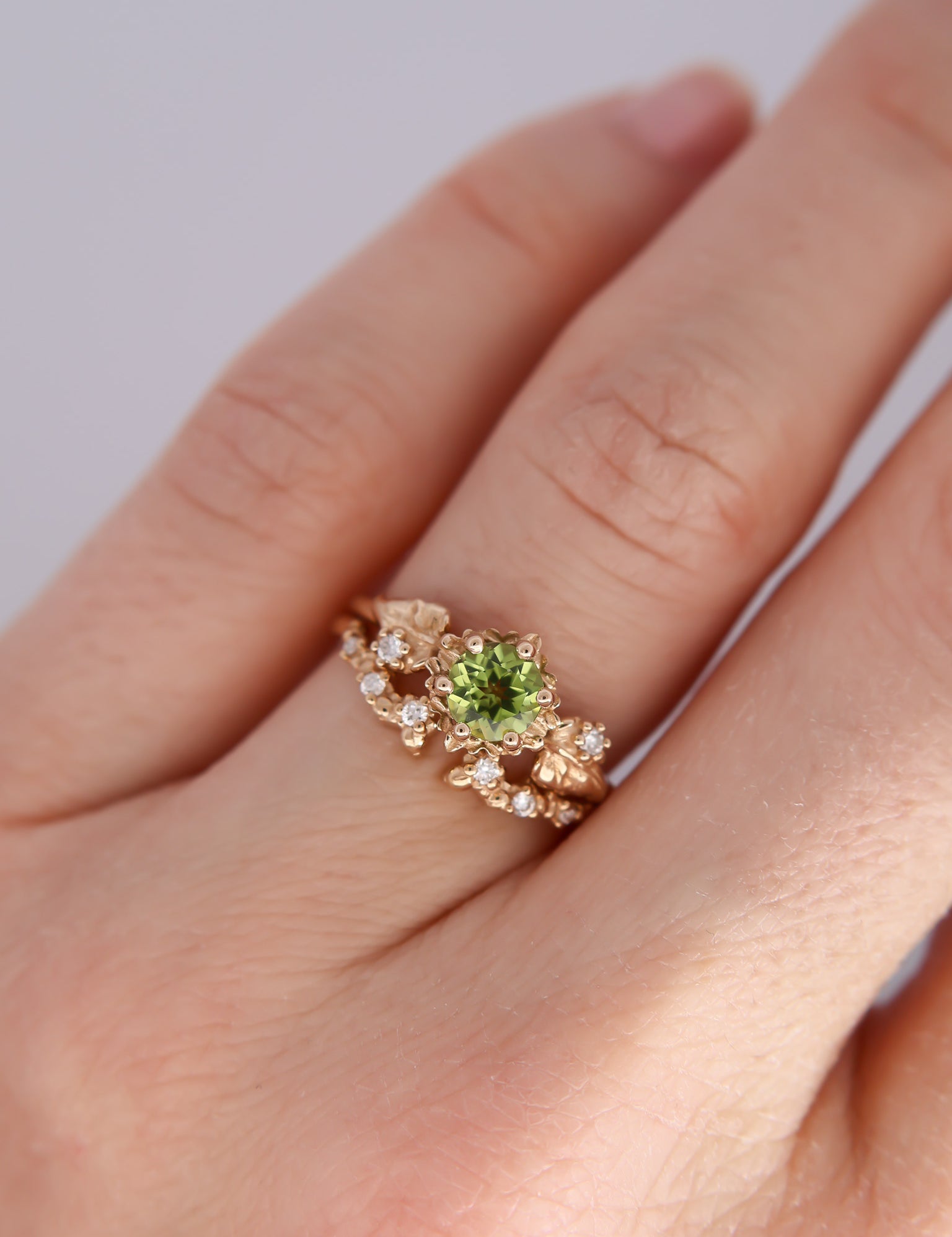 Inspired by one of my favorite video game franchises of all time, this ring features a bright green peridot center stone. The stone is surrounded by tiny clovers and saplings, and on either side are two large curving leaves with round brilliant cut diamonds replacing the circular hole present in the classic Animal Crossing leaf design.