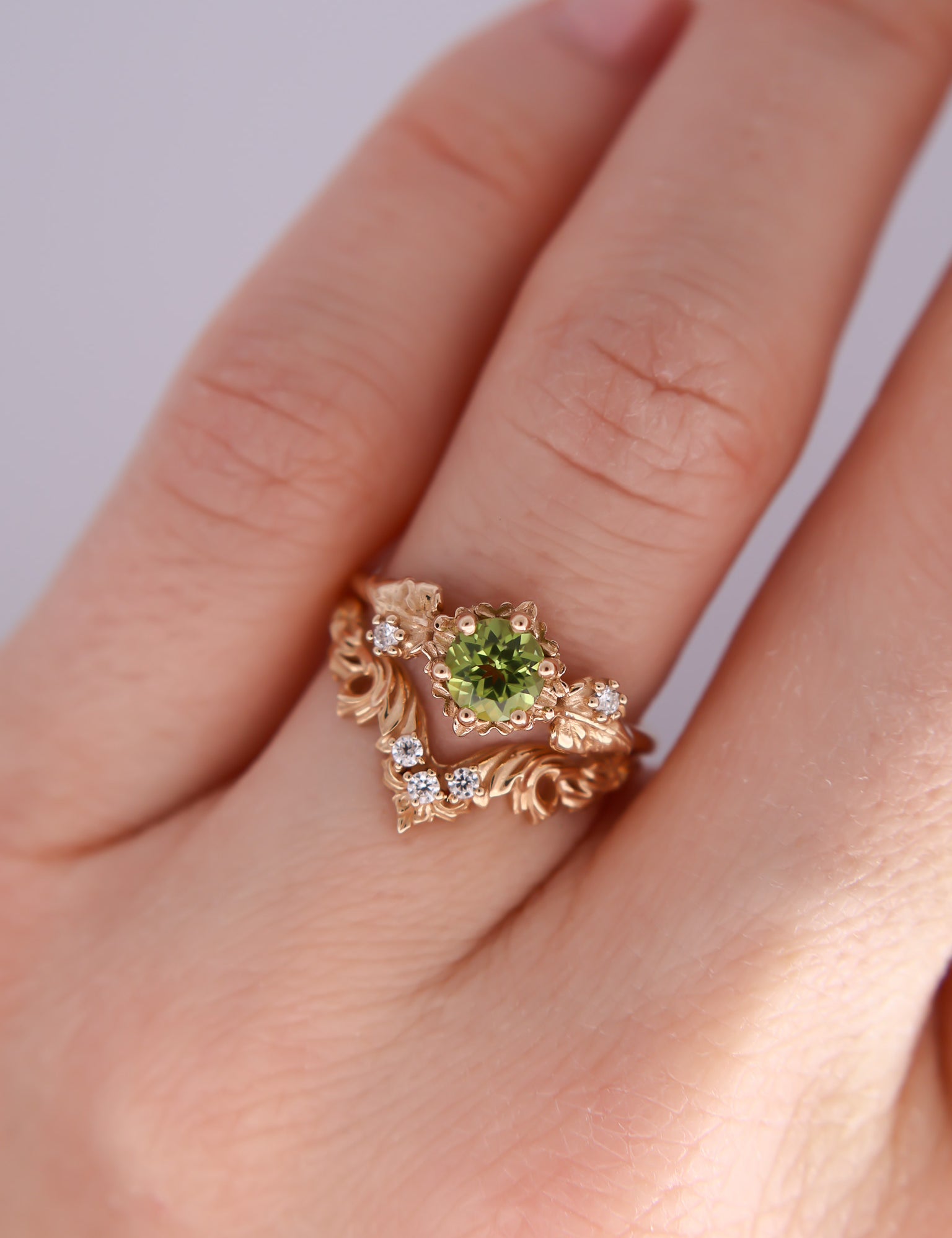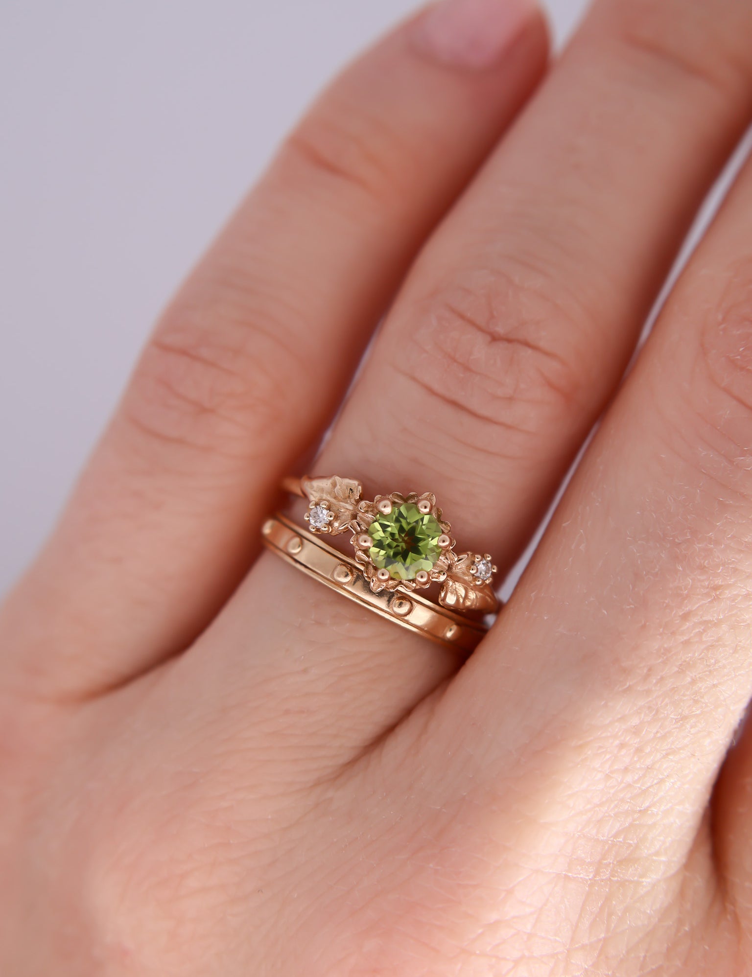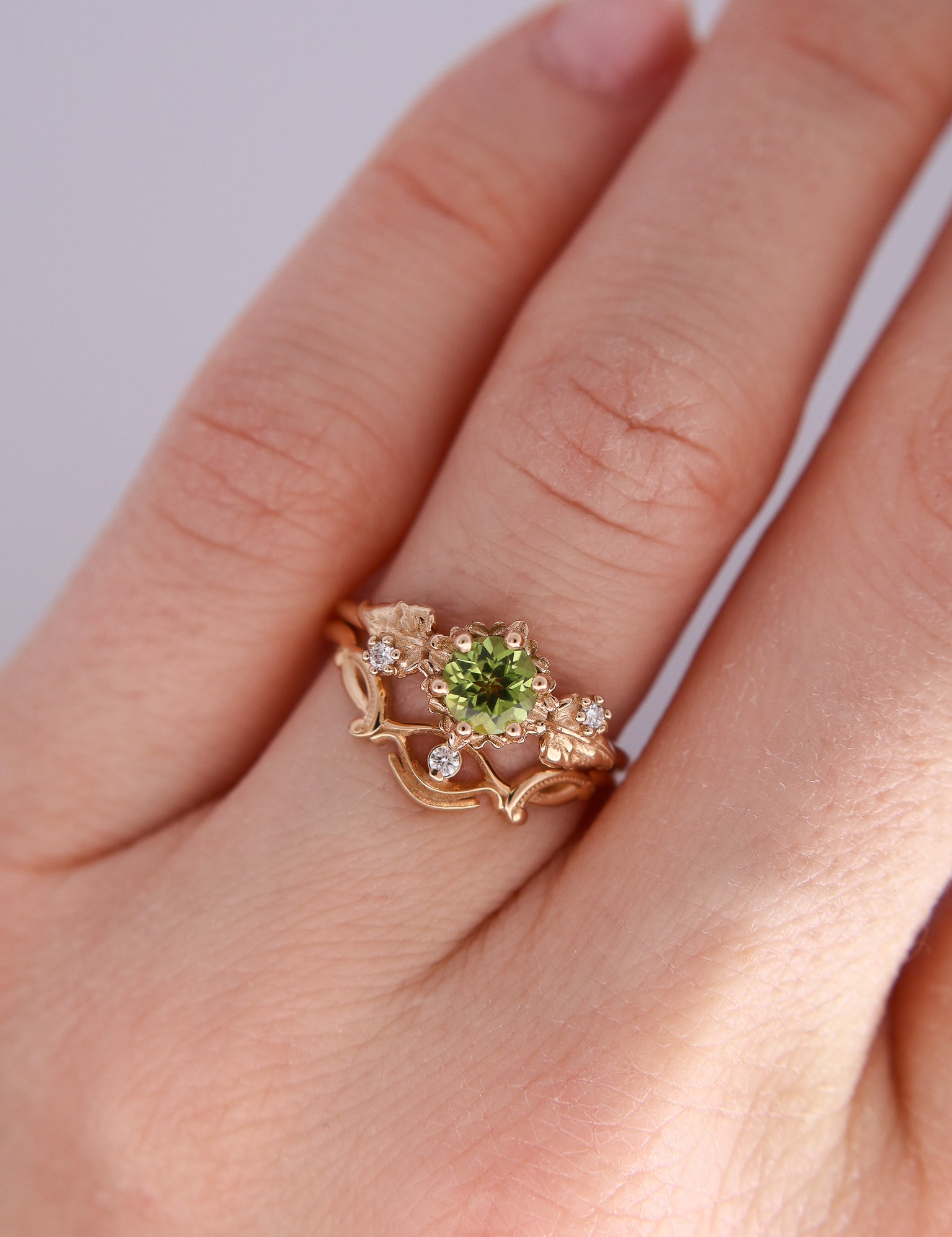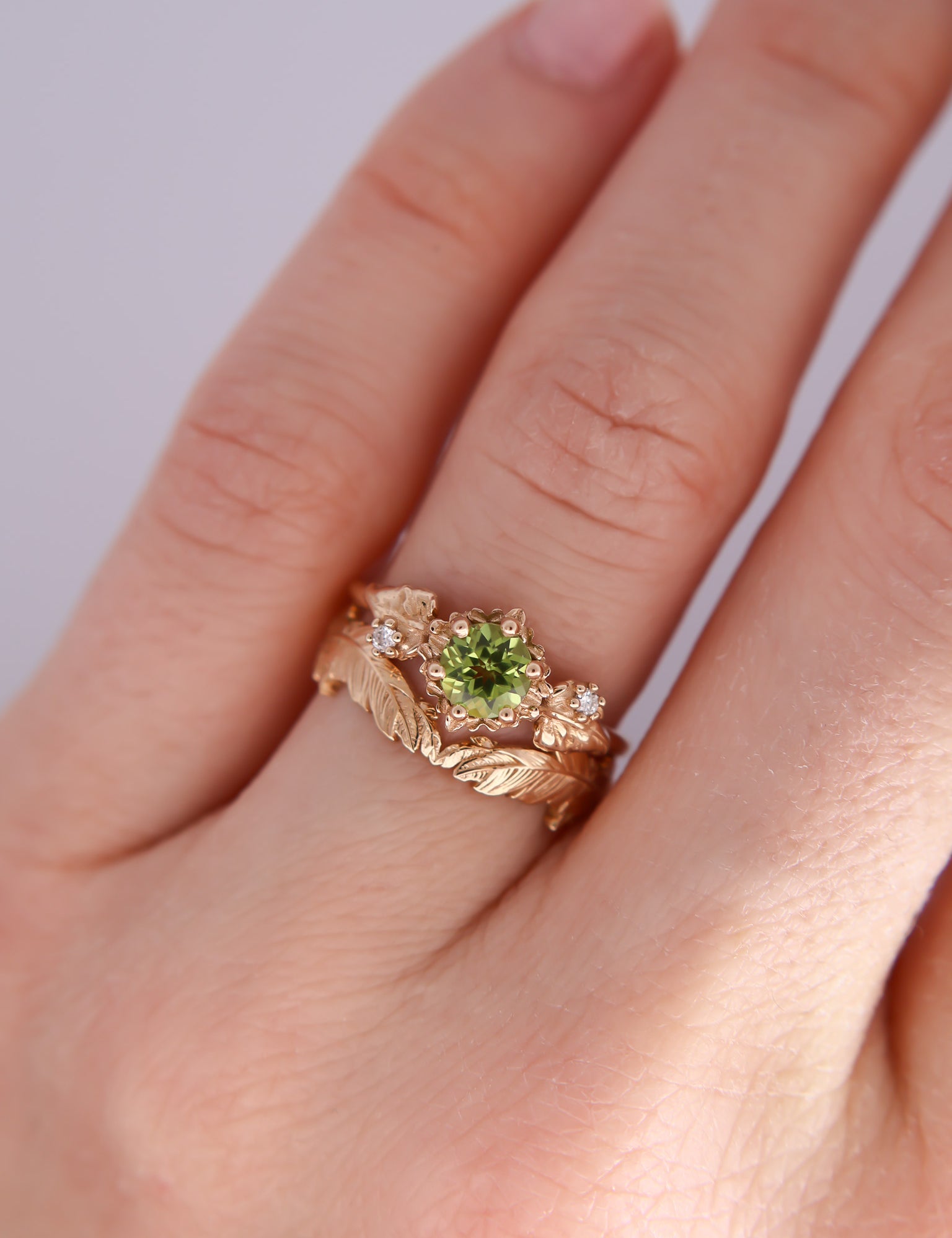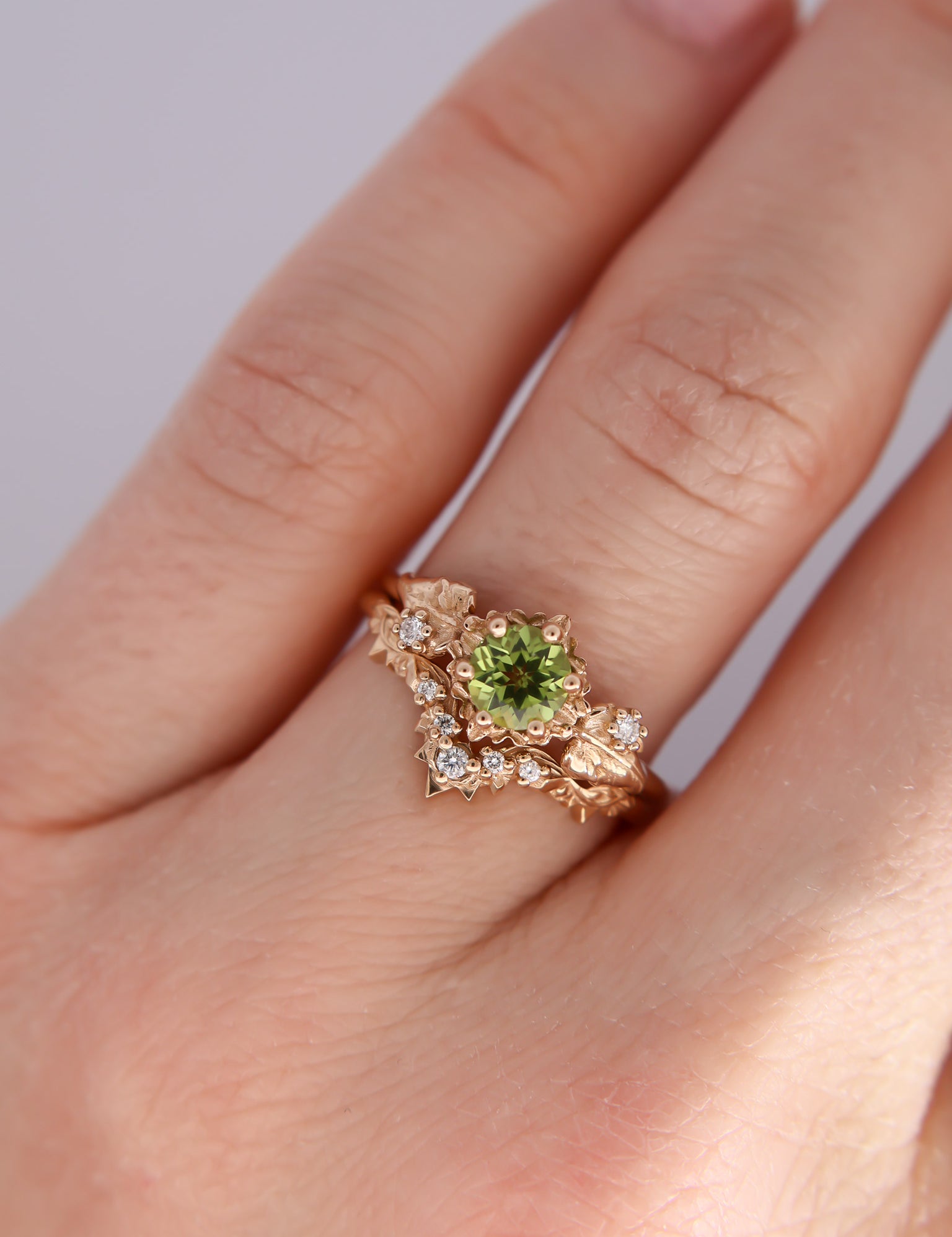 Inspired by one of my favorite video game franchises of all time, this ring features a bright green peridot center stone. The stone is surrounded by tiny clovers and saplings, and on either side are two large curving leaves with round brilliant cut diamonds replacing the circular hole present in the classic Animal Crossing leaf design.