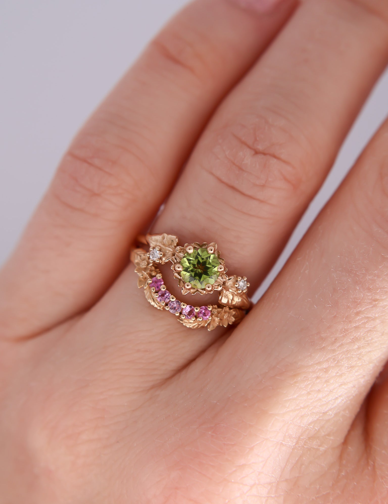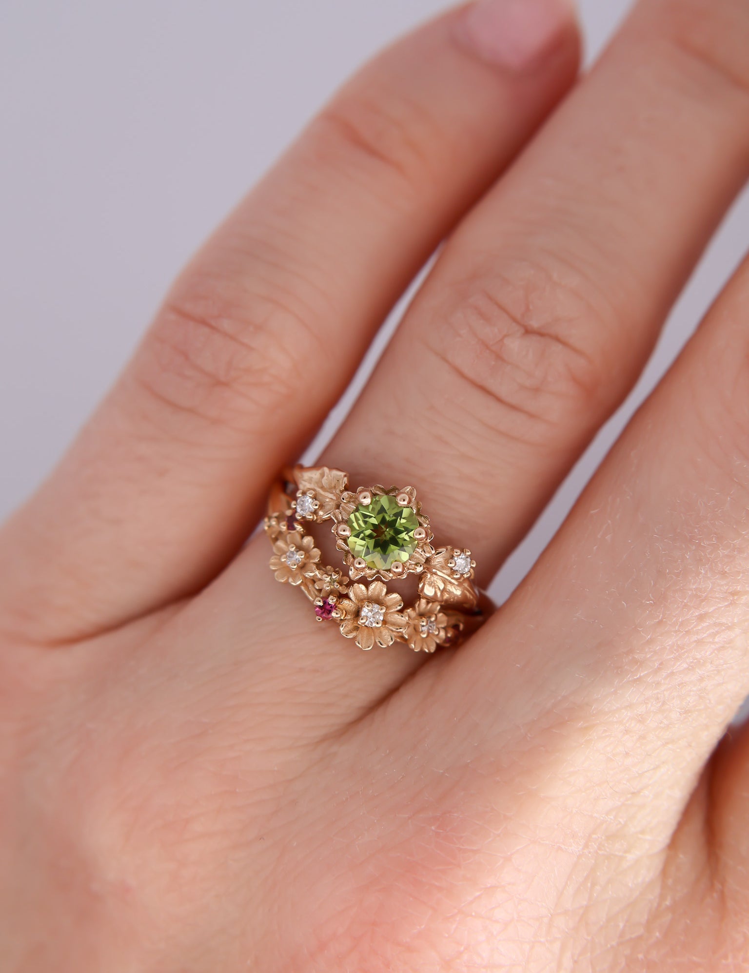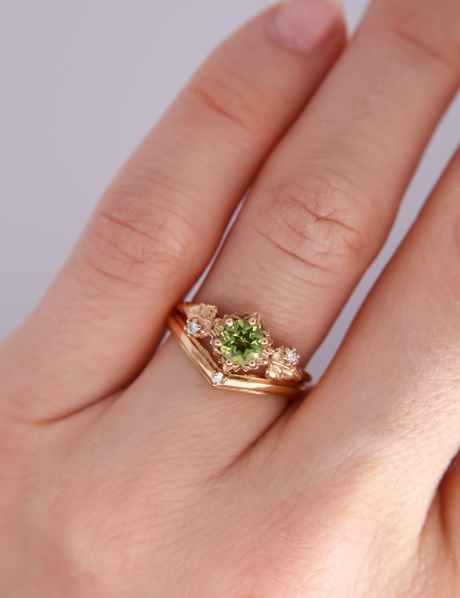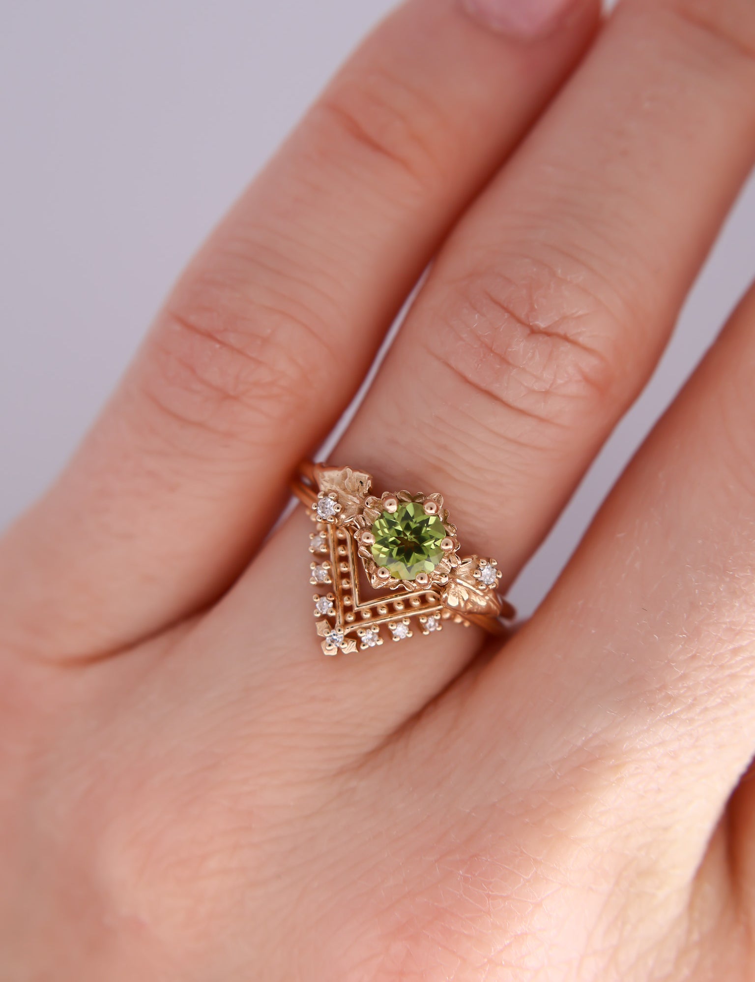 Inspired by one of my favorite video game franchises of all time, this ring features a bright green peridot center stone. The stone is surrounded by tiny clovers and saplings, and on either side are two large curving leaves with round brilliant cut diamonds replacing the circular hole present in the classic Animal Crossing leaf design.