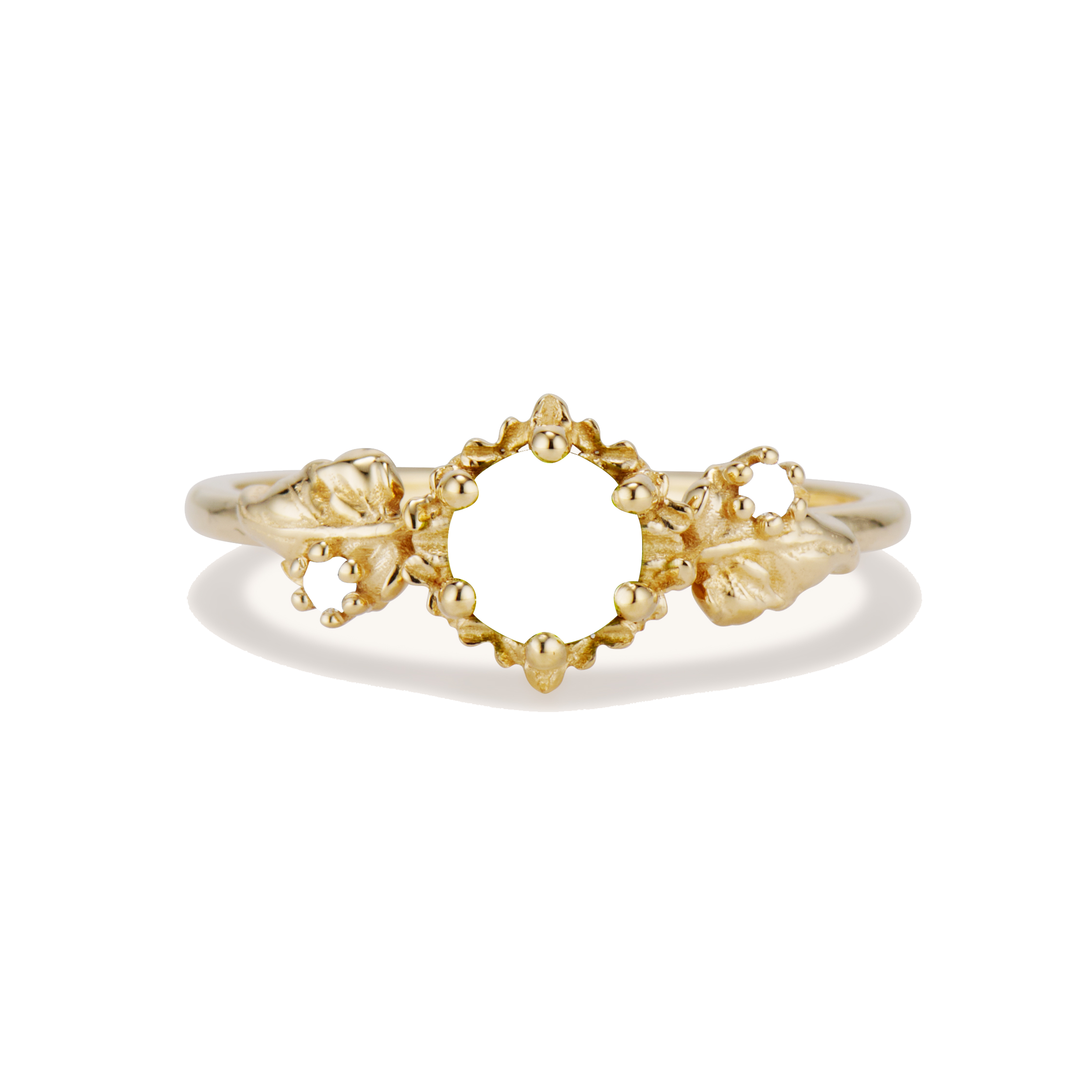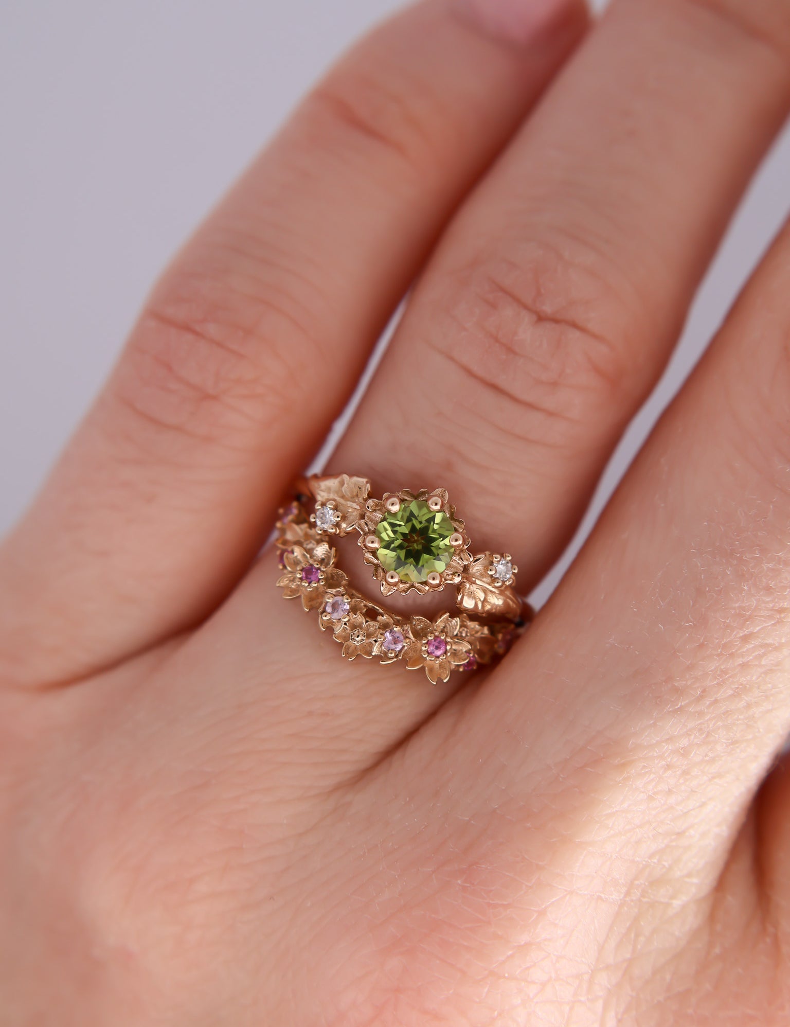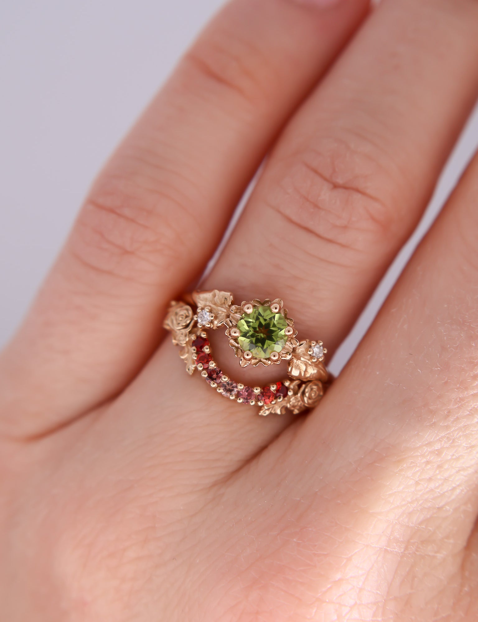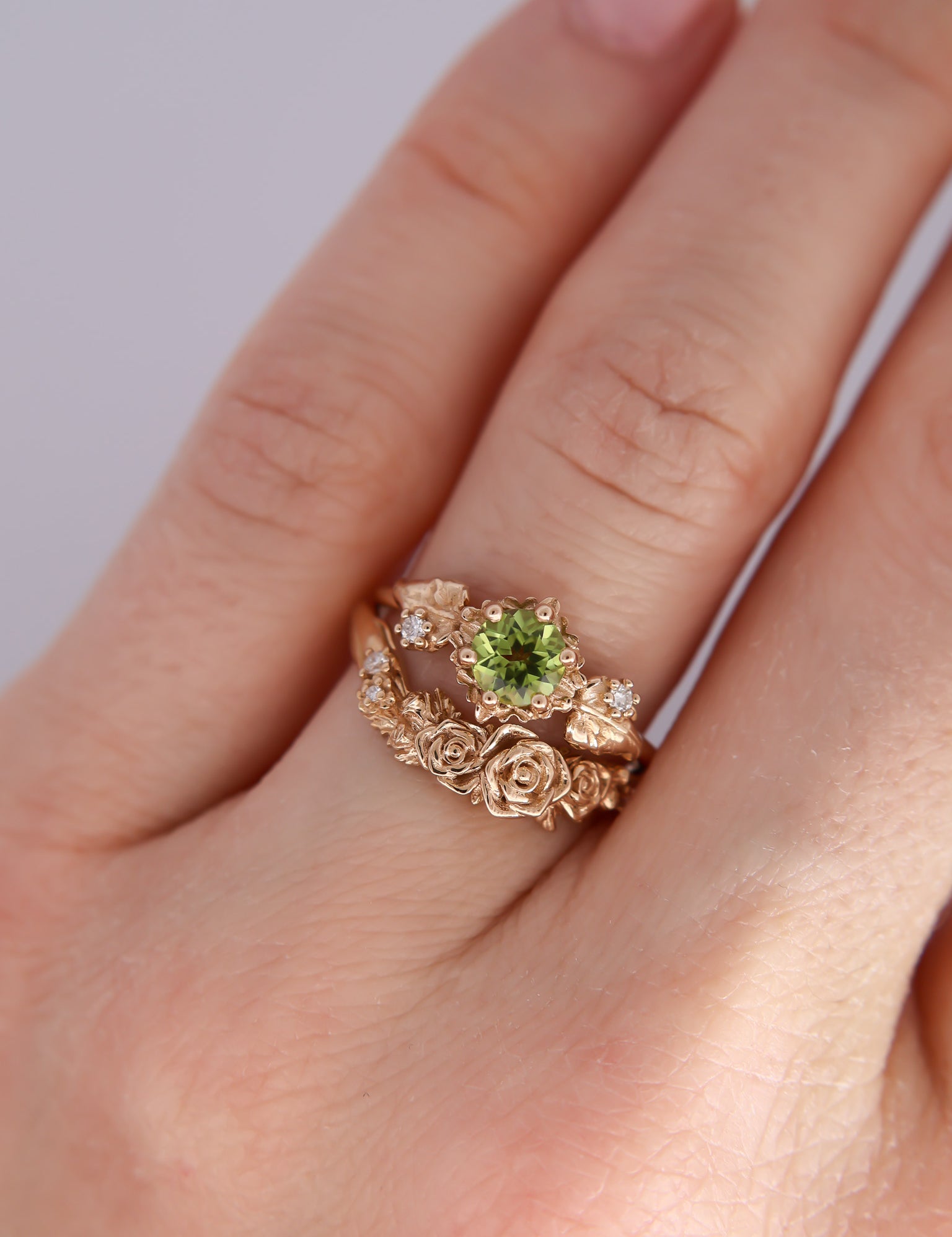 Inspired by one of my favorite video game franchises of all time, this ring features a bright green peridot center stone. The stone is surrounded by tiny clovers and saplings, and on either side are two large curving leaves with round brilliant cut diamonds replacing the circular hole present in the classic Animal Crossing leaf design.