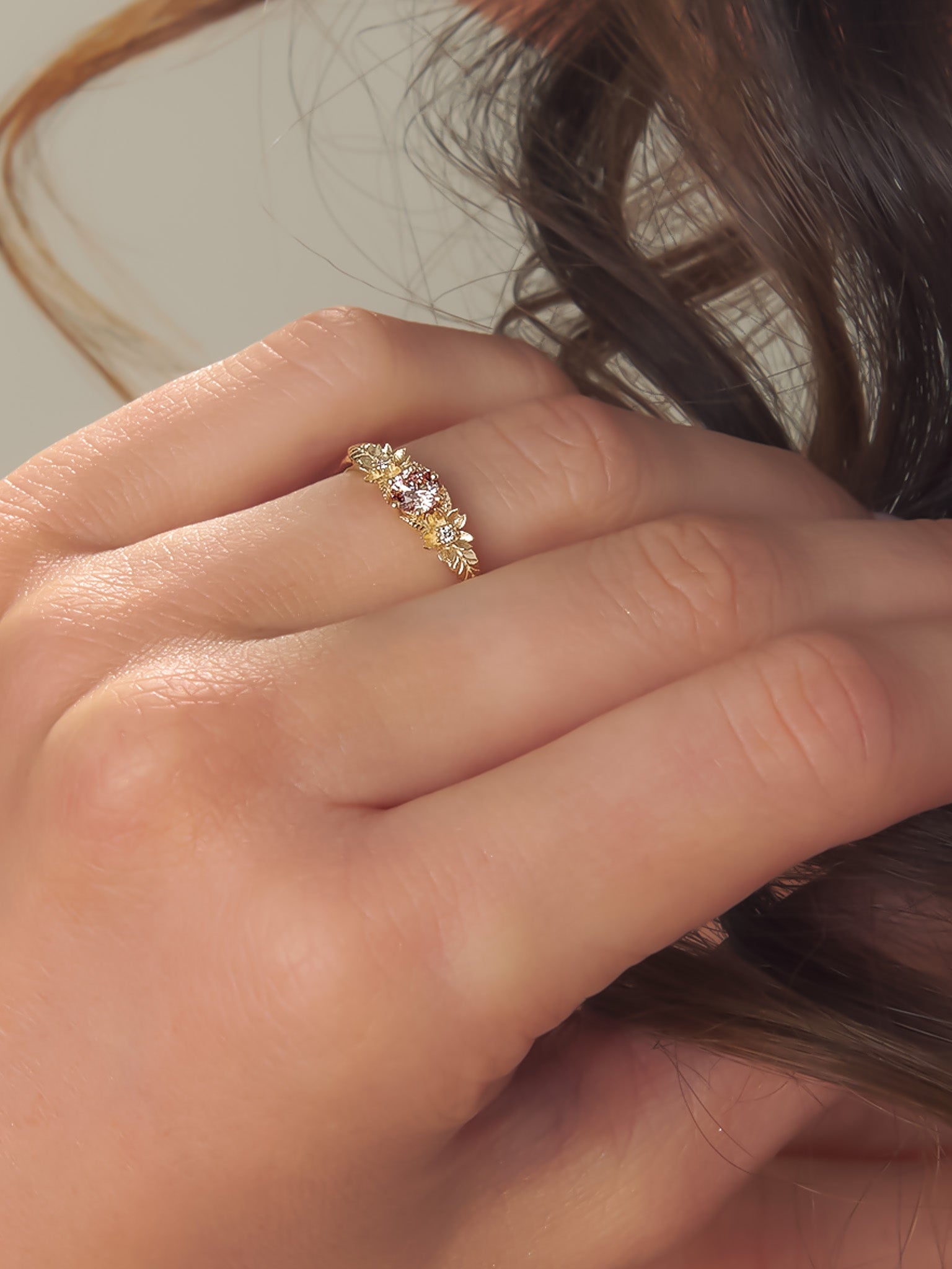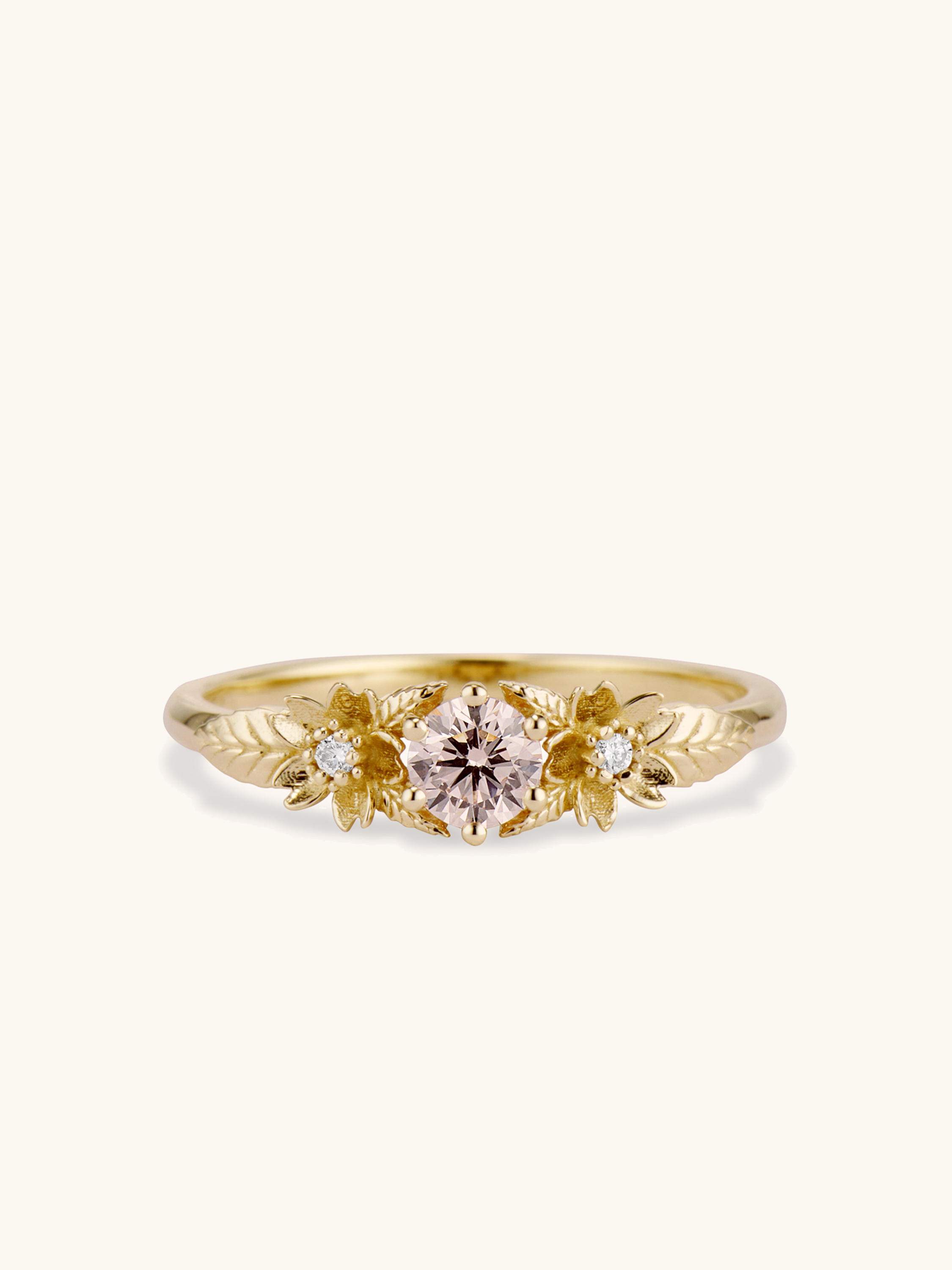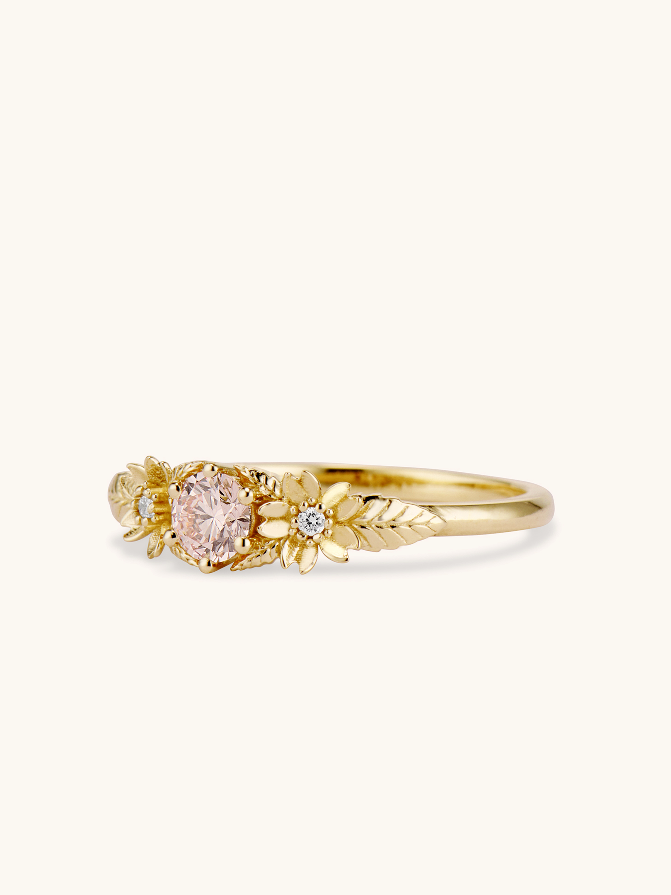 Inspired by the cherry blossom season in the Animal Crossing series, this intricate ring features a round brilliant cut pink lab-grown diamond center stone. The perfect size for people who love delicate, minimal jewelry. The diamond is cradled by golden sakura leaves and sakura flowers filed with tiny white diamonds!