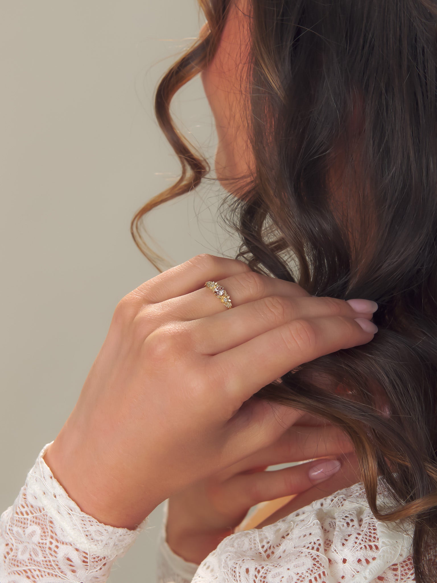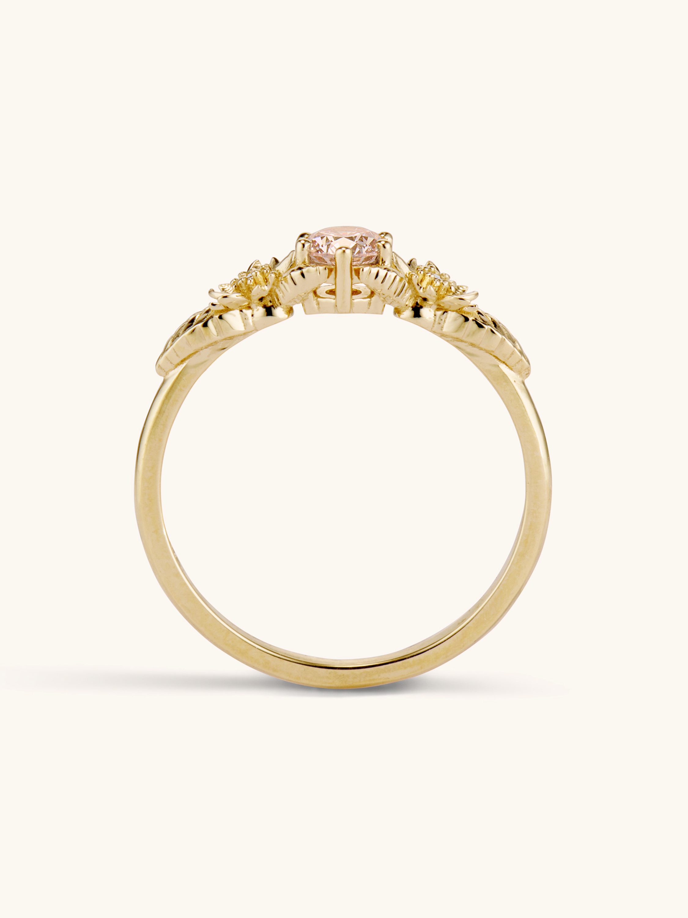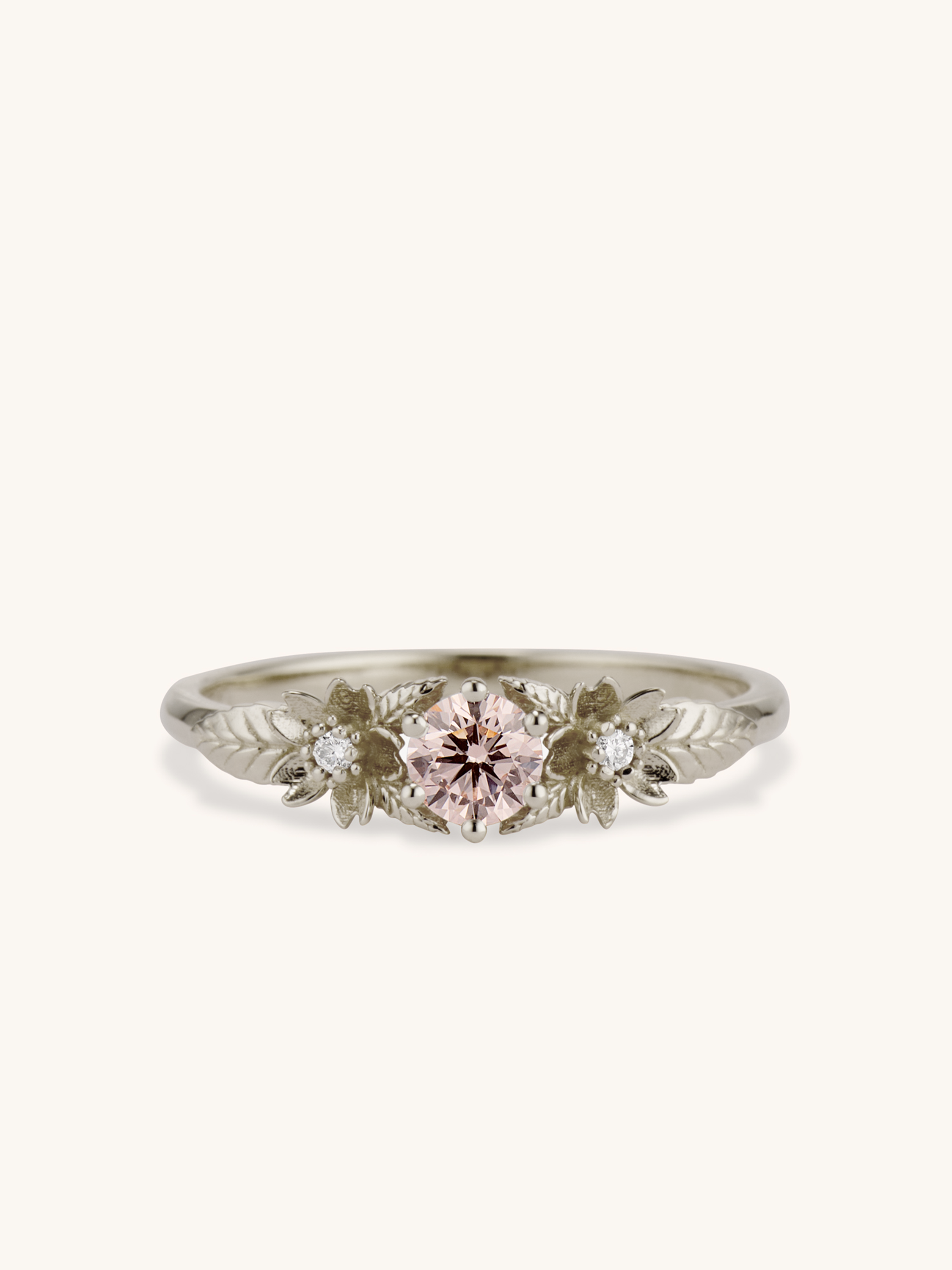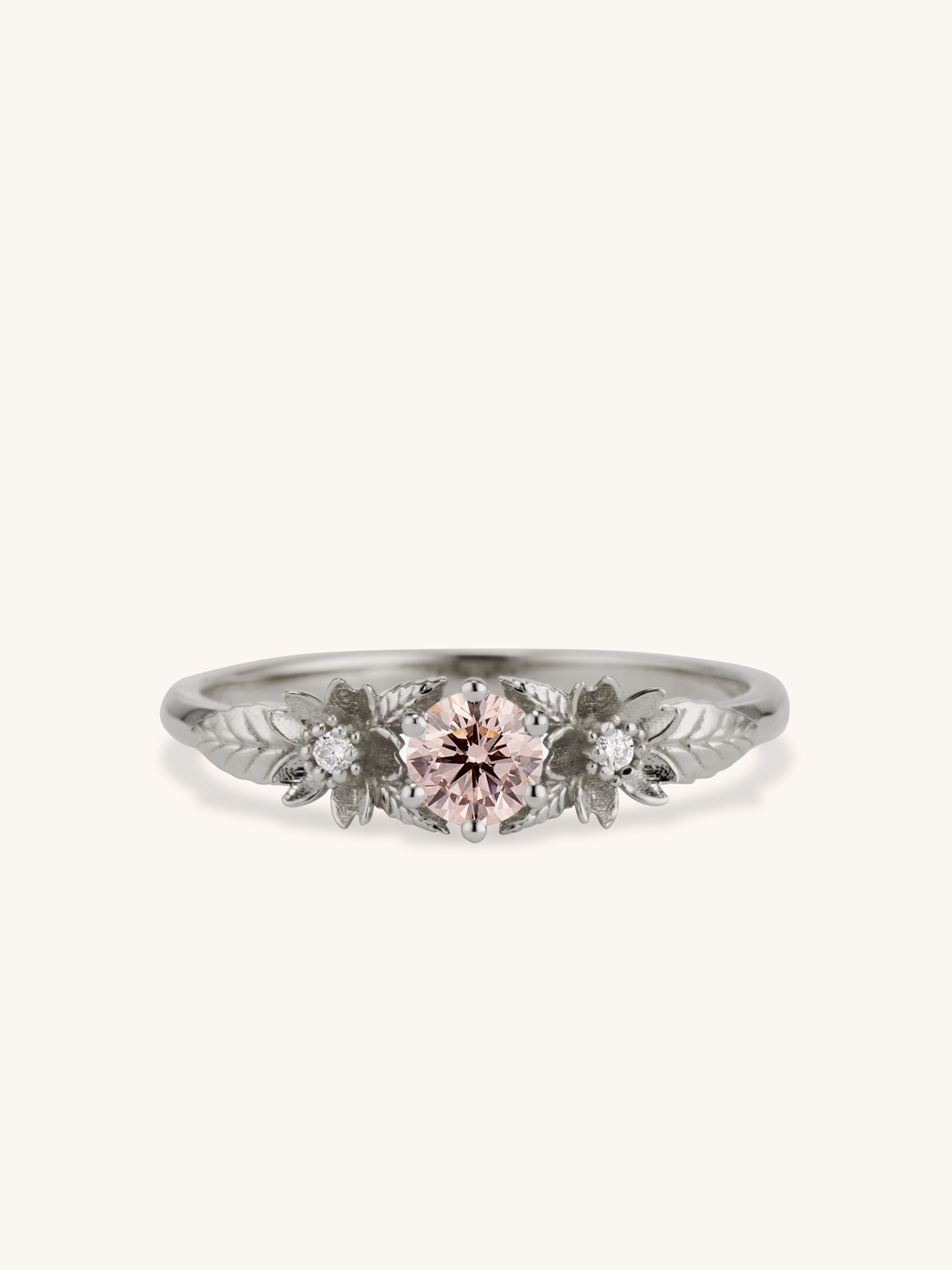 Inspired by the cherry blossom season in the Animal Crossing series, this intricate ring features a round brilliant cut pink lab-grown diamond center stone. The perfect size for people who love delicate, minimal jewelry. The diamond is cradled by golden sakura leaves and sakura flowers filed with tiny white diamonds!