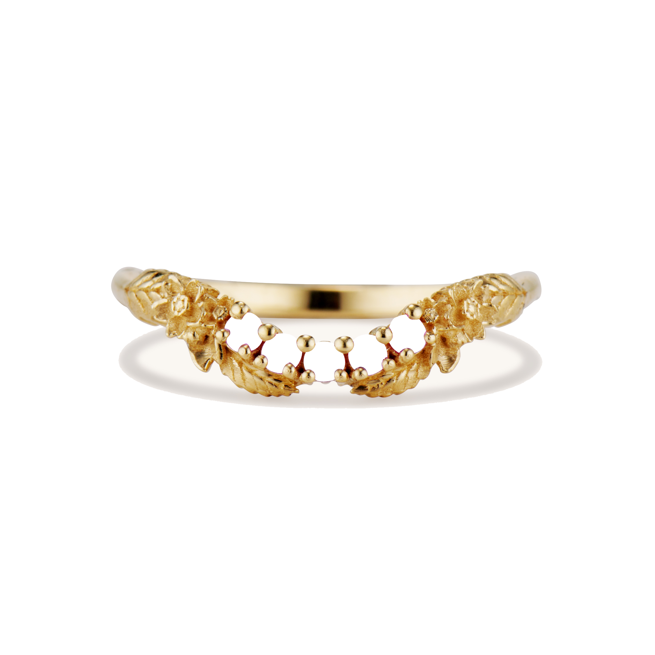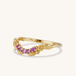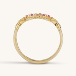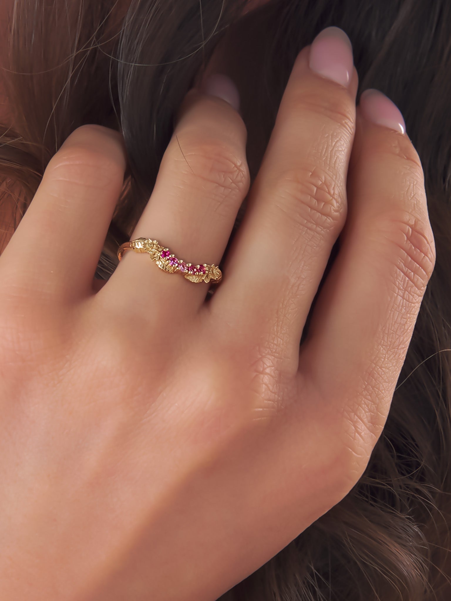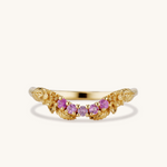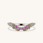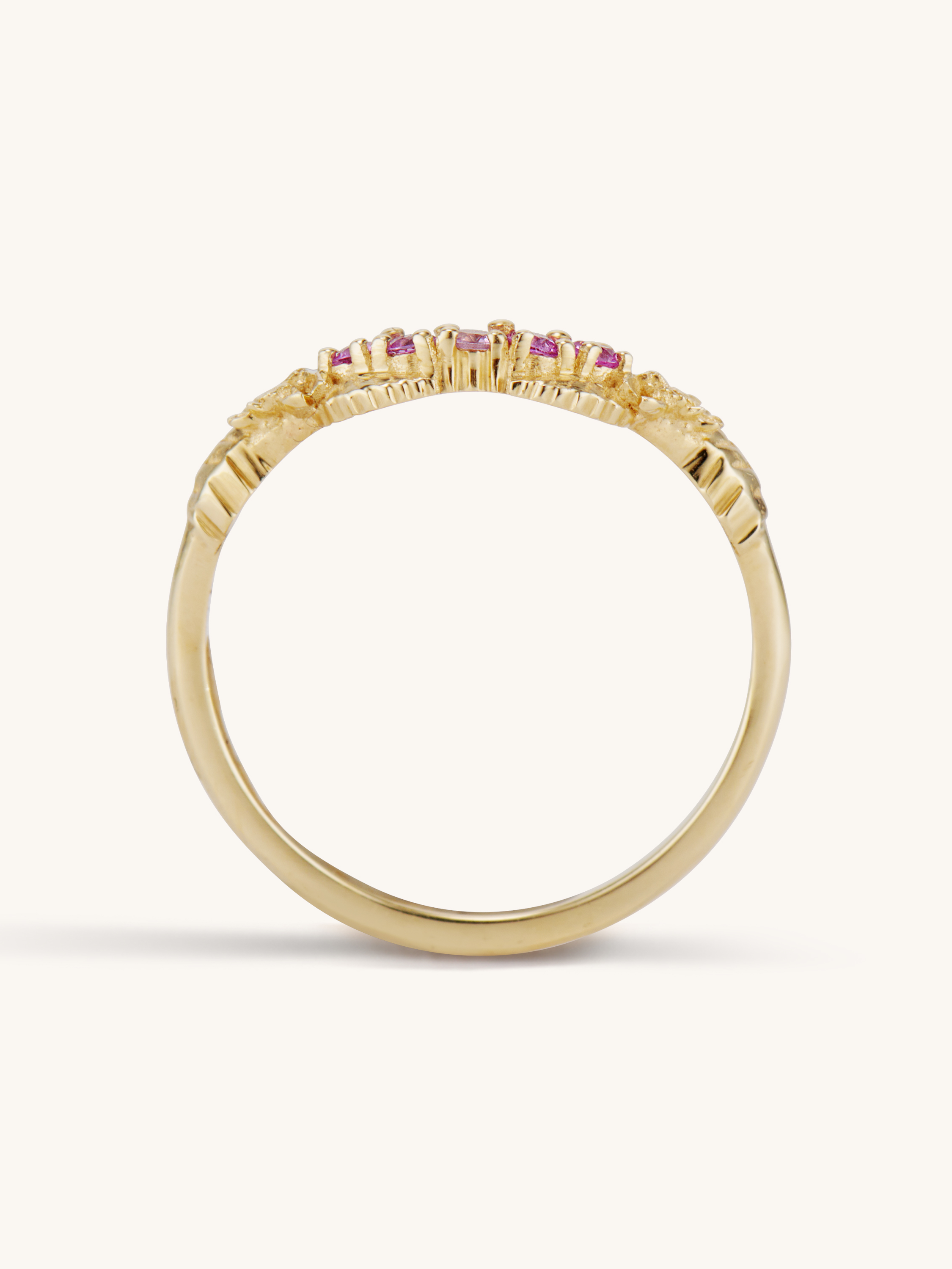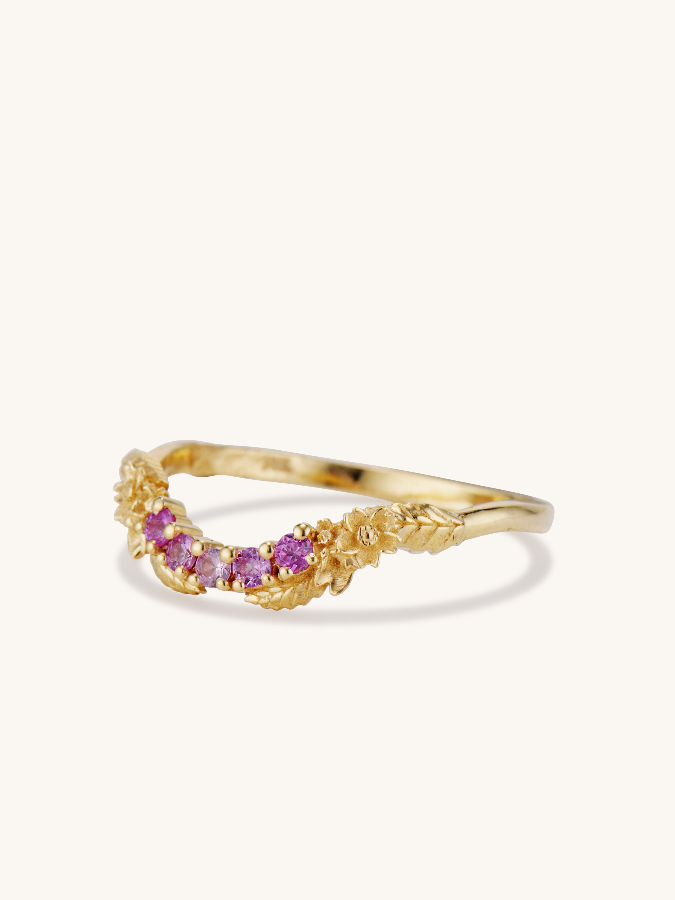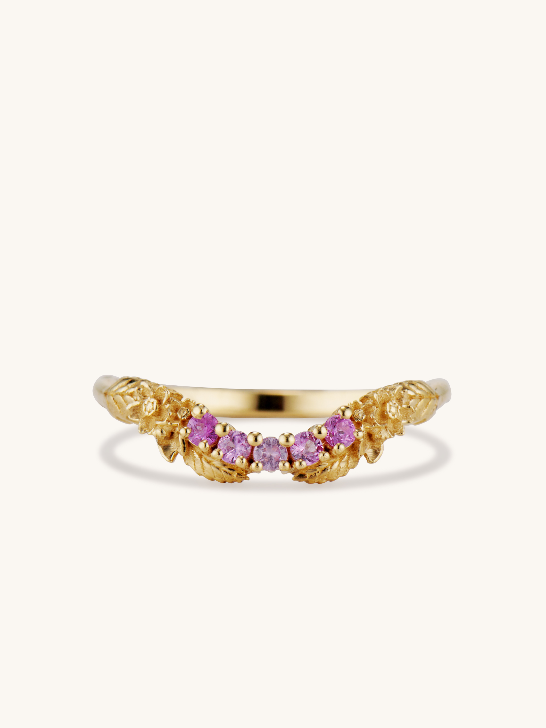 Inspired by the cherry blossom season in the Animal Crossing series, this intricate wedding band features pink sapphires in multiple intensities, reflecting the variety of pinks seen in different types of sakura trees. Surrounding the stones are tiny golden sakura flowers and leaves. The delicate curve of this ring makes it excellent for stacking!