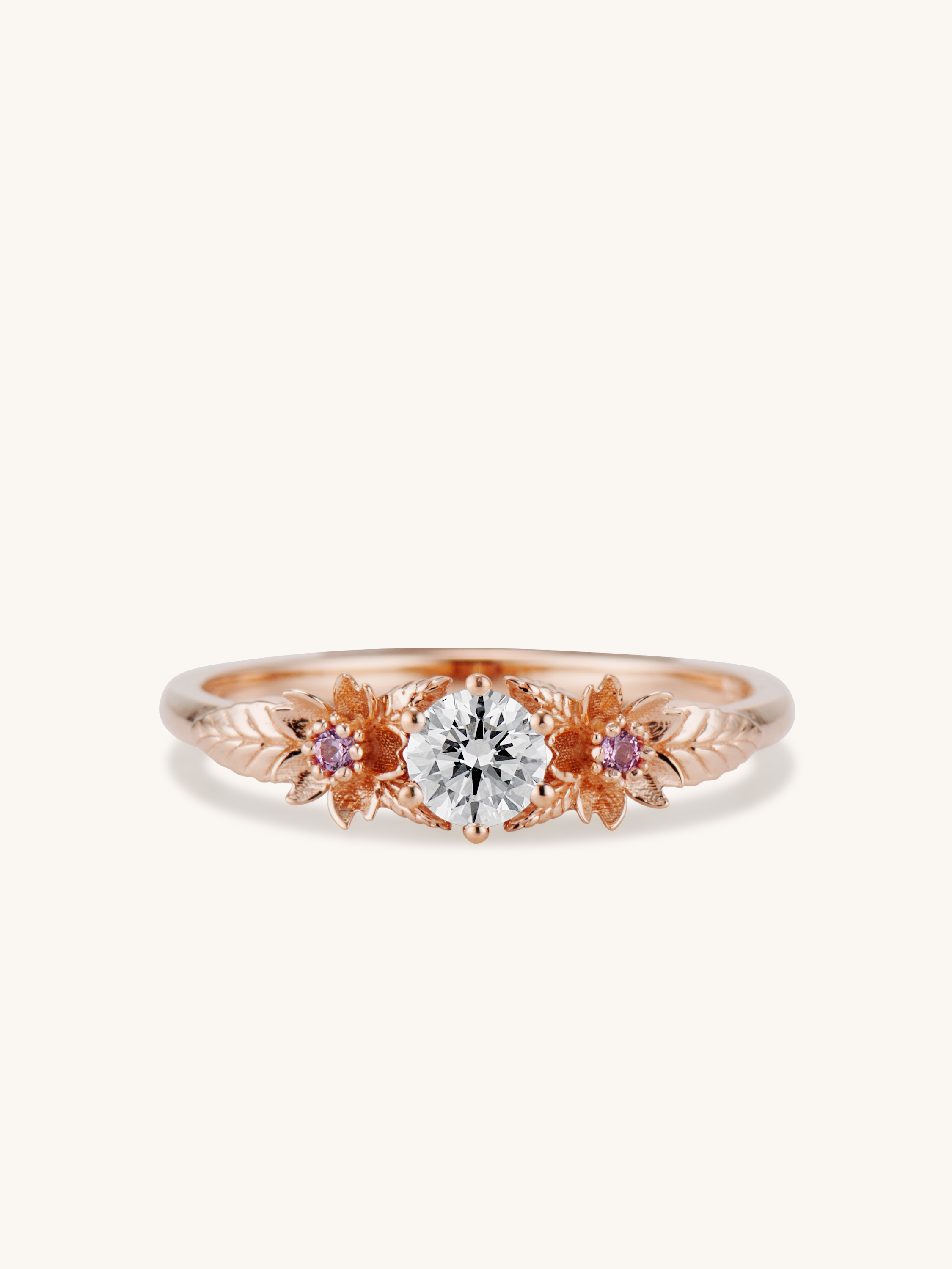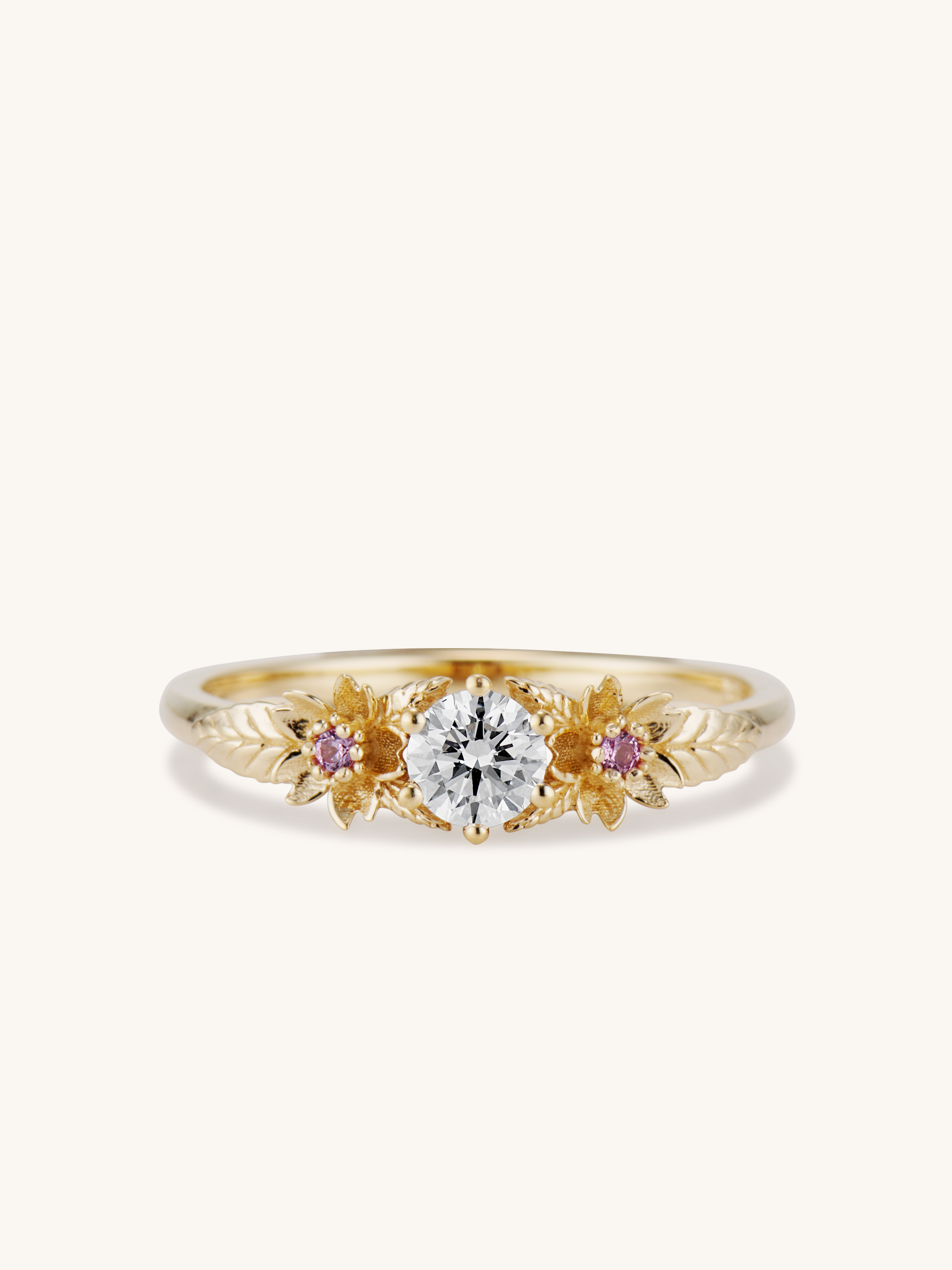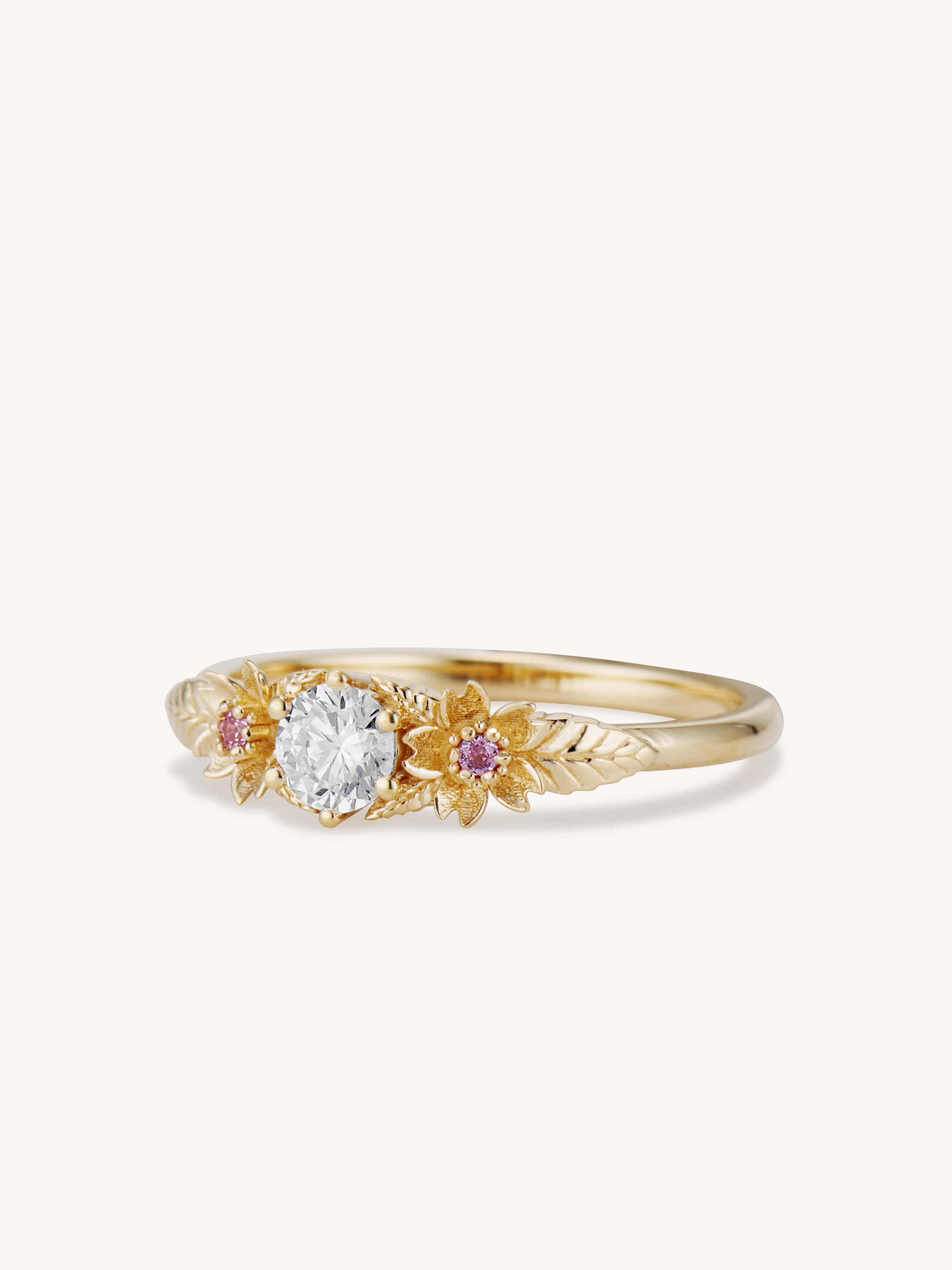 Inspired by the cherry blossom season in the Animal Crossing series, this intricate ring features a round brilliant cut diamond center stone. The perfect size for people who love delicate, minimal jewelry. The diamond is cradled by golden sakura leaves and sakura flowers filed with tiny pink sapphires!