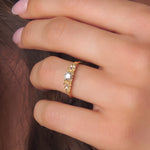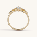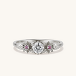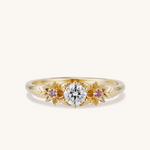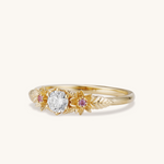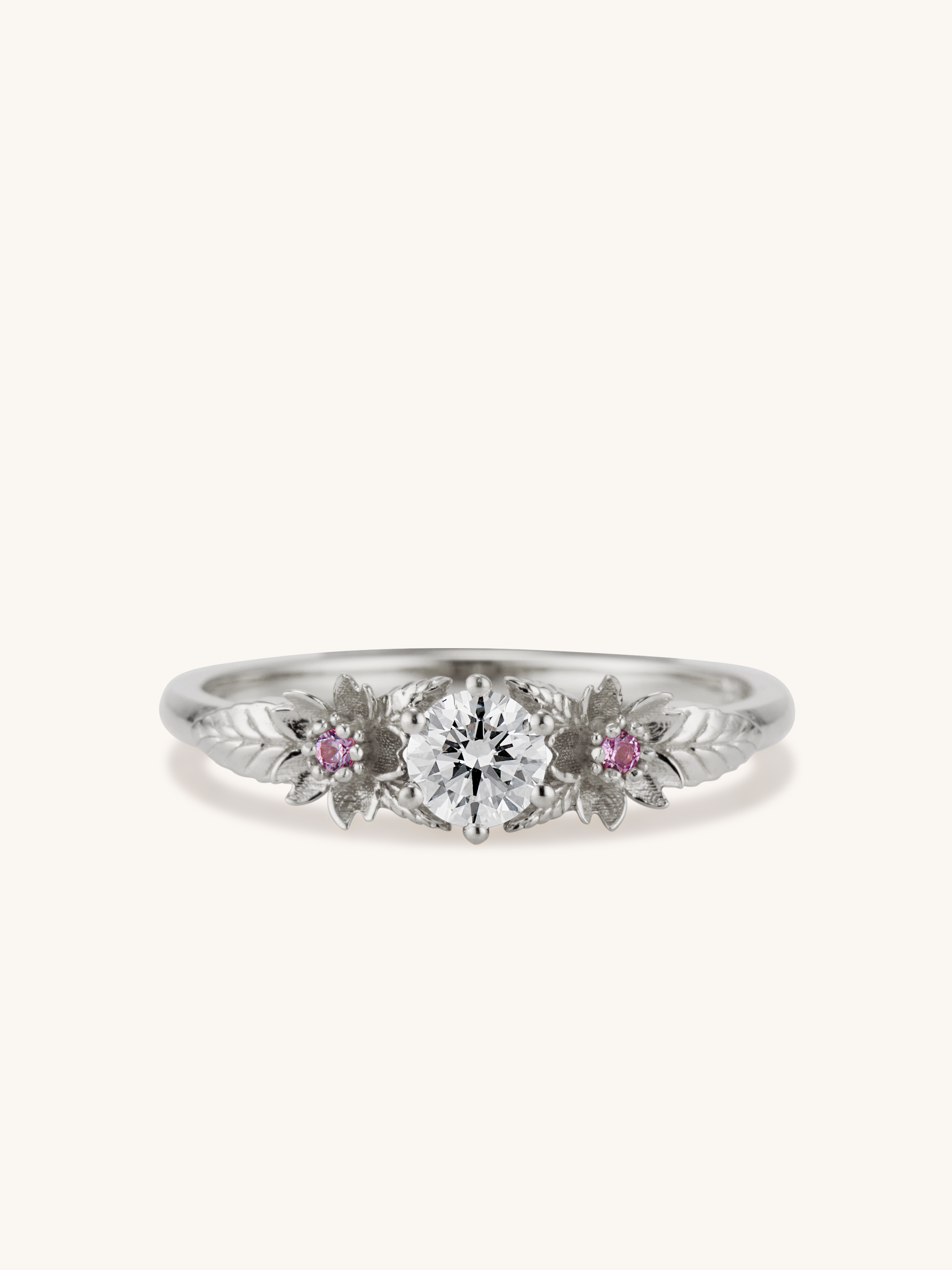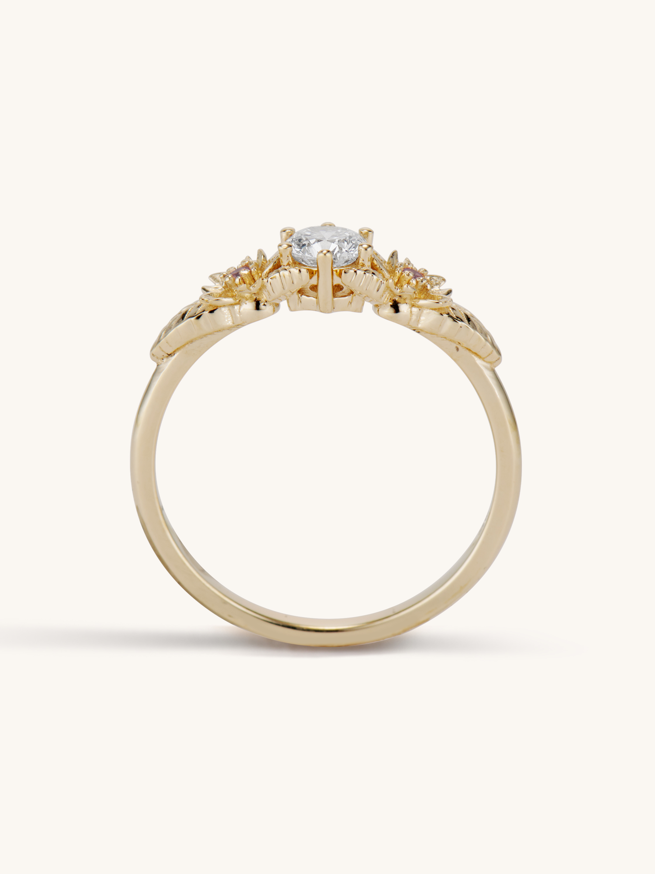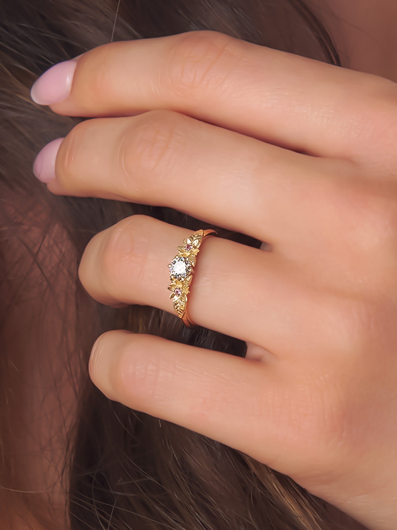 Inspired by the cherry blossom season in the Animal Crossing series, this intricate ring features a round brilliant cut diamond center stone. The perfect size for people who love delicate, minimal jewelry. The diamond is cradled by golden sakura leaves and sakura flowers filed with tiny pink sapphires!