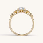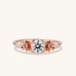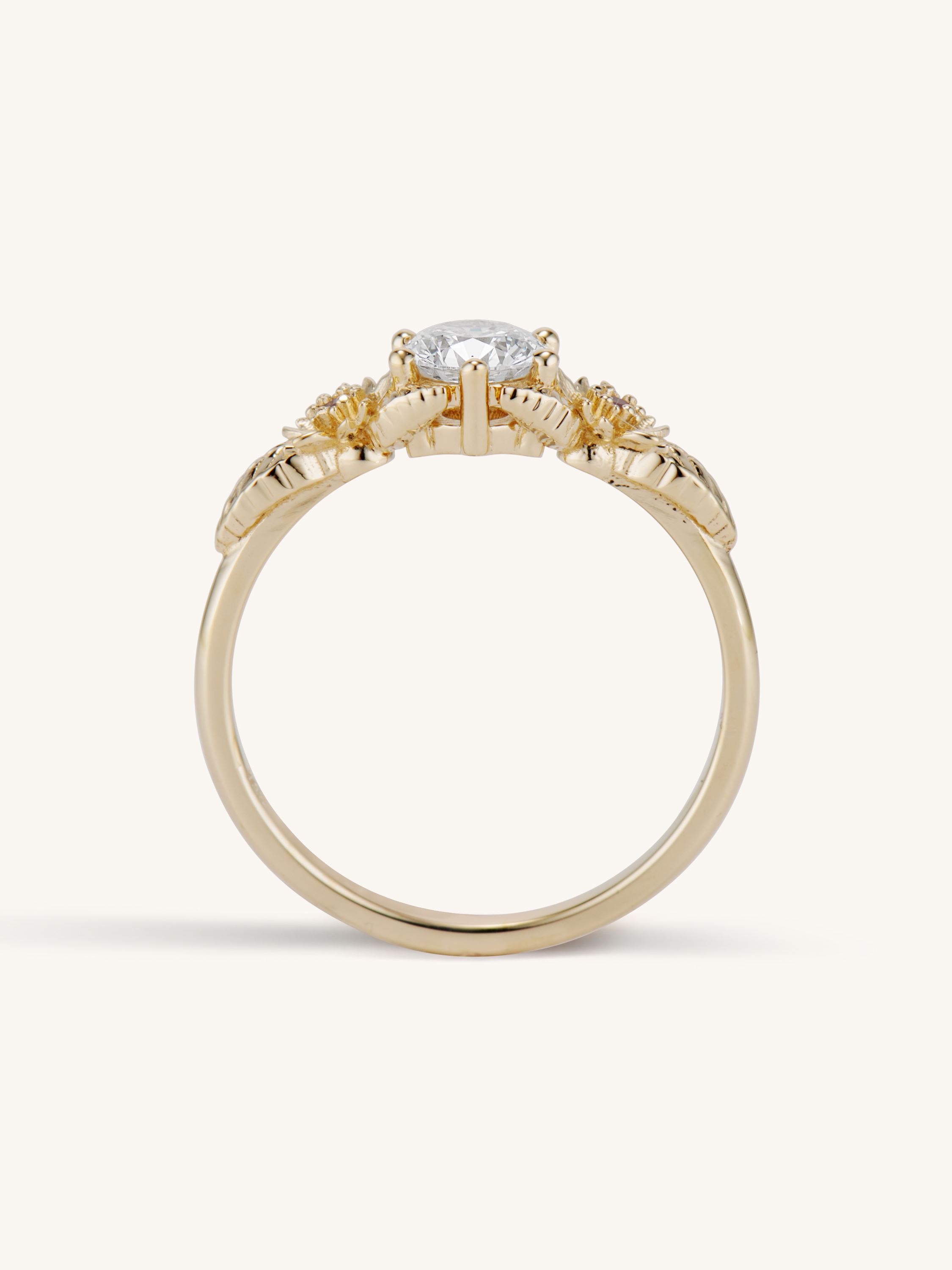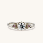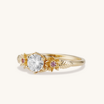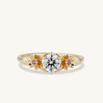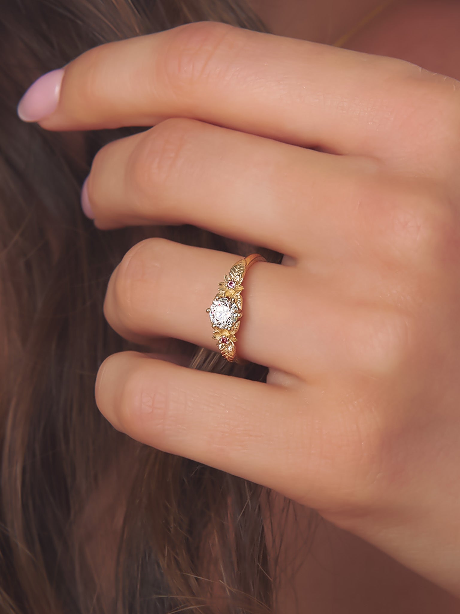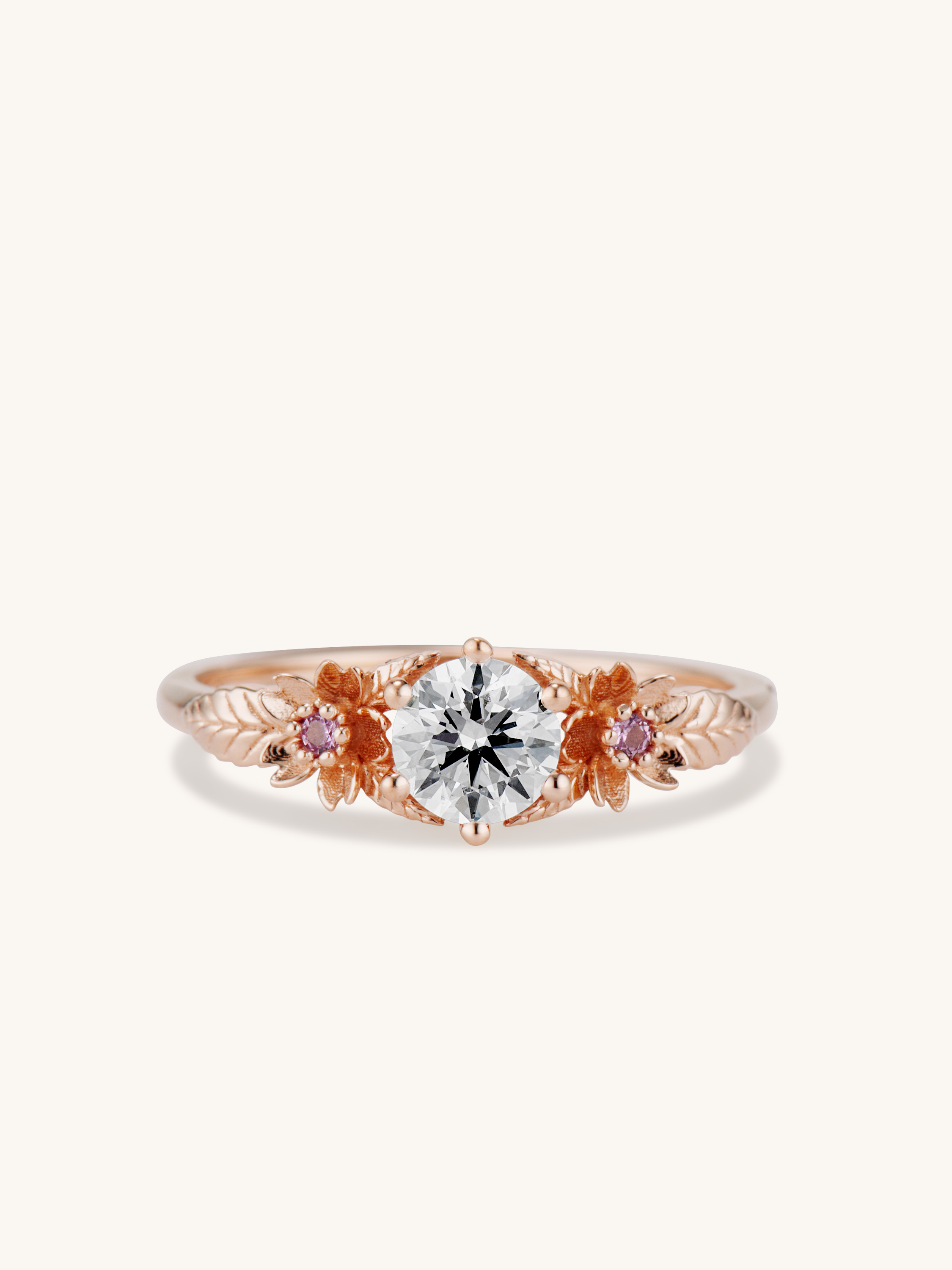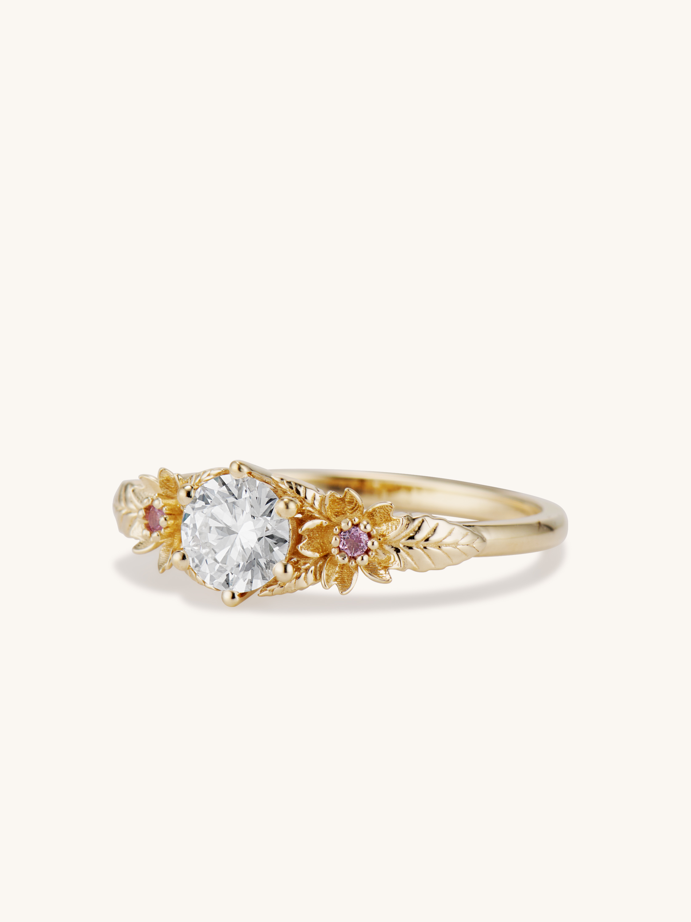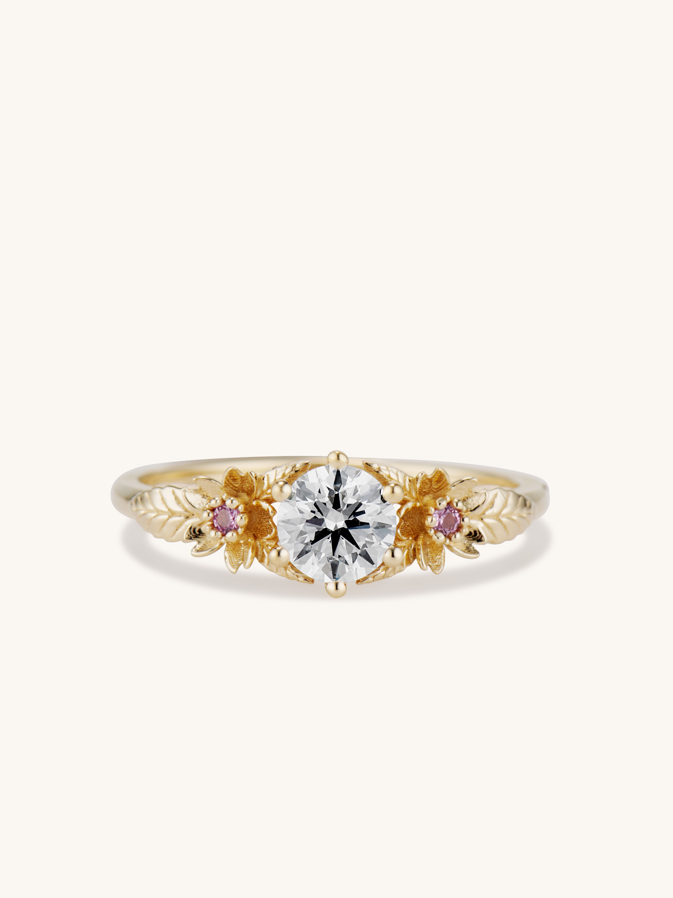 Inspired by the cherry blossom season in the Animal Crossing series, this intricate ring features a 0.50 carat round brilliant cut diamond cradled by golden sakura leaves and sakura flowers filed with tiny pink sapphires!