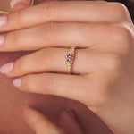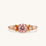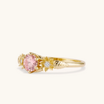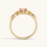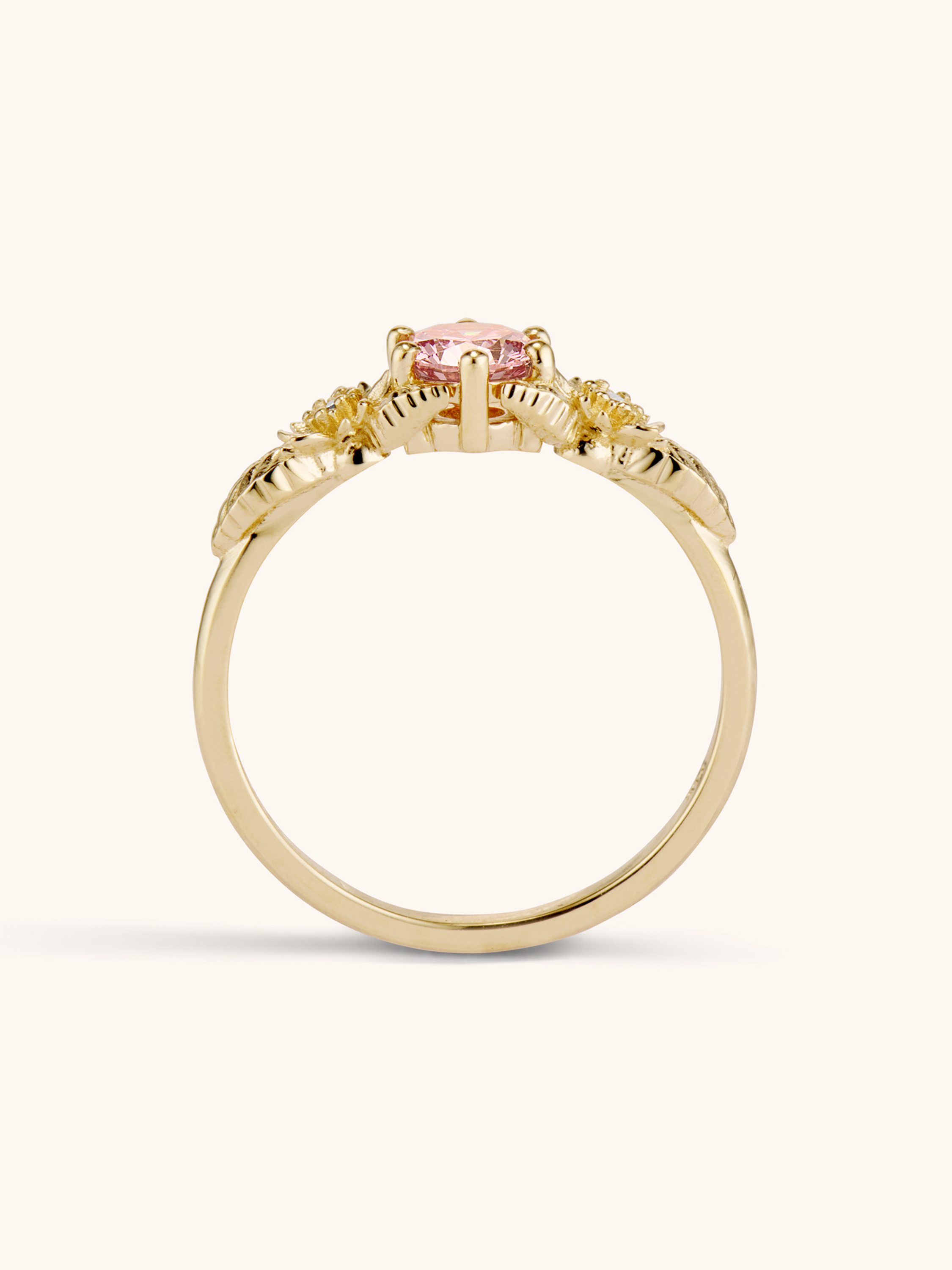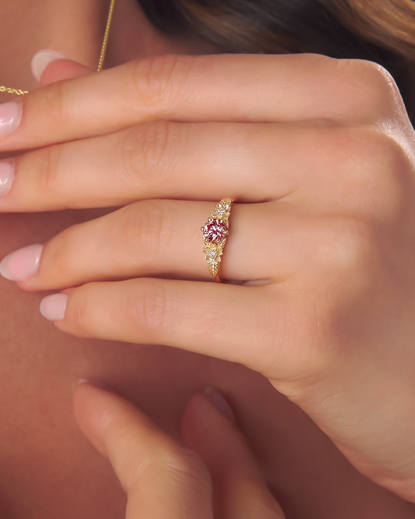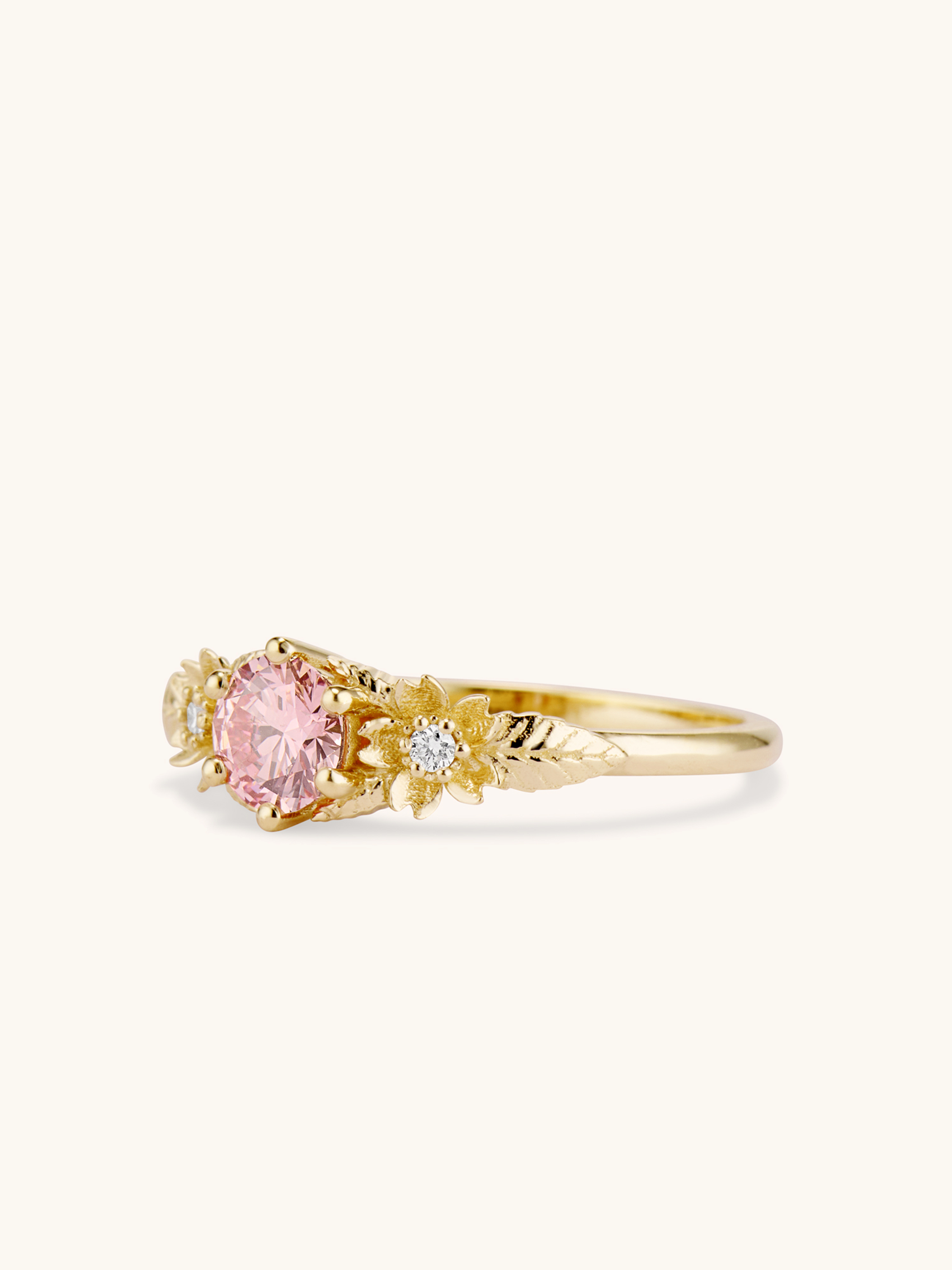 Inspired by the cherry blossom season in the Animal Crossing series, this intricate ring features a 0.50 carat round brilliant cut diamond cradled by golden sakura leaves and sakura flowers filed with tiny pink sapphires!