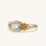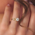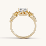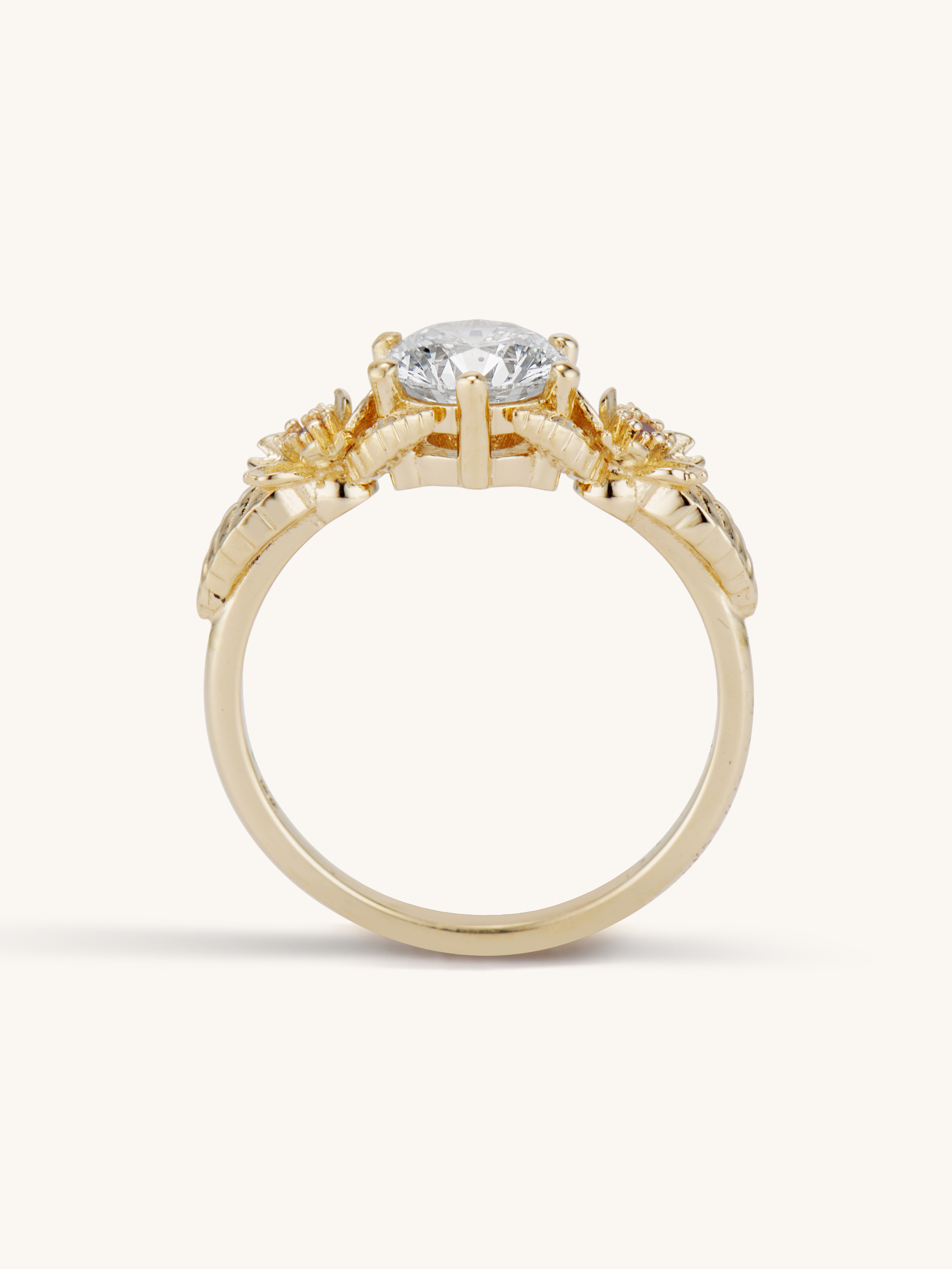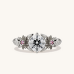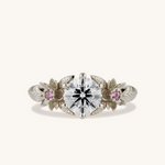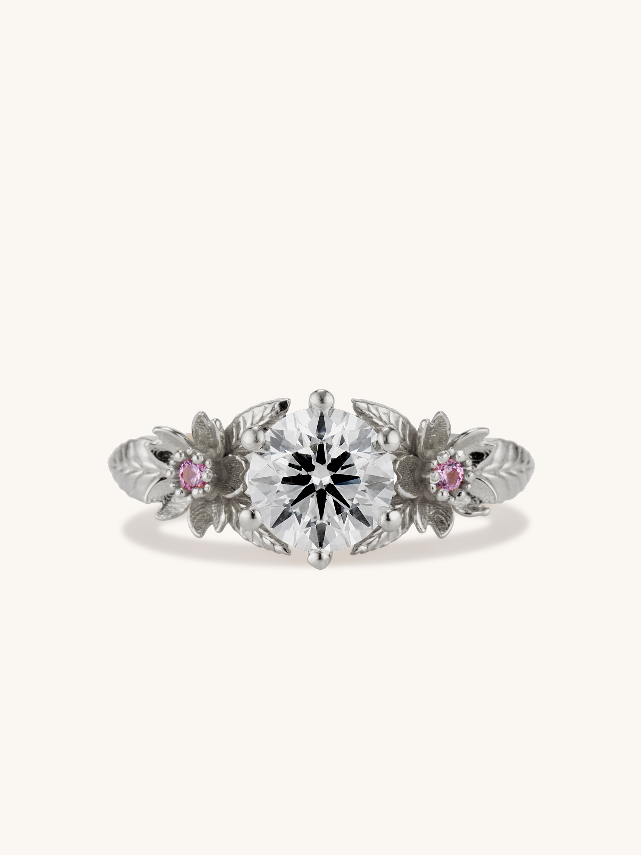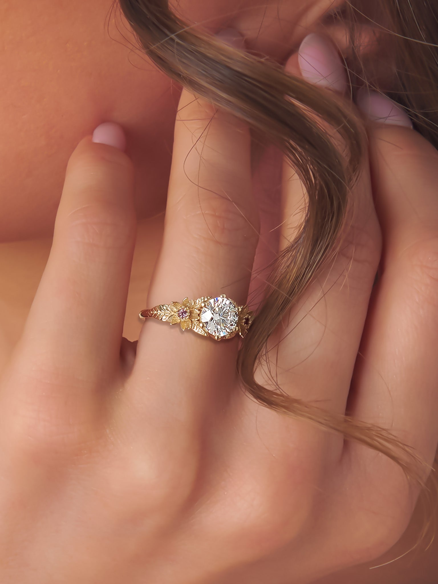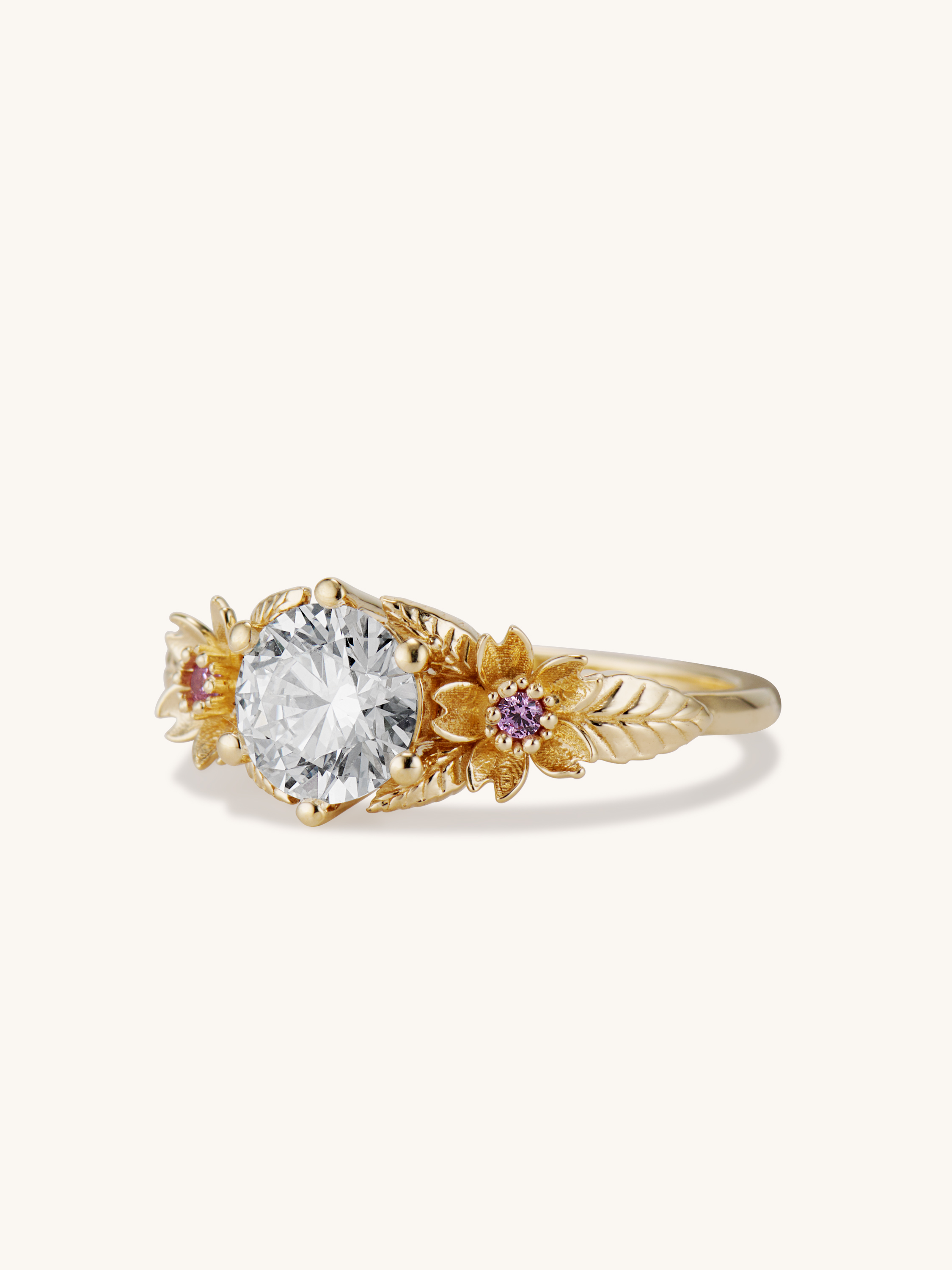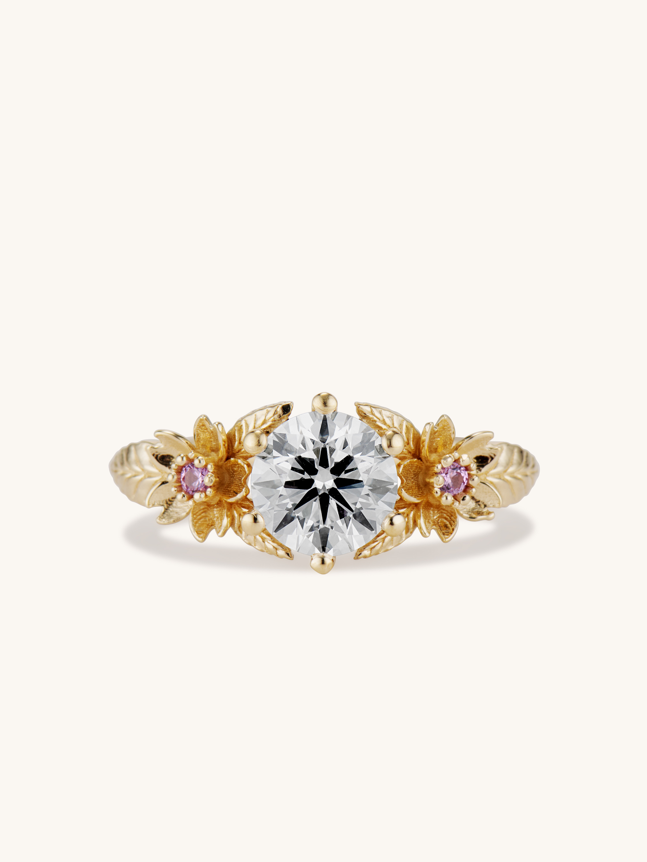 Inspired by the cherry blossom season in the Animal Crossing series, this intricate ring features a 1 carat round brilliant cut diamond cradled by golden sakura leaves and sakura flowers filed with tiny pink sapphires!
