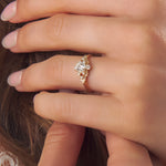 Inspired by creative forces in The Legend of Zelda series, this engagement ring has geeky inspiration and Victorian-era vibes. The glittering diamond center stone is flanked by golden triforces on either side which are blended into the band with decorative scrollwork.