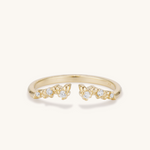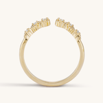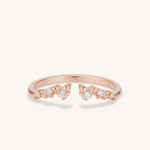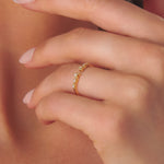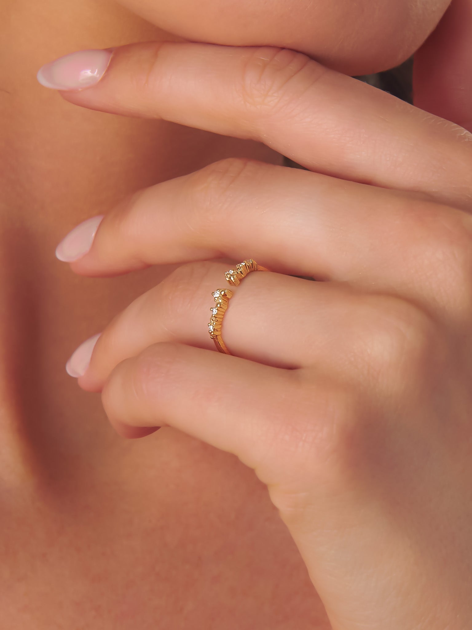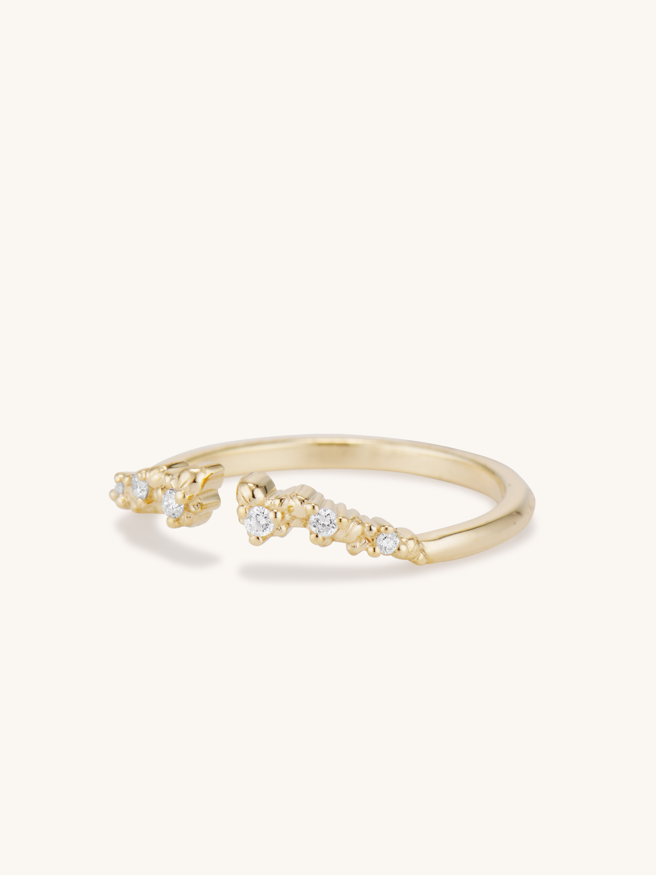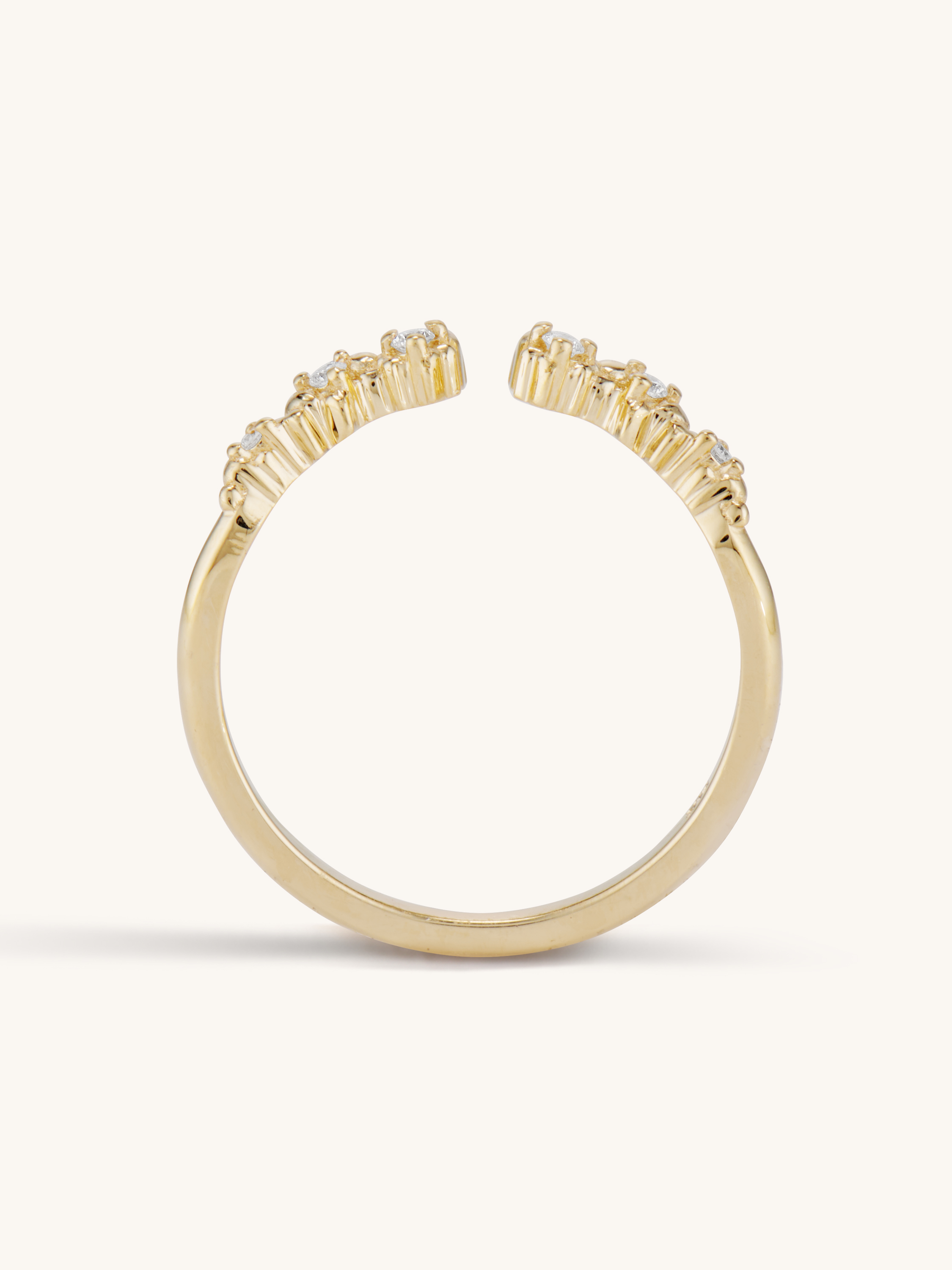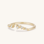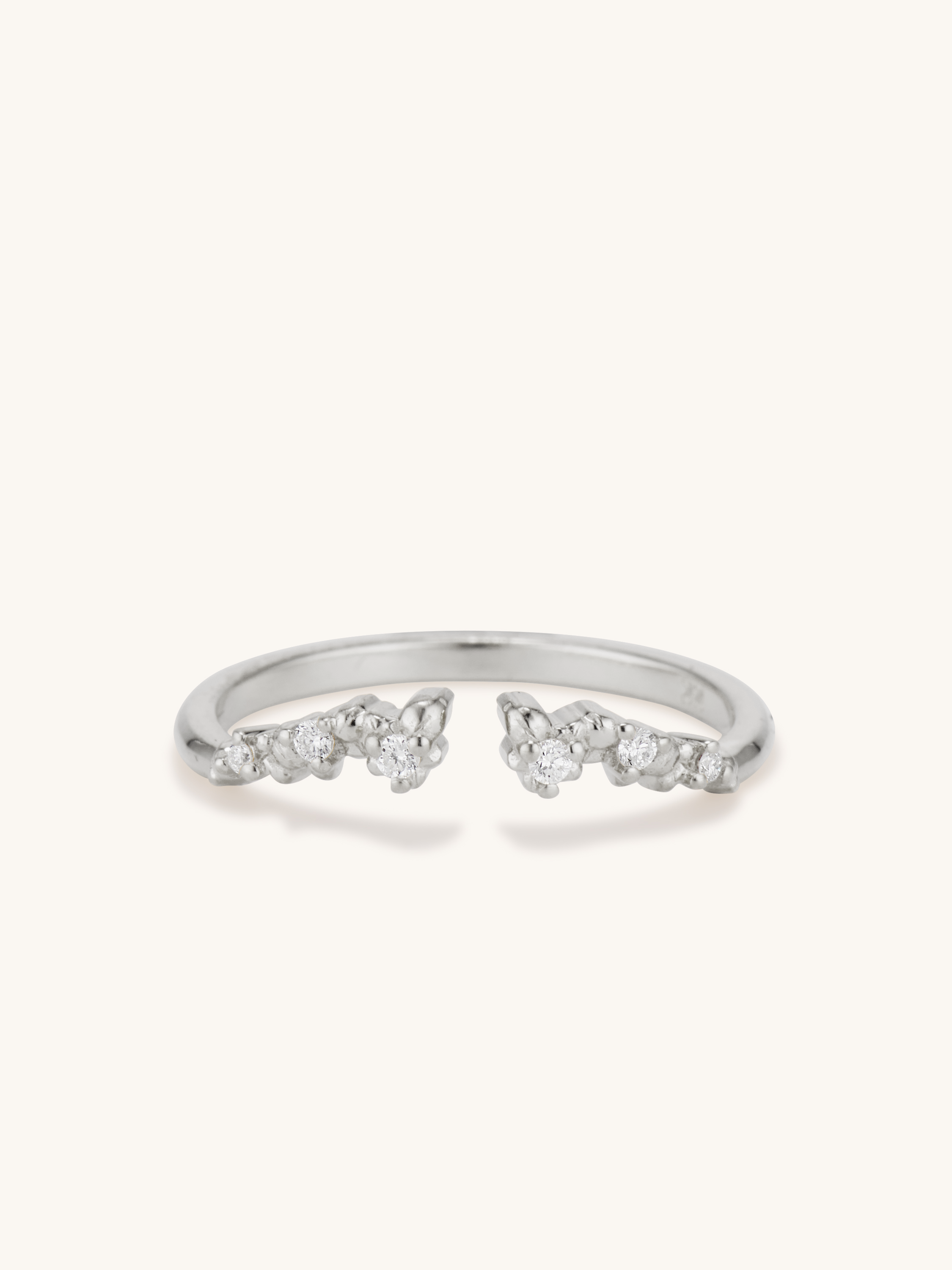 Inspired by the Lost Woods in the Legend of Zelda: Ocarina of Time, this band features six white diamonds nestled between an array of tiny deku seeds. Its shape is designed to fit perfectly with the Spiritual Stone of the Forest Ring, like a little woodland crown.