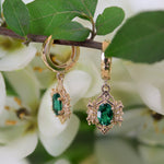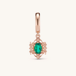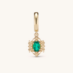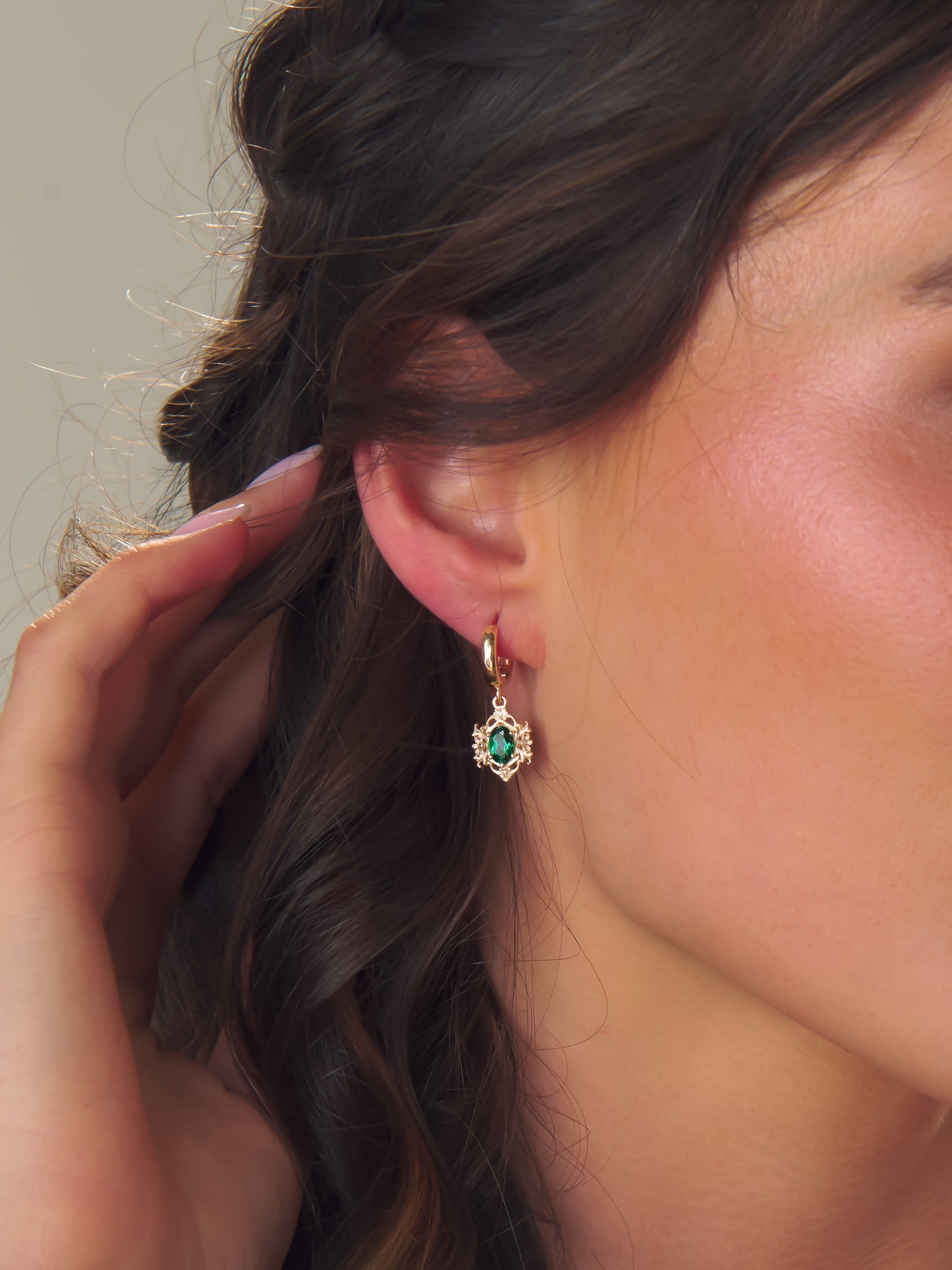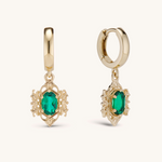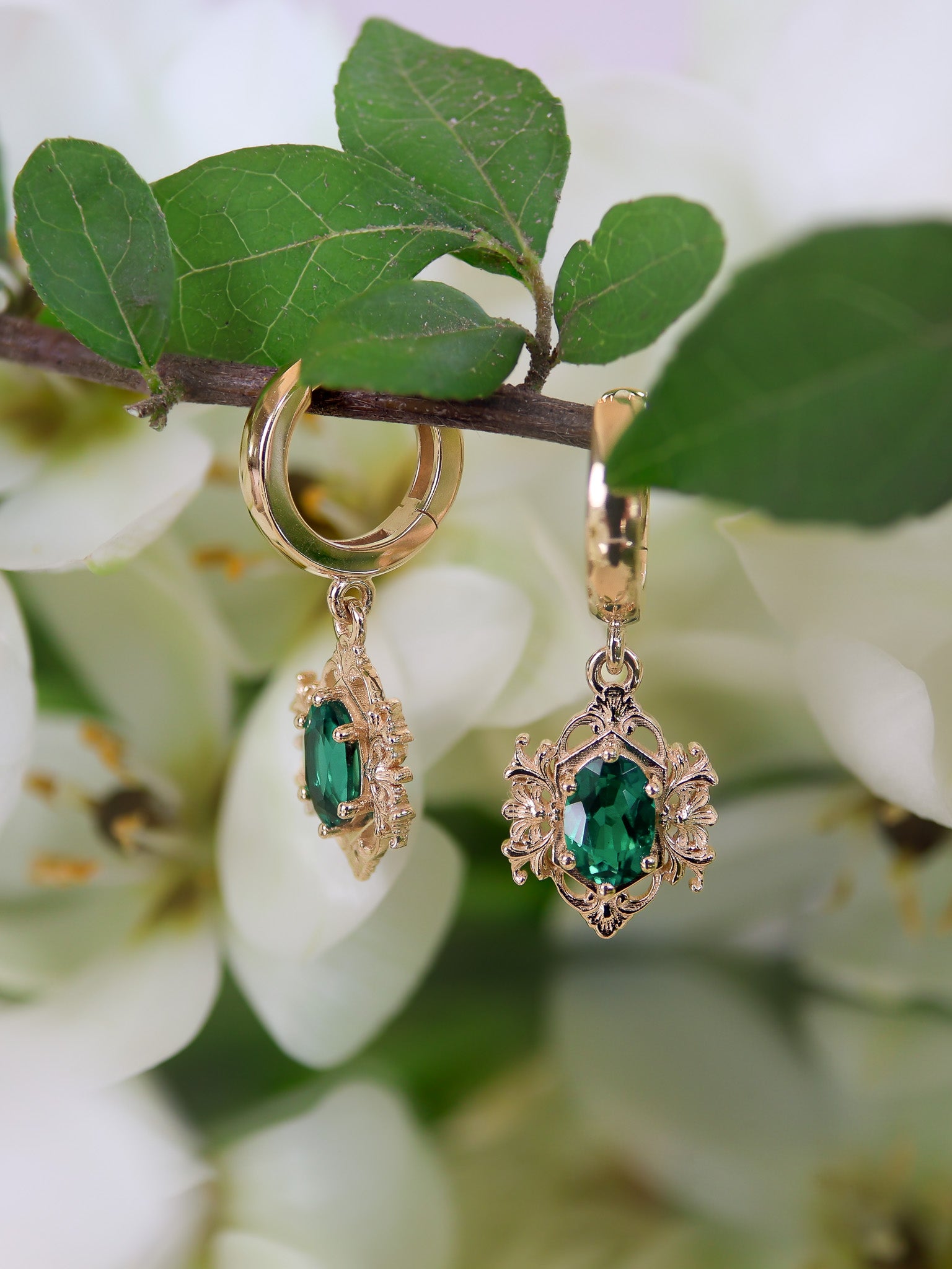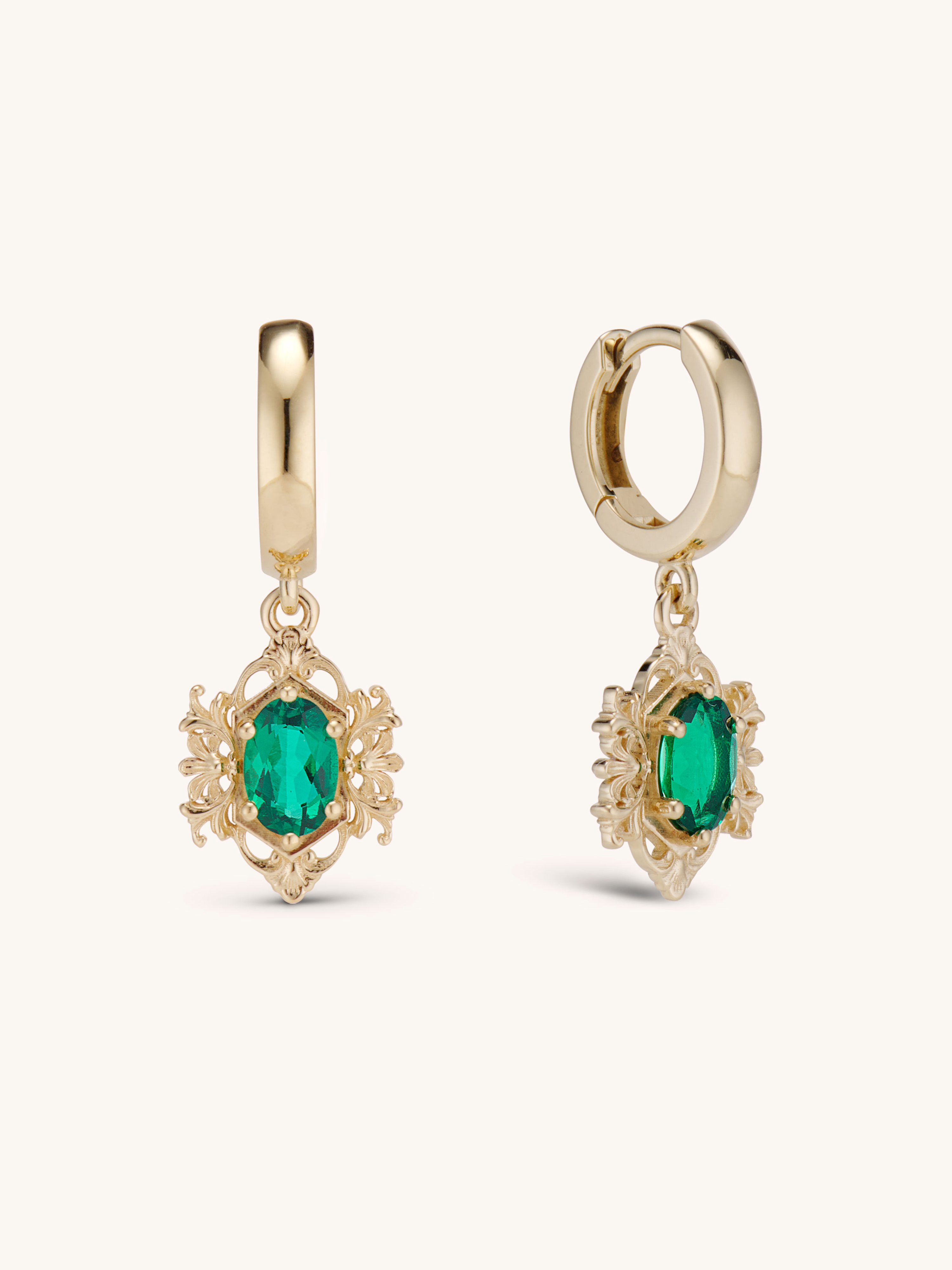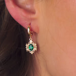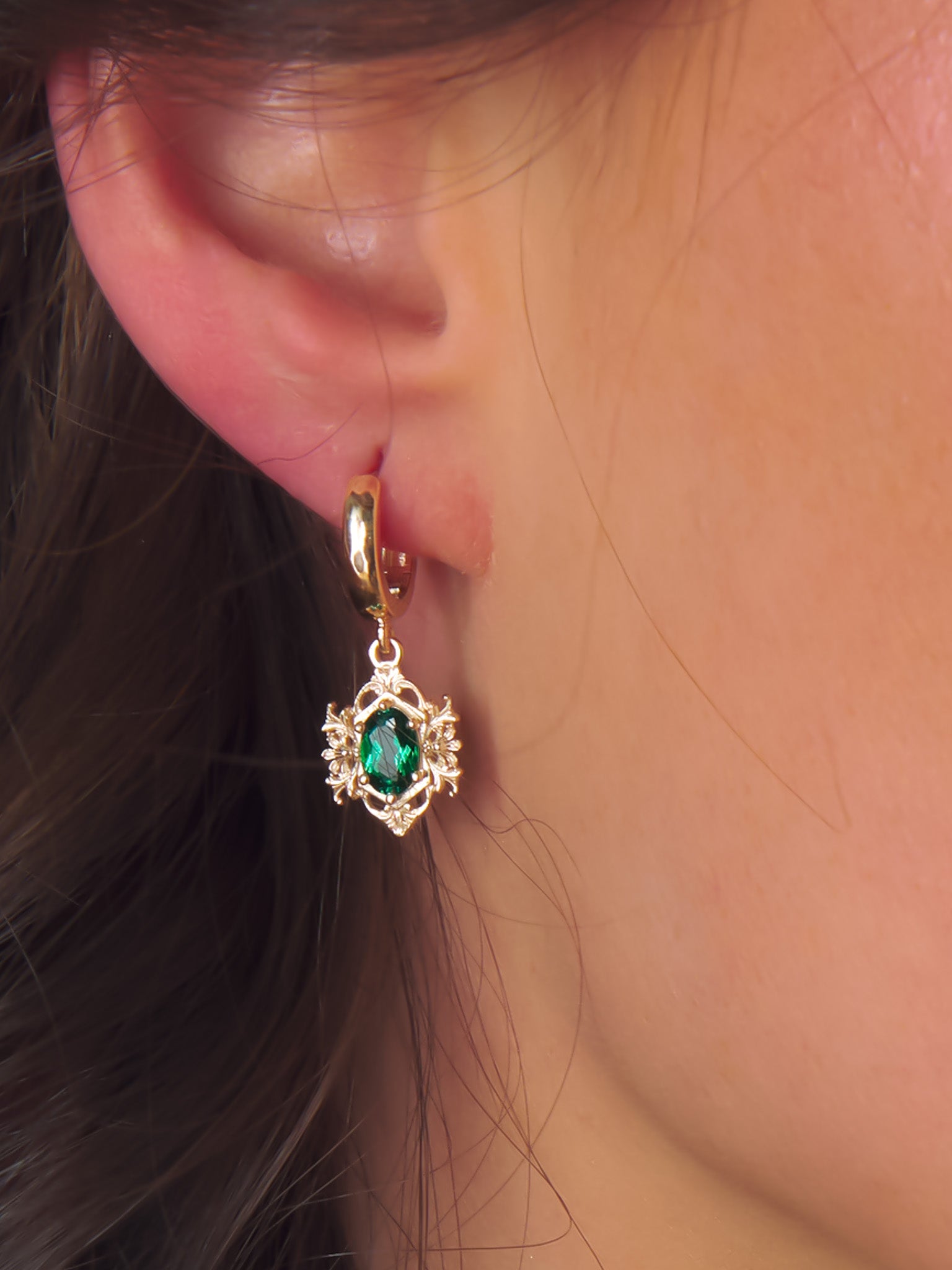 These dangling earrings are based on the rupee charms I created for my bridesmaids on my wedding day. An oval cut diamond sits inside of a rupee-shaped setting, surrounded by intricate golden scrollwork.