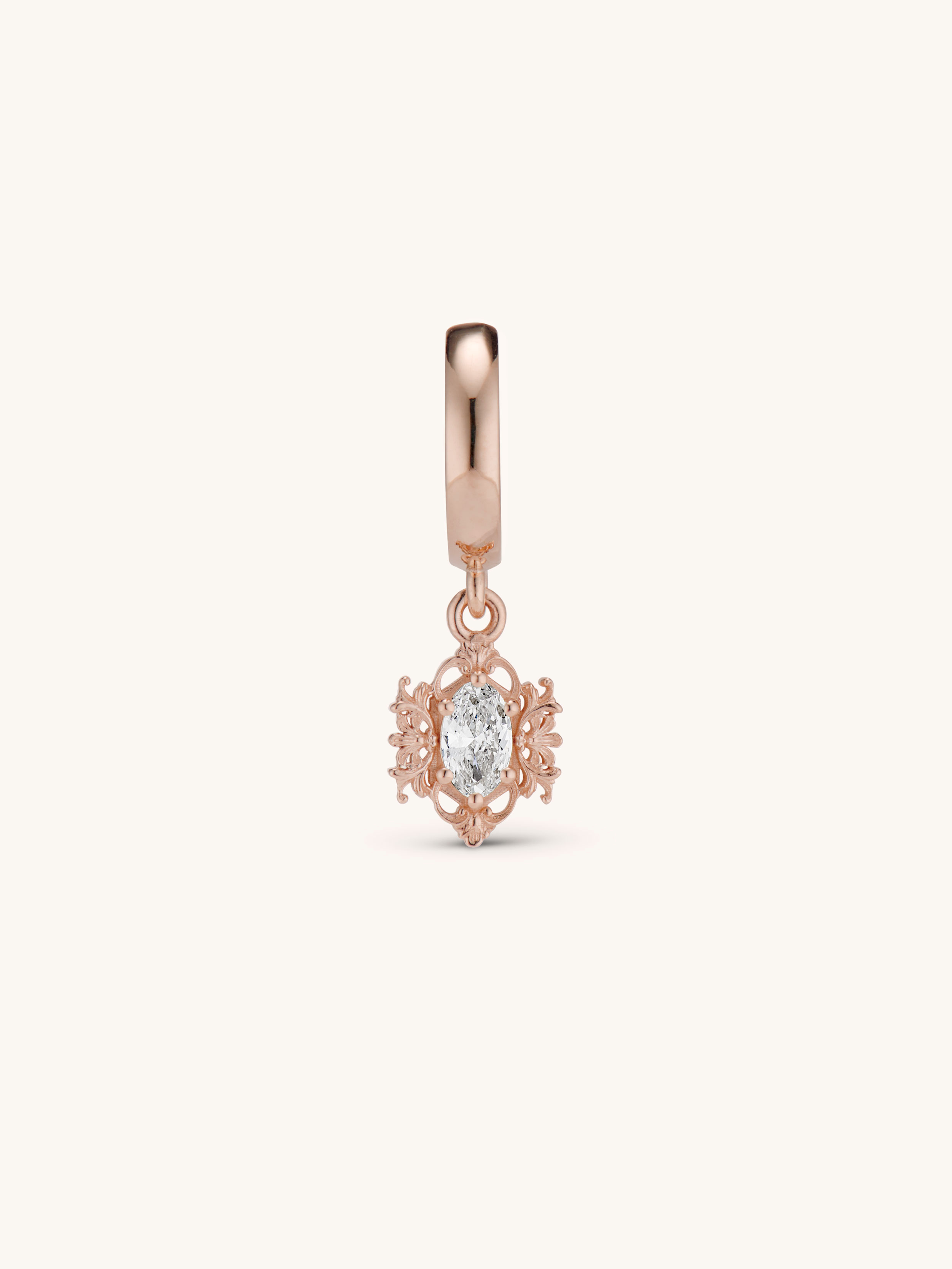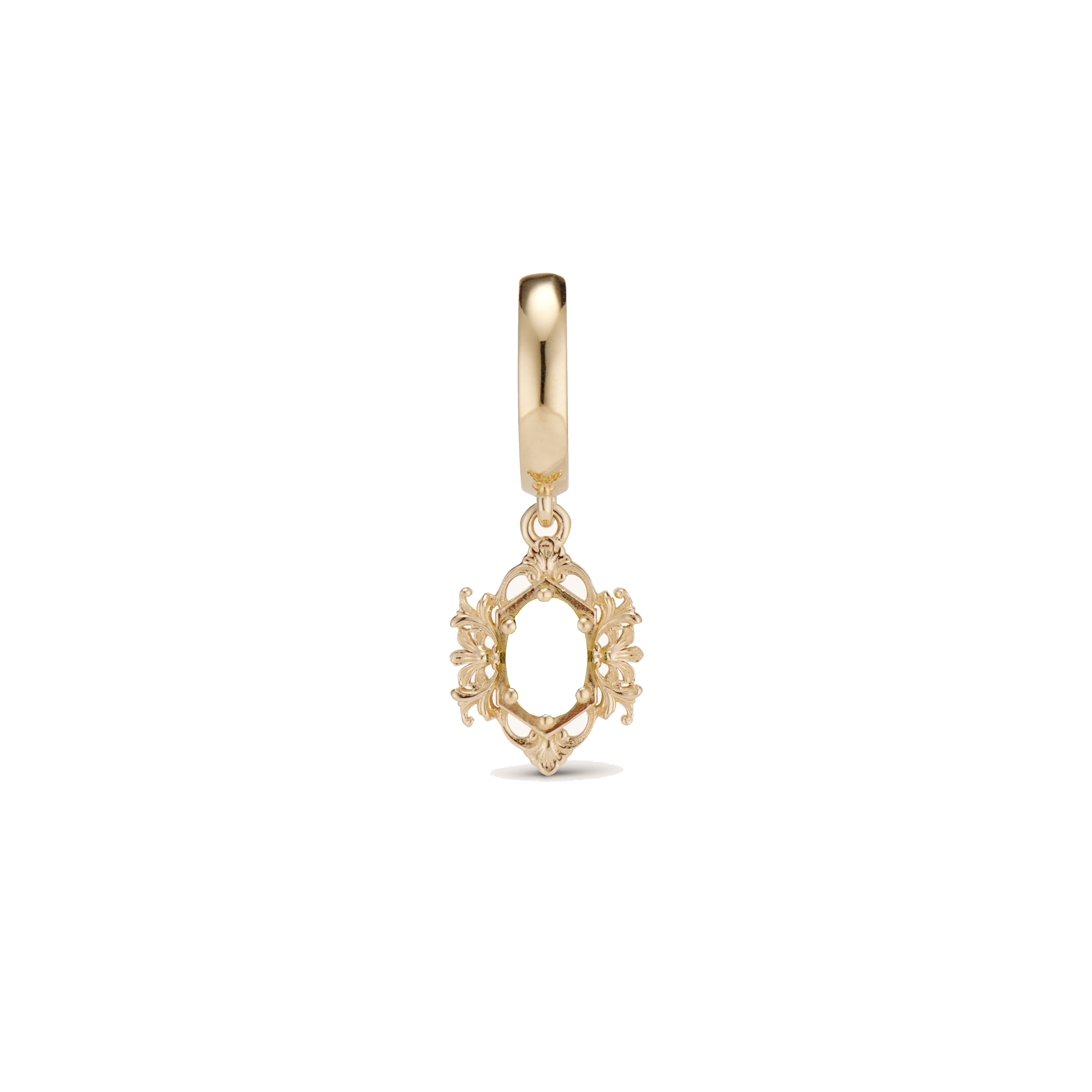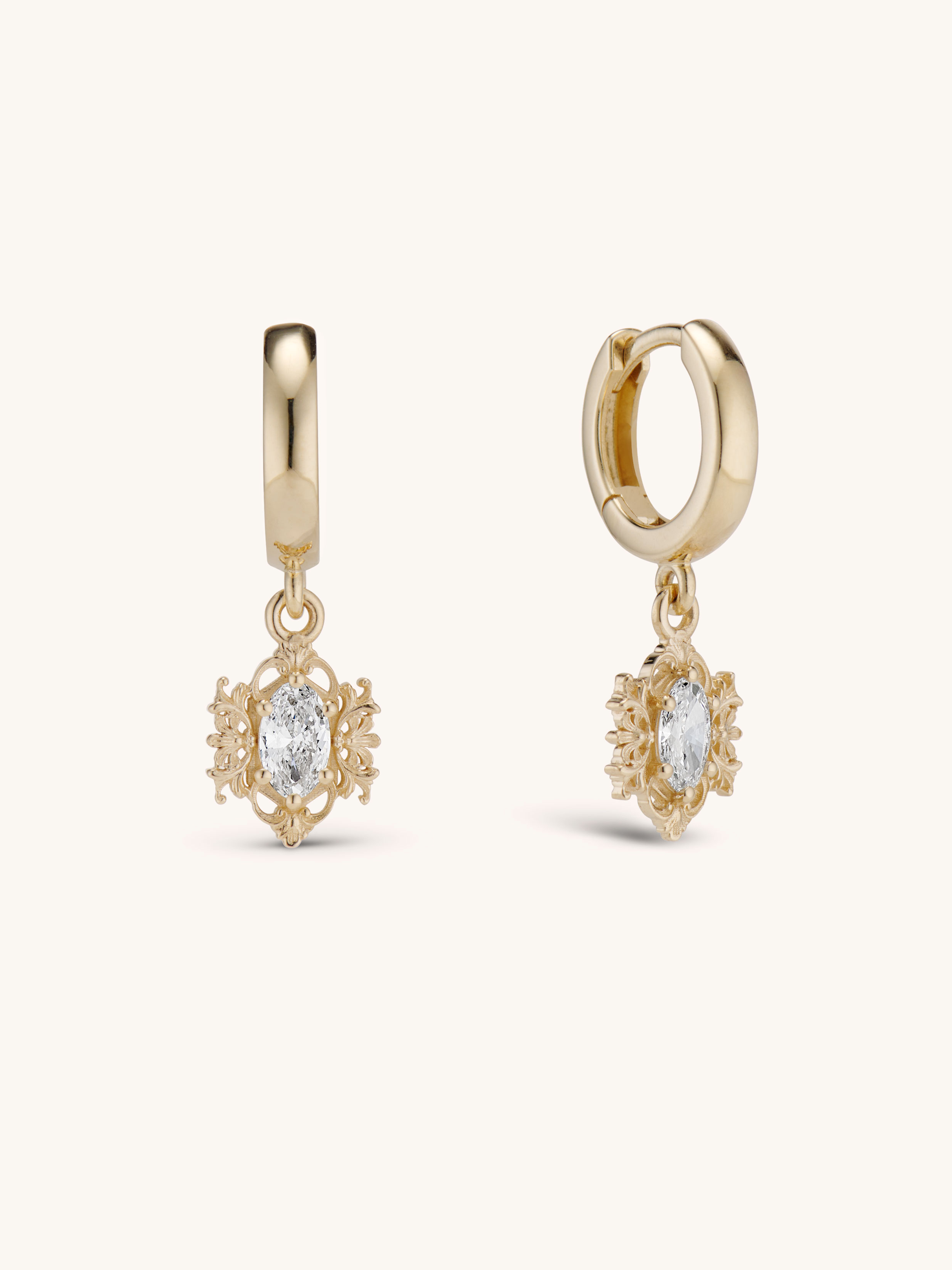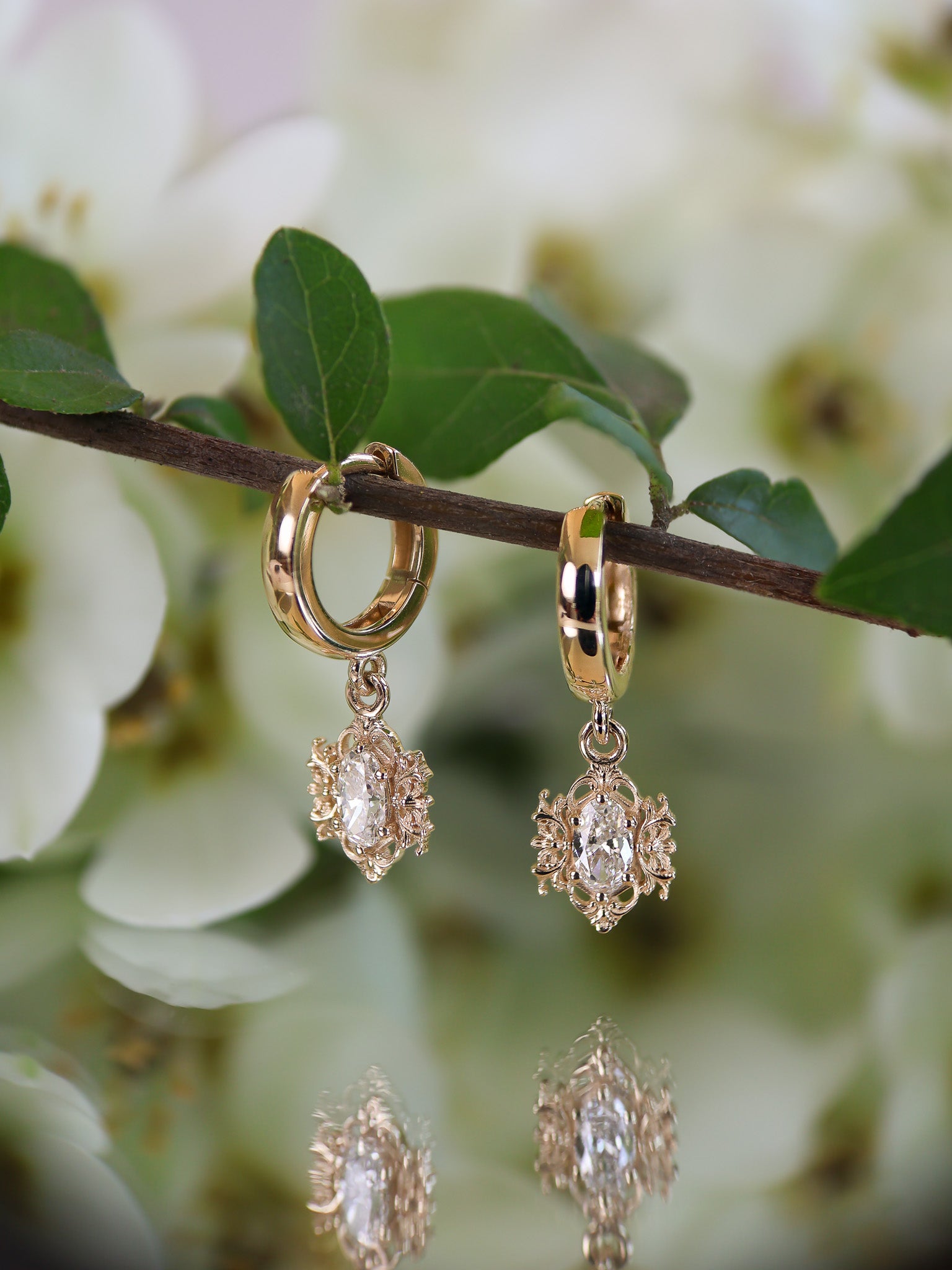 These dangling earrings are based on the rupee charms I created for my bridesmaids on my wedding day. An oval cut diamond sits inside of a rupee-shaped setting, surrounded by intricate golden scrollwork.