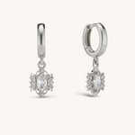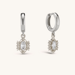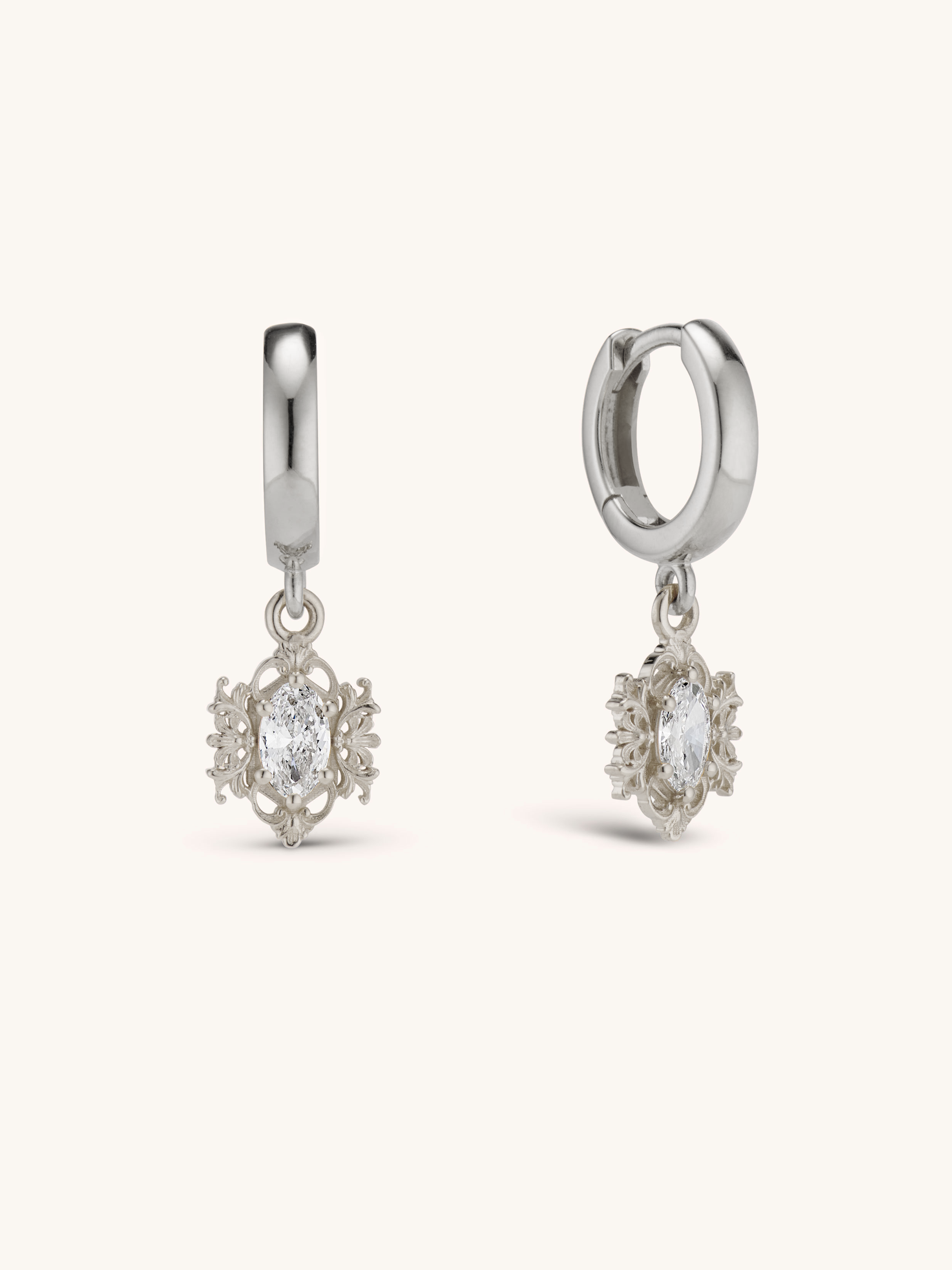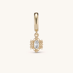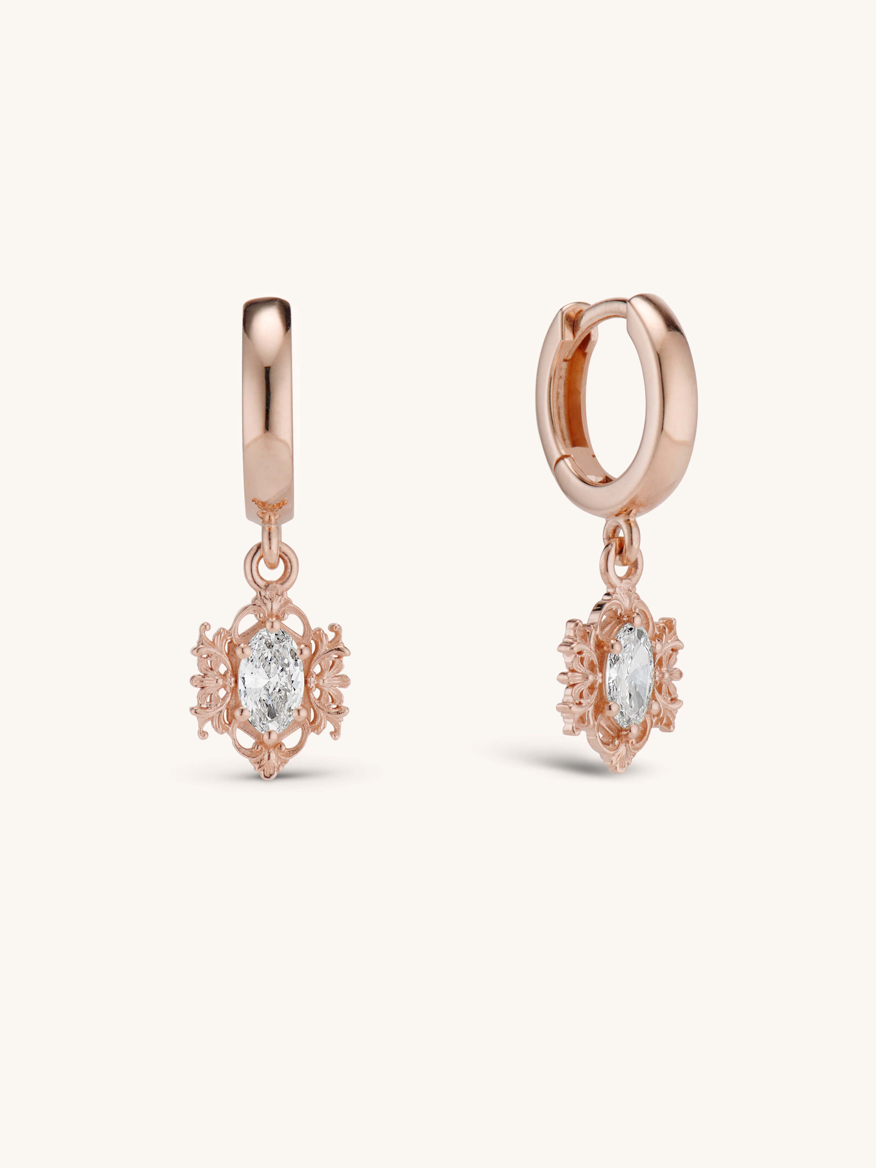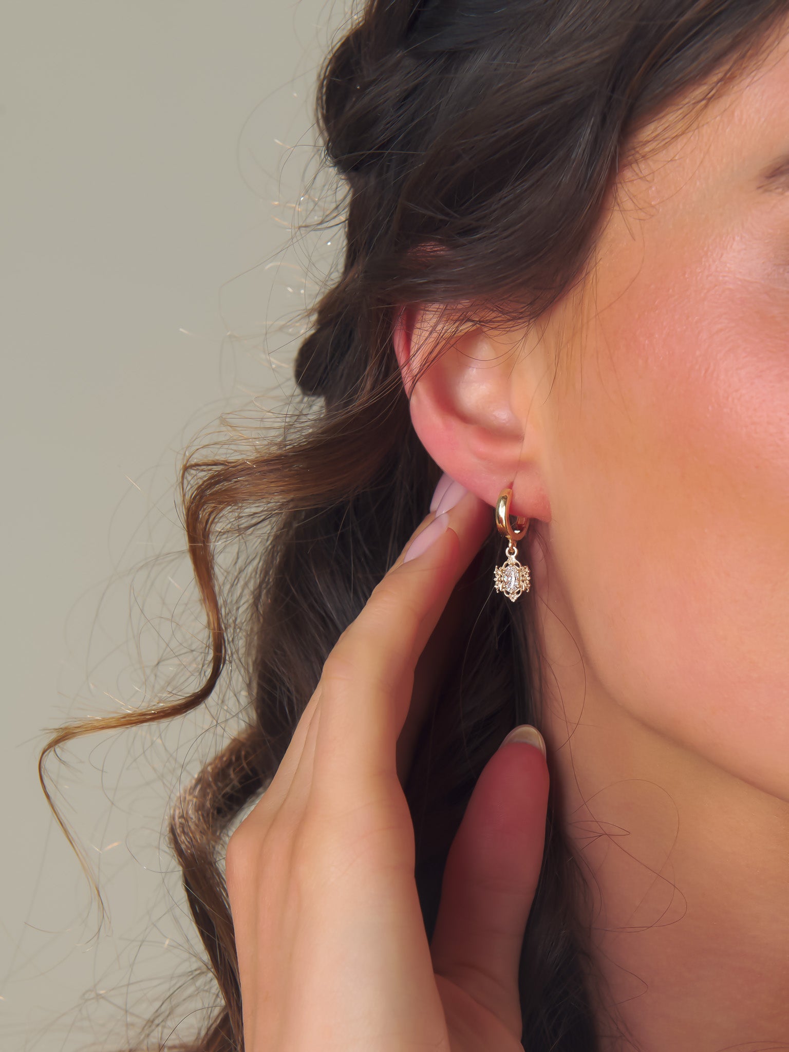 These dangling earrings are based on the rupee charms I created for my bridesmaids on my wedding day. An oval cut diamond sits inside of a rupee-shaped setting, surrounded by intricate golden scrollwork.